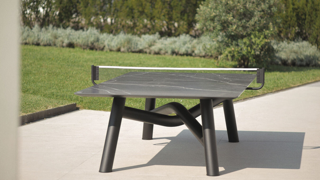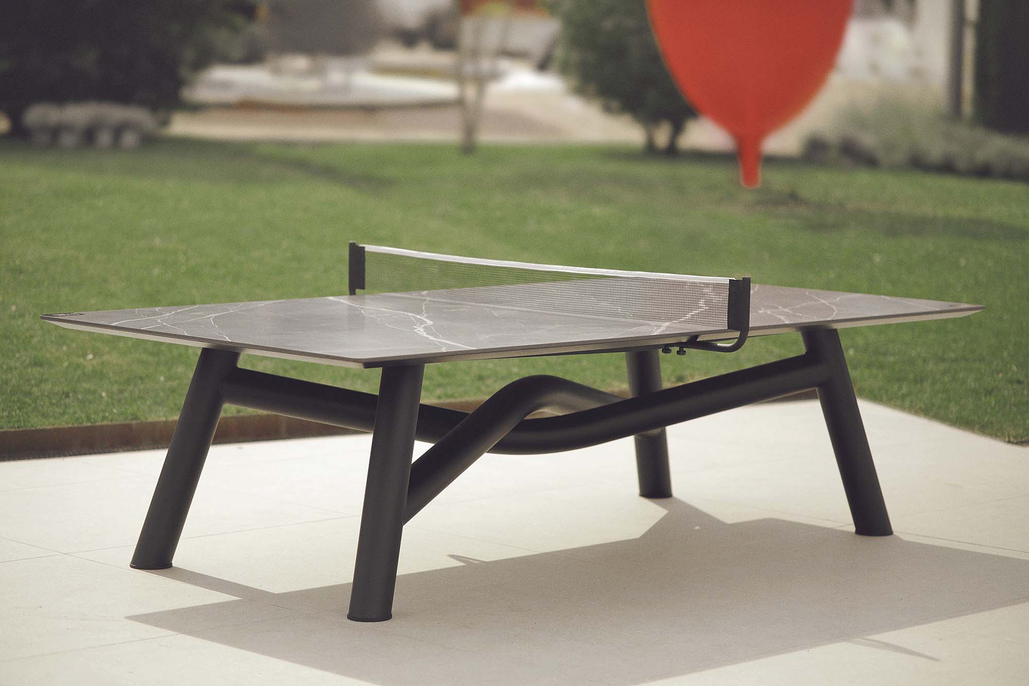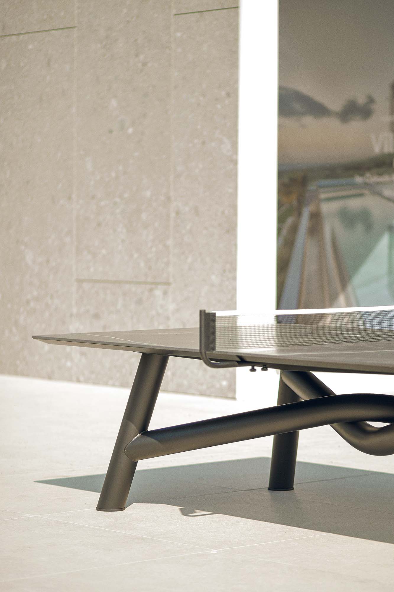 Partitina 0-6 features curved aluminium legs with a 12-centimetre diameter, with a shape inspired by the trajectory of the ball on the table top: a hypnotic trail from one side of the table to the other. The sculptural red or black base contrasts with the sleek, elegant top in white or black marble-effect porcelain stoneware. The combination of top and base colours creates different aesthetics: from the strict and minimal total black to the more cheerful white and red. The reference to the game is metaphorical and transforms into an unusual and sophisticated design that can also bring a smile.