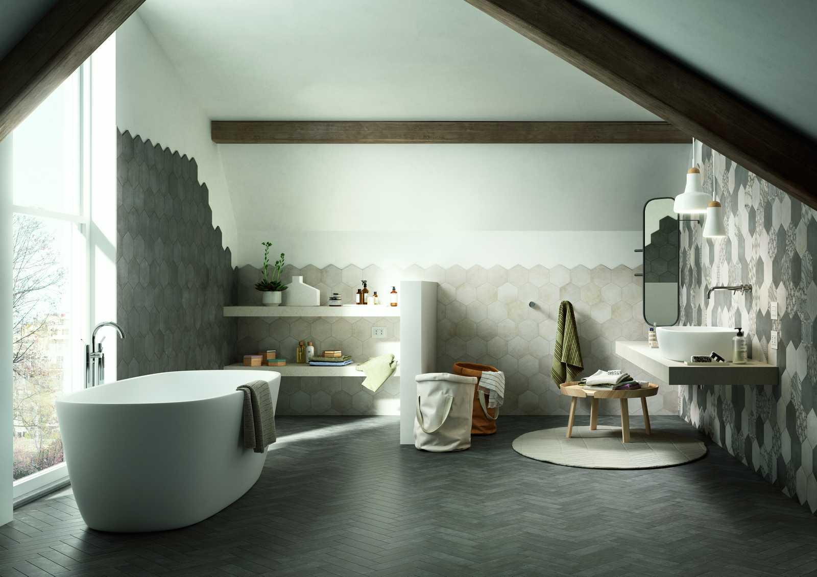 One option for a modern bathroom – with a mood that is minimal but not cold – is to cover the walls with an alternation of monochrome and decorated tiles. Go for hexagon tiles in neutral grey and beige shades: very sophisticated.