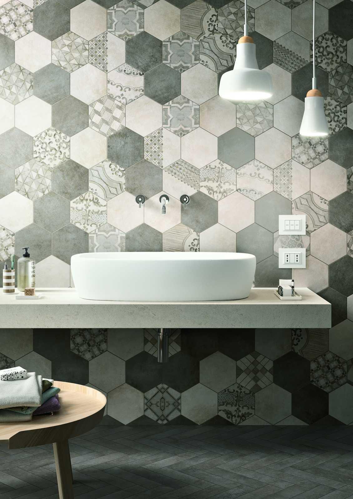 Bathroom decoration ideas with cement-effect hexagon tiles