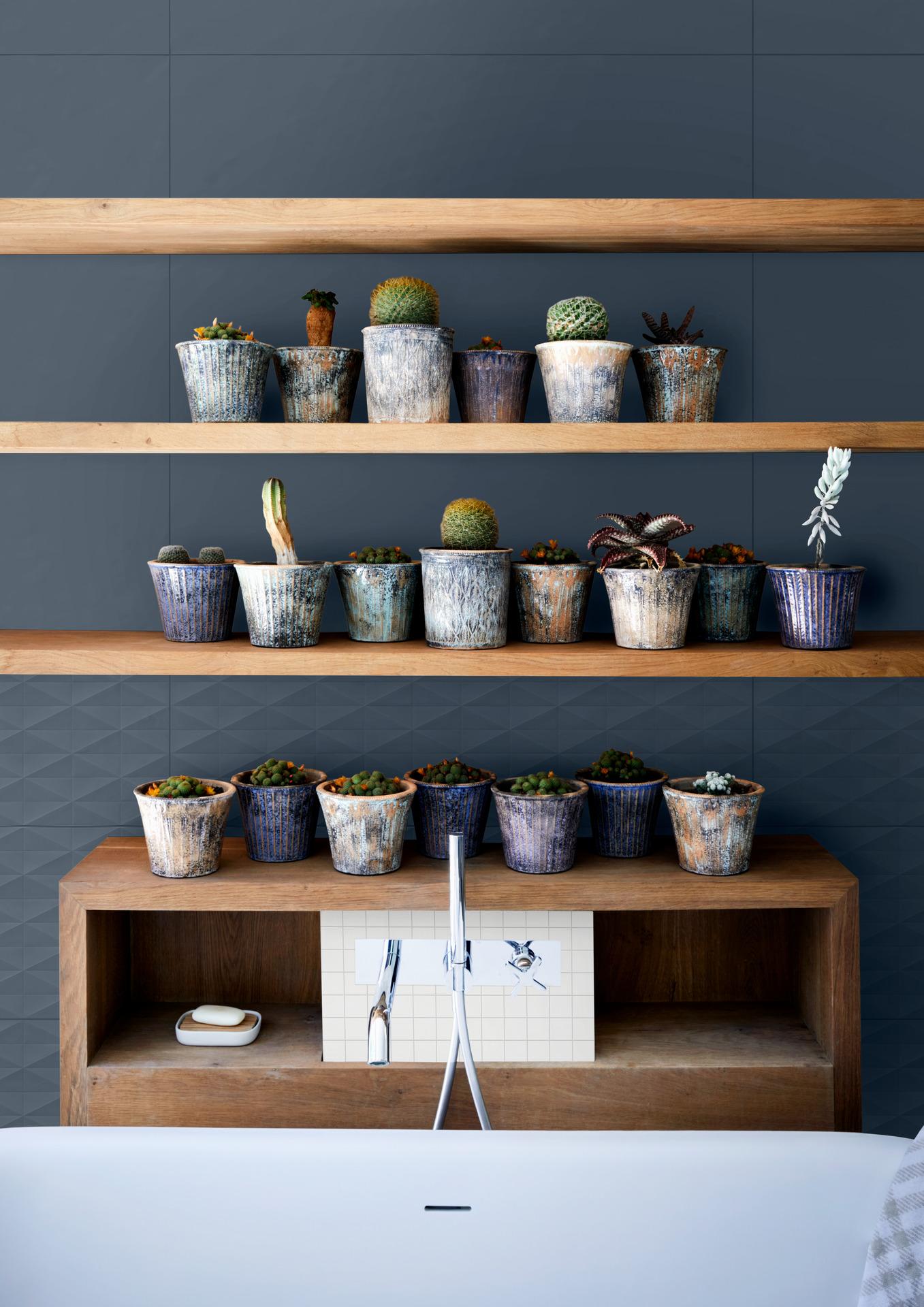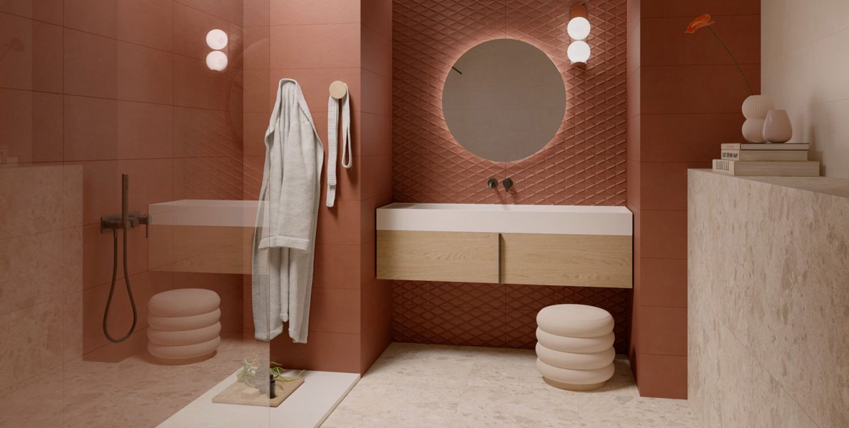 There are six shades in the range: the paler, more delicate White, Grey and Ivory and the denser, more forceful Pink, Clay and Blue. They are all also available in the relief version with bevelled motif, to give variety to entire walls or single parts and highlight functional areas, not only of bathrooms and kitchens but also of other areas of the home.