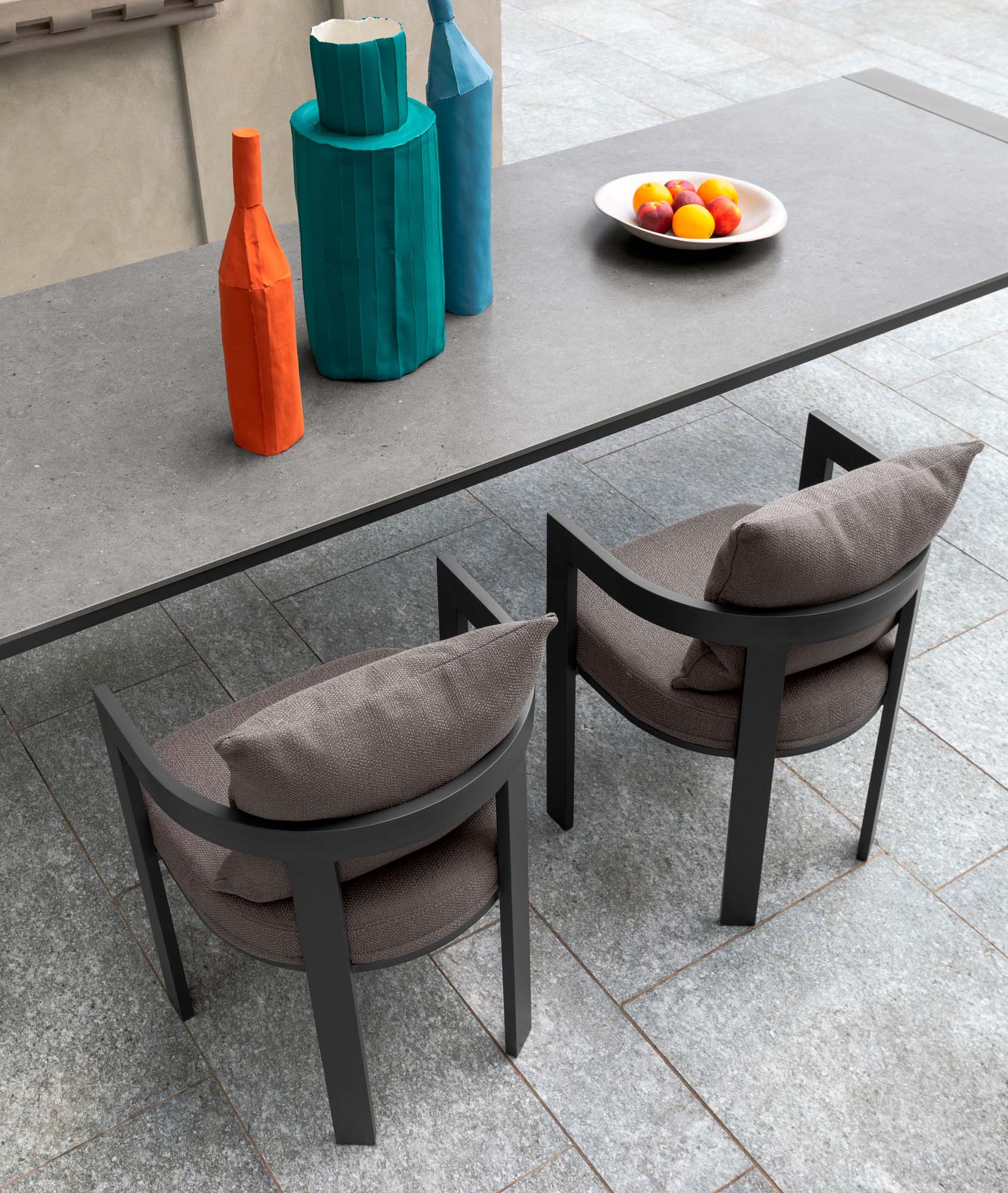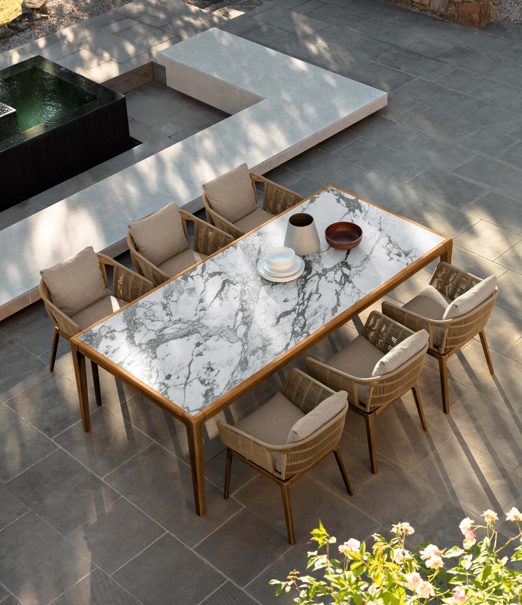 Weather-resistance and sustainability are essential. Therefore, most of our output focuses on easily recyclable materials. Apart from timbers such as FSC-certified Teak and Accoya, a fast-growing wood treated using a non-toxic process, we also use aluminium, which is versatile and recyclable ad infinitum, steel, with its excellent resistance to corrosion, and crafted concrete. For the tops of our tables, we choose eco-friendly raw materials that are not only resistant to rain and thermal shock but also easy to care for. Porcelain stoneware is one of our stalwarts: included in 70% of our collections, it’s extremely versatile with its vast range of finishes. It’s followed by VittEr, a compact laminate produced without formaldehyde, and natural and lava stones, the latter with an extra gloss finish provided by the ceramisation of melted recycled glass.