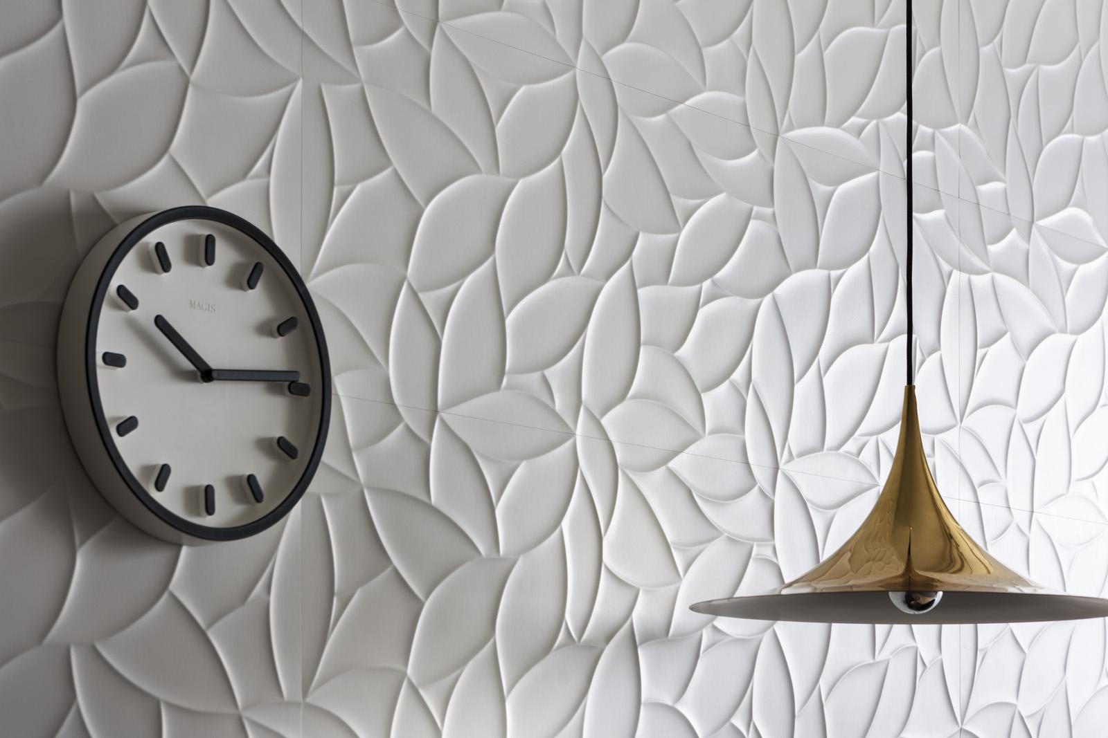 Essenziale Wave is inspired by the 3d effect of waves and it's recommended for horizontal laying, while available in both gloss and satiny finishes. Essenziale Flora recreates a new 3d texture by stylising a natural feature, in a satiny finish.