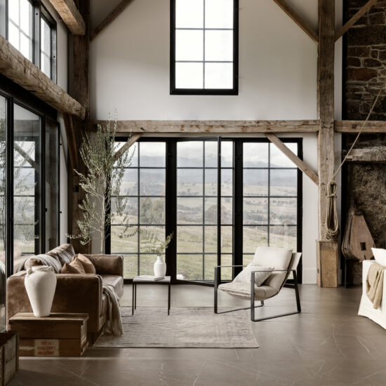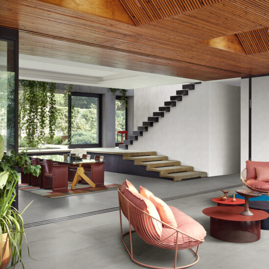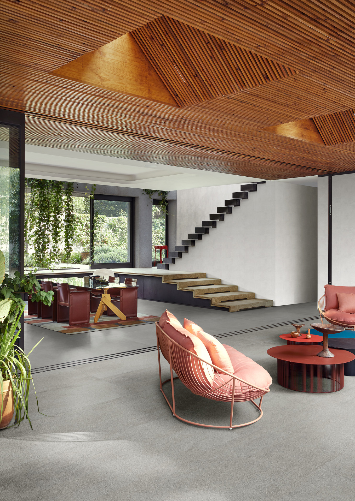 Interior design is evolving all the time and the modern living room reflects the latest trends, with a blend of style and sustainability. One of the most popular current trends involves the use of natural-looking materials with tactile textures, which give interiors a mood of authenticity and refinement. Porcelain stoneware is an ideal ingredient of this approach, since it accurately reproduces surfaces like marble, stone, concrete and wood while maintaining its durability and convenience.