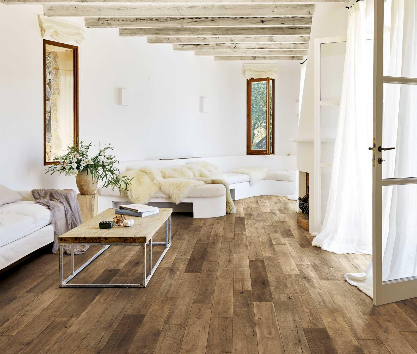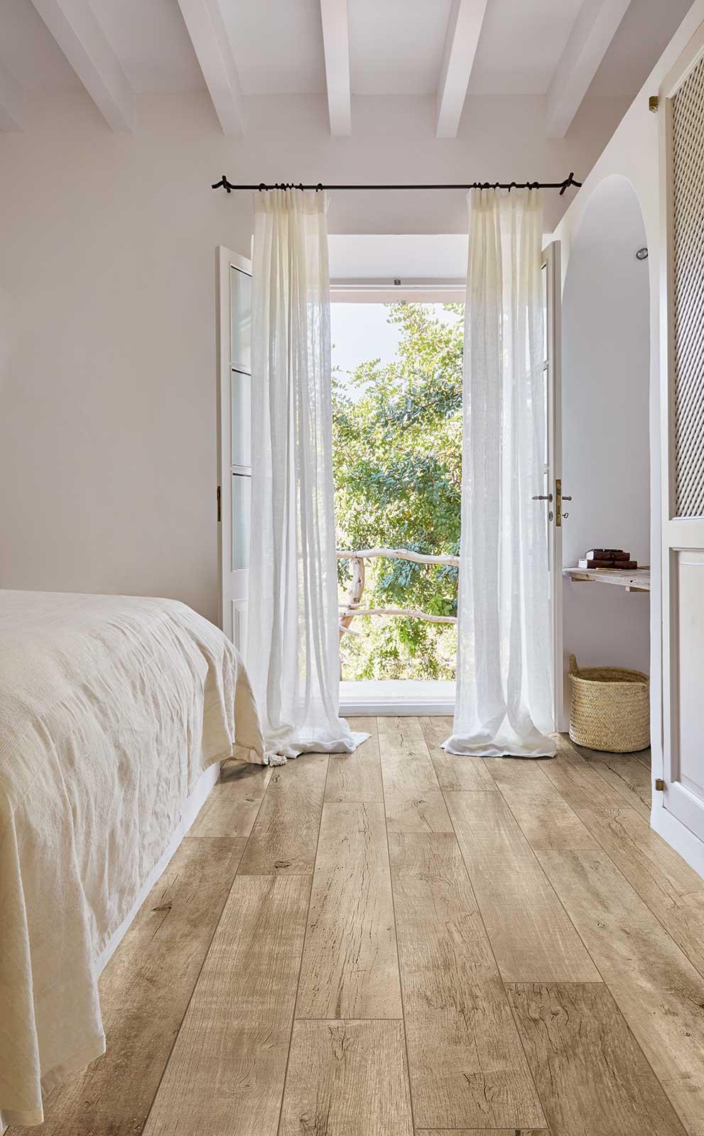Traditional materials, light colours and, for the floor, rustic wood-effect stoneware from the Treverkstage collection
