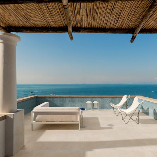 The furnishings of the dining area must be elegant as well as functional: spacious tables, comfortable chairs and light awnings create a space that’s a pleasure to use at even the hottest times of day. The lounge area can be furnished with outdoor sofas, loungers or poufs, completing the effect with outdoor carpets that increase comfort and define the mood. For shady corners, adjustable awnings or wooden pergolas are both attractive and practical.