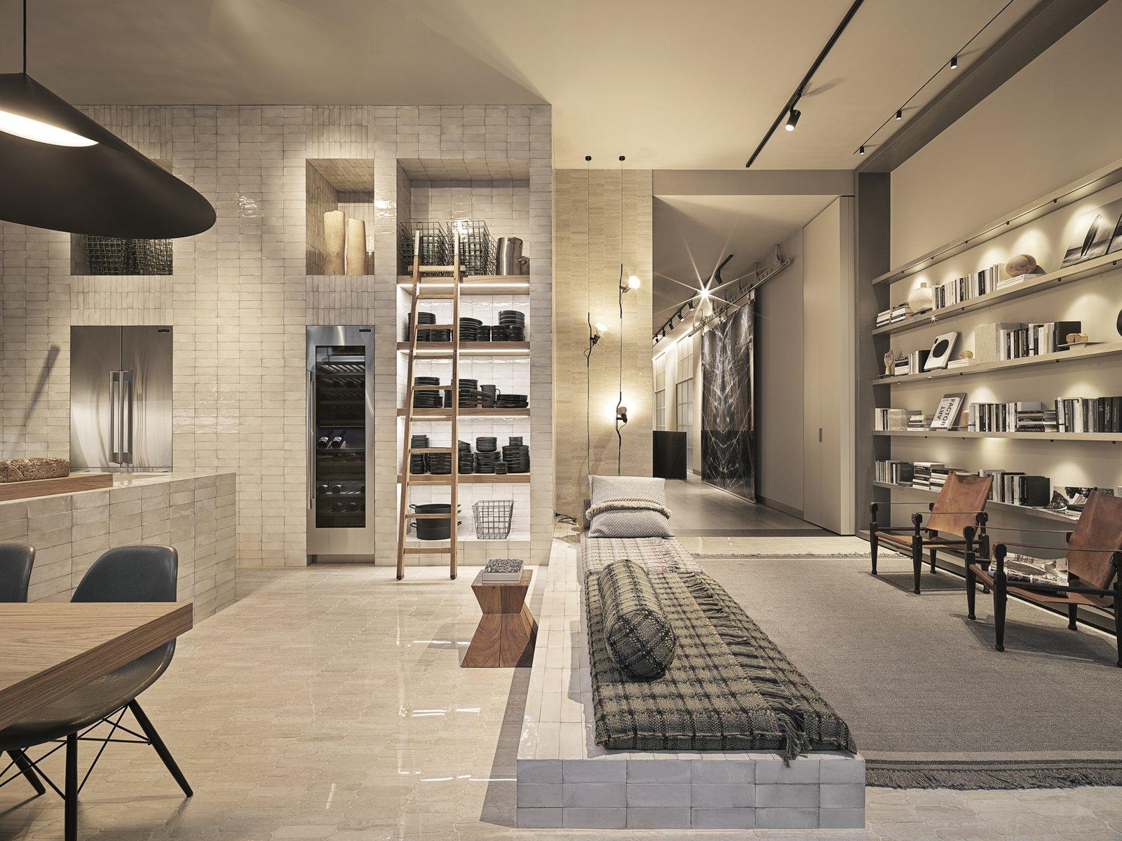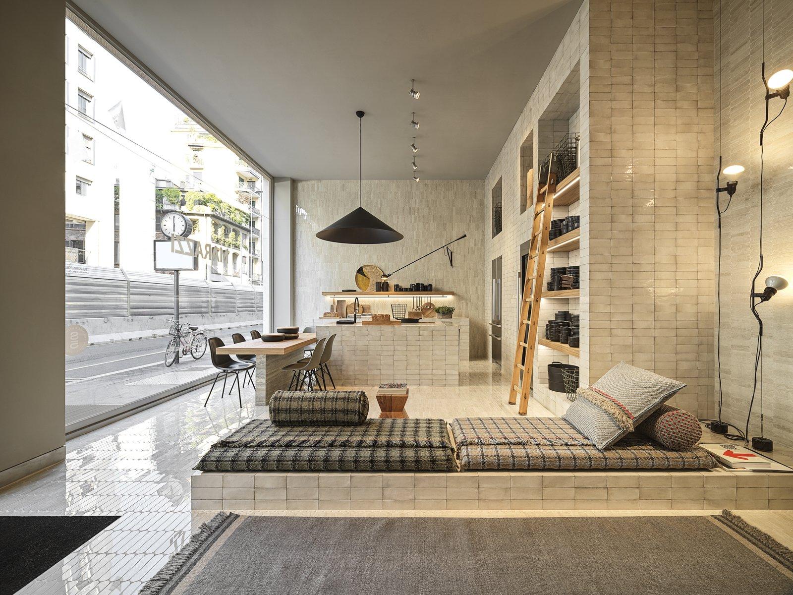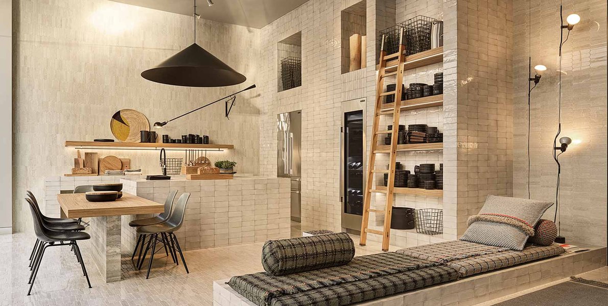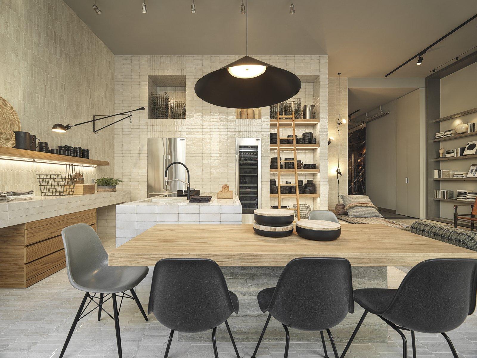 The Antonio Citterio Patricia Viel firm designs the installation at the Marazzi showroom for the Milan Design Week. A cosy and friendly home environment in which the kitchen space merges with the living room, thanks to the use of ceramics. A space that celebrates not the kitchen, but cooking, not the lounge, but being together.