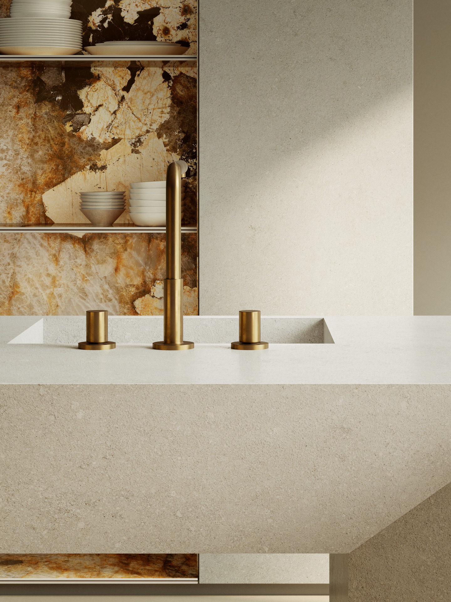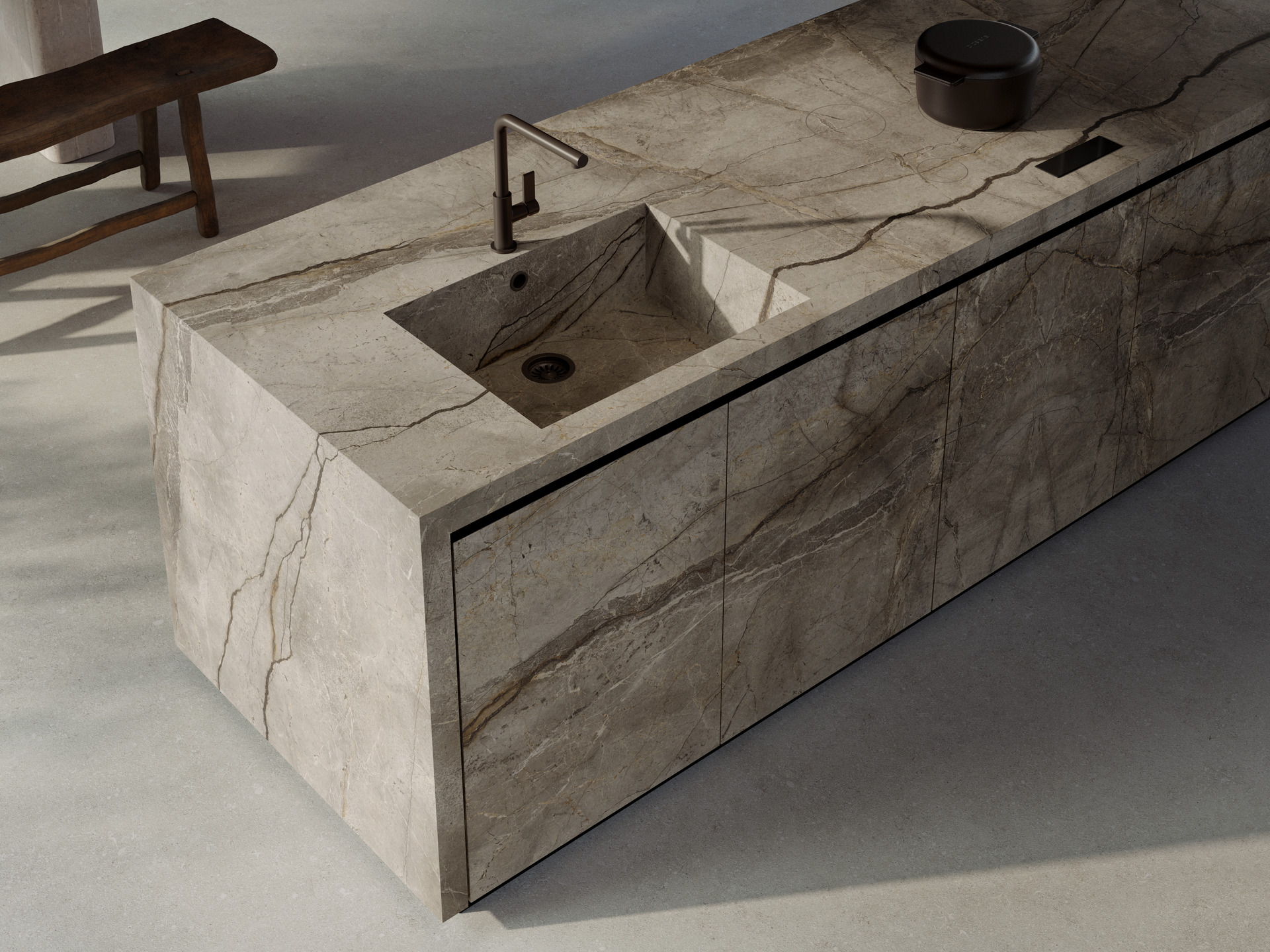 Brazilian quartzite is reinterpreted in the Bahia variant with shades based on deep black. Silver Root, on the other hand, resembles the Turkish marble with its “rocky” veining, while Breccia Imperiale evokes another quartzite of Brazilian origin, with warm greyish shades and a texture of white veins richly dotted with pebbles. These surface effects are enhanced by the 3D Ink digital printing technology, which ensures perfect matching between patterning and three-dimensional surface structures that are different in every single slab.