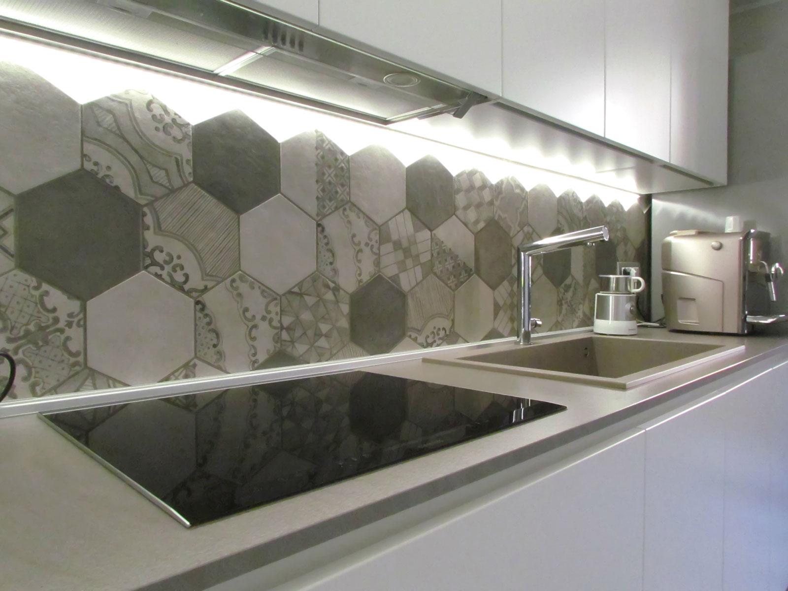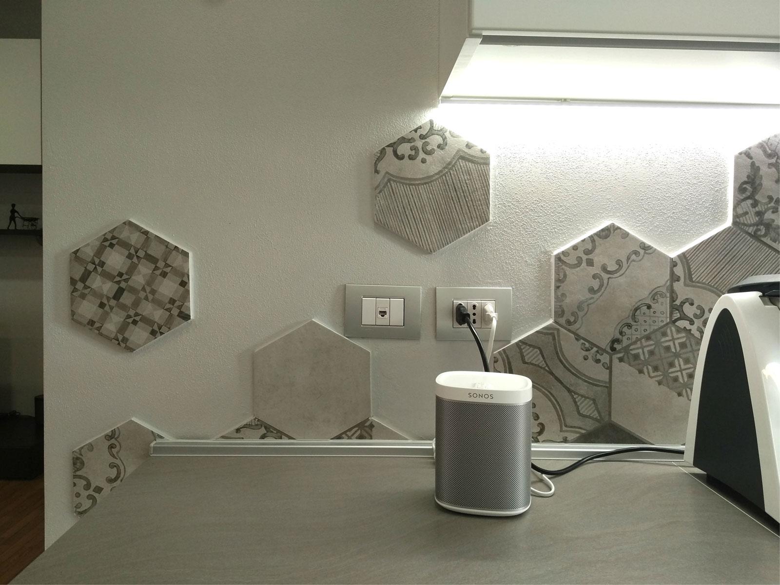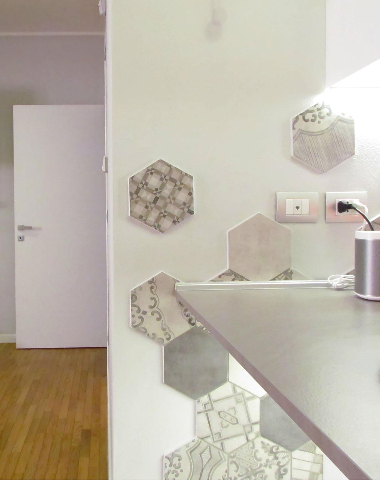 The most distinctive feature is the way in which the hexagonal tiles end next to the peninsula which gives onto the living-room: the suggestion was to finish the tiled wall with a "transitional" area, with isolated tiles, separate from the rest, creating a kind of fade-out effect.