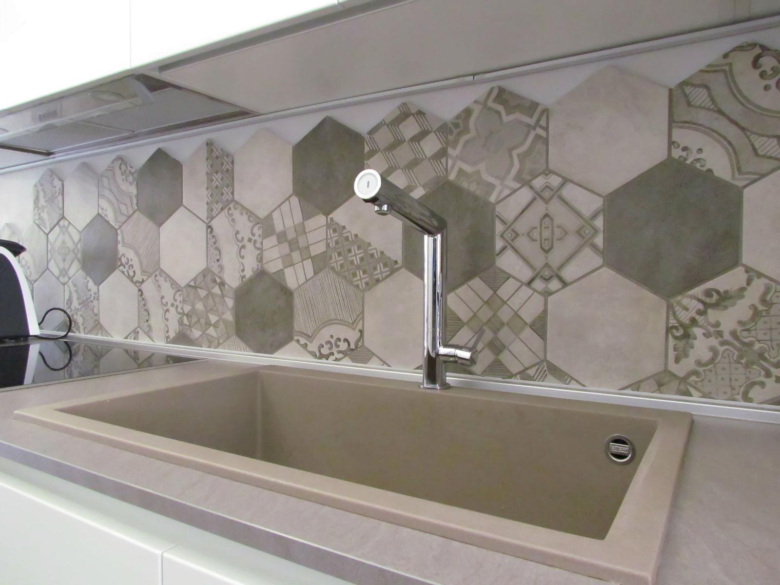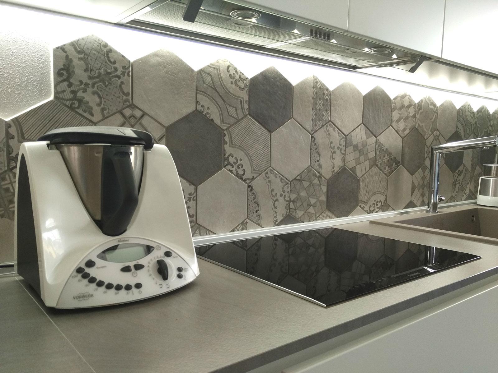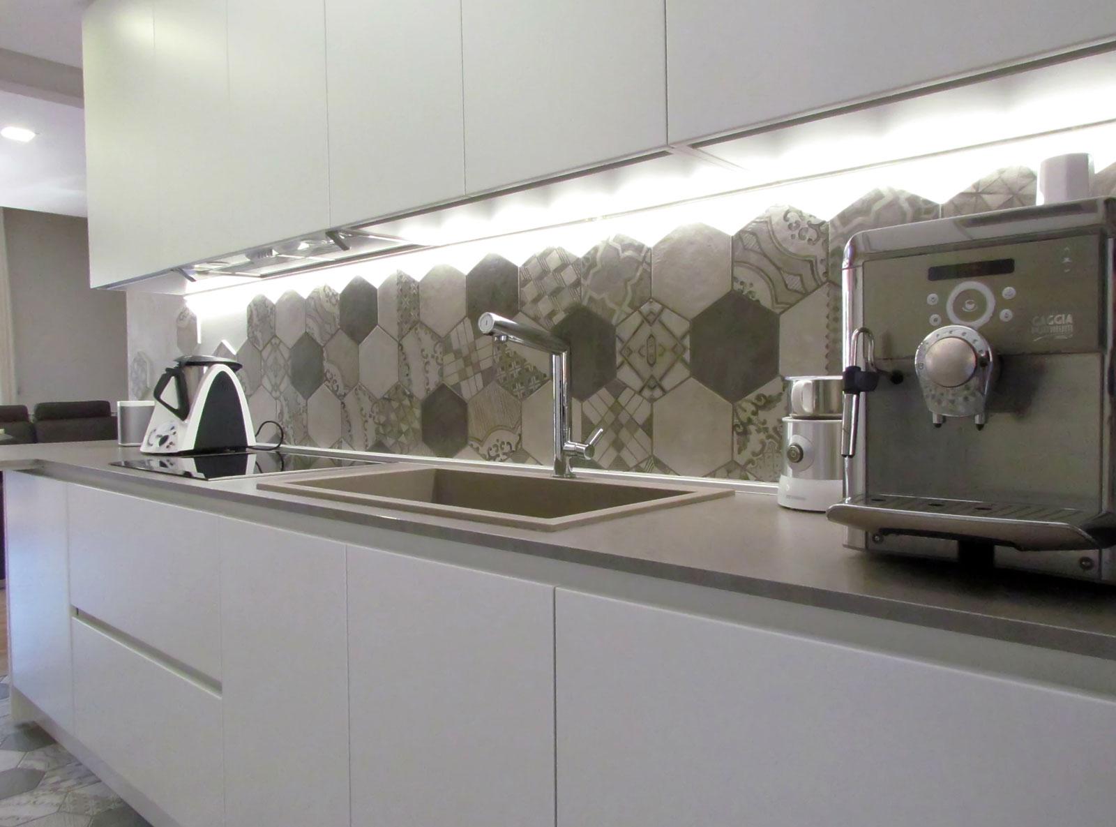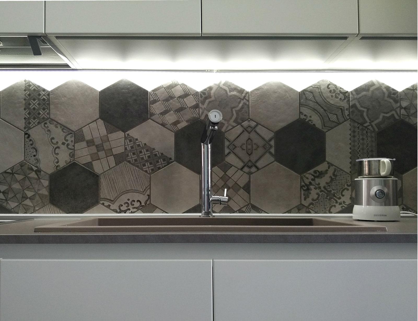 The most distinctive feature is the way in which the hexagonal tiles end next to the peninsula which gives onto the living-room: the suggestion was to finish the tiled wall with a "transitional" area, with isolated tiles, separate from the rest, creating a kind of fade-out effect.