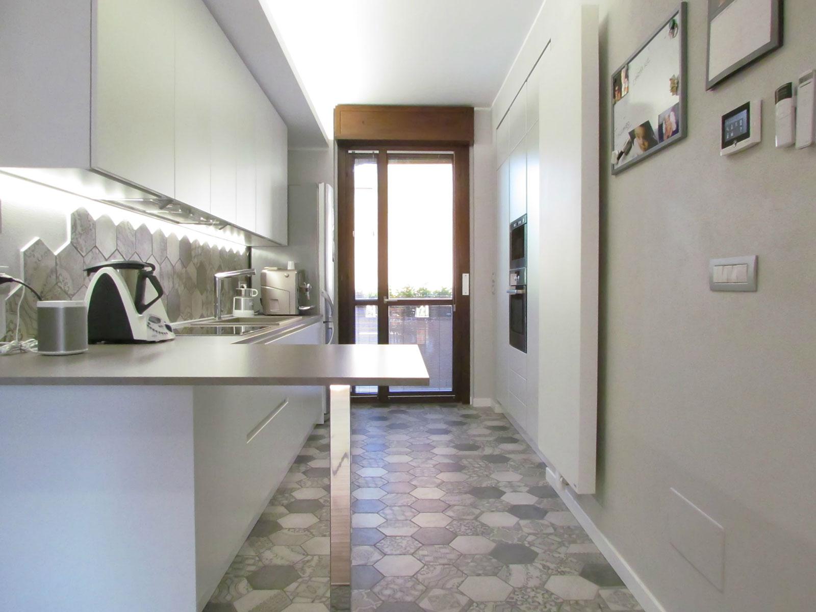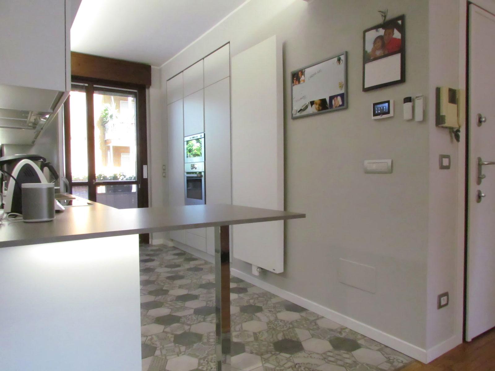 The main aim of the project to renovate the four-room apartment in Monza was to open the kitchen onto the living-room and ensure that it would integrate successfully with the existing floor, a small-strip natural oak parquet.