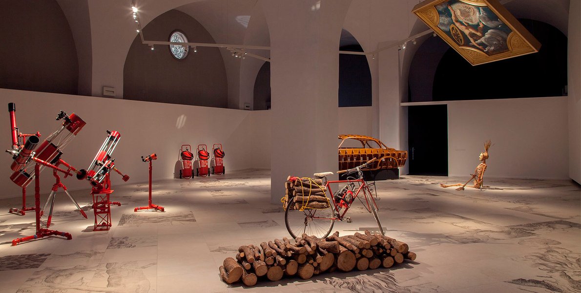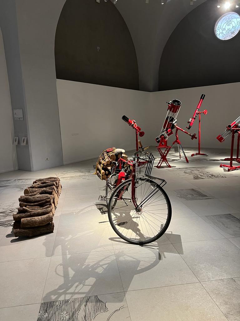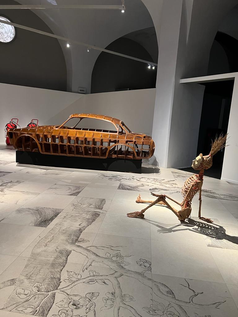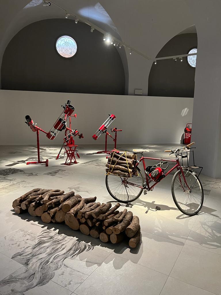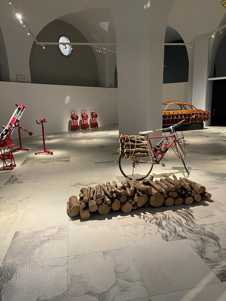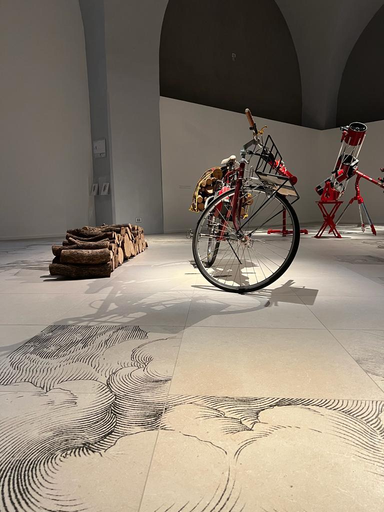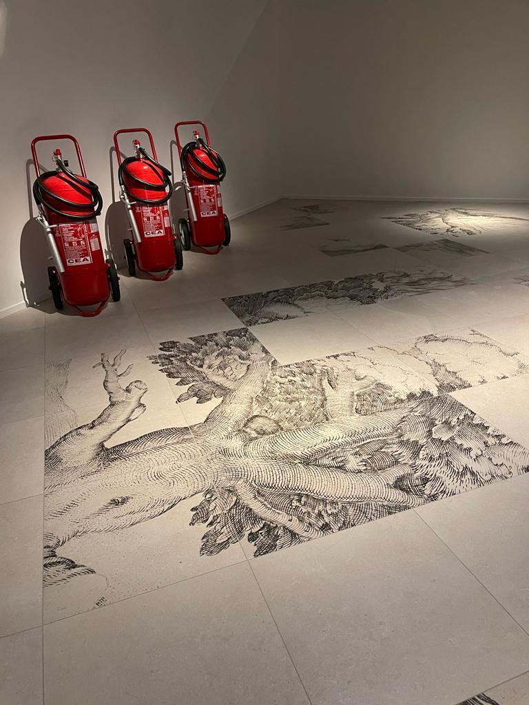 The installation also dialogues with illustrations chosen from the pages of the valuable books held by the Biblioteca Estense library and other works by the same artist. The effect is to invite the visitor to progress through the striking scene. “The floor is a maze with a mixture of enormously enlarged fragments of 18thC and 19thC woodcuts, a metamorphic collage of trees, fires and clouds of smoke. Heaven and earth change places in a huge conflagration which seems to burn and blaze before our eyes, with images that have become all too familiar, evoking our planetary emergency and climate change. The project sets out to put the current situation into a historical context. […] It is a journey through time, tracing the responsibility of the human race.”