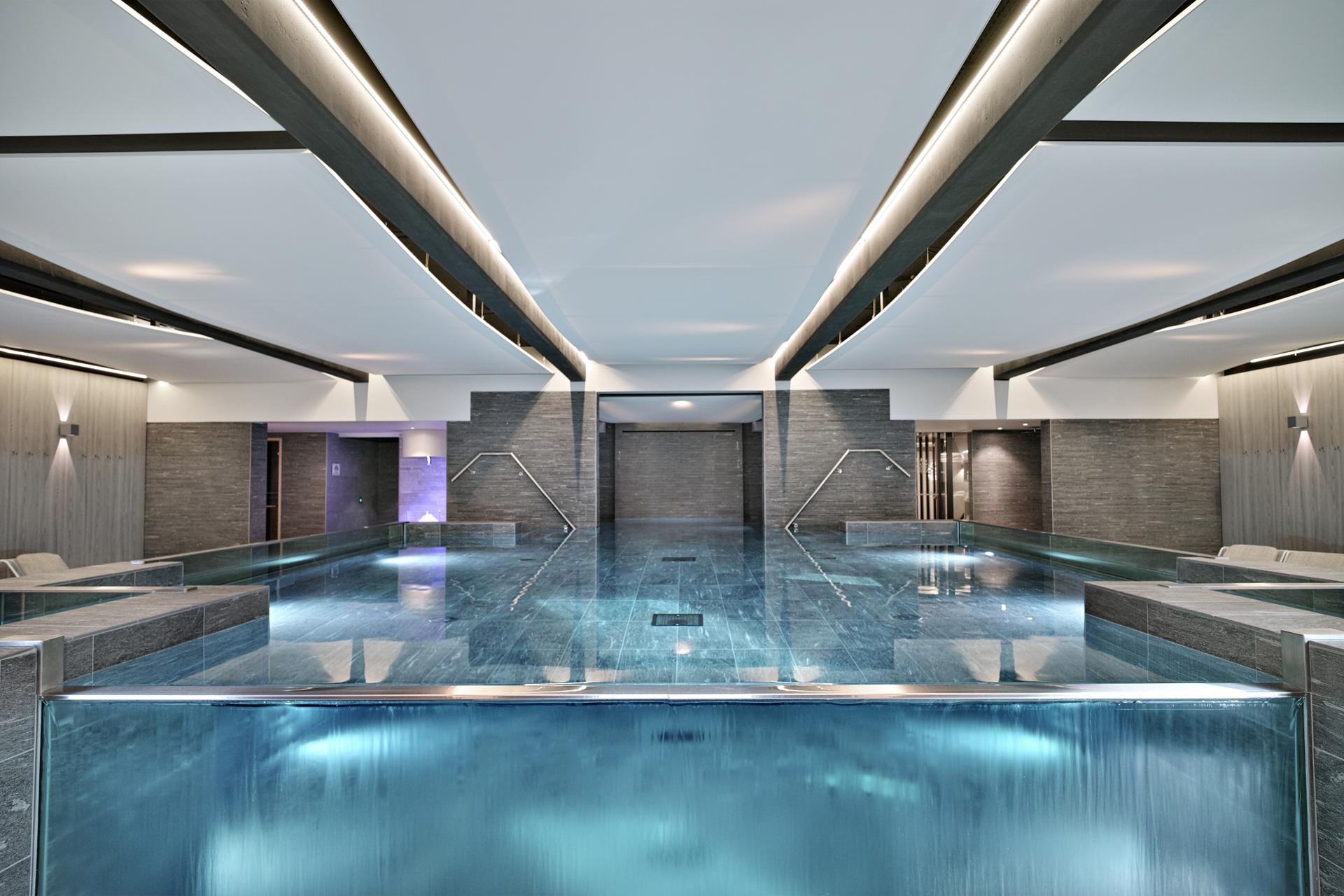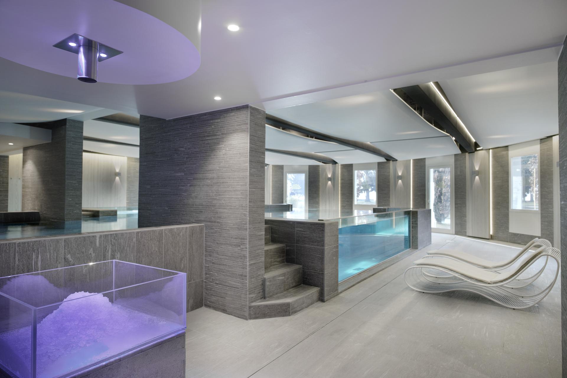 The various private rooms for massages and treatments are characterized by a minimalist design, perfect lighting to ensure maximum comfort and ceilings decorated with reproductions of spa-themed frescoes that differ from room to room. However, the nucleus of the spa is the covered pool with a large glazed tub and a waterfall, furnished with Karim Rashid armchairs that evoke futuristic atmospheres.