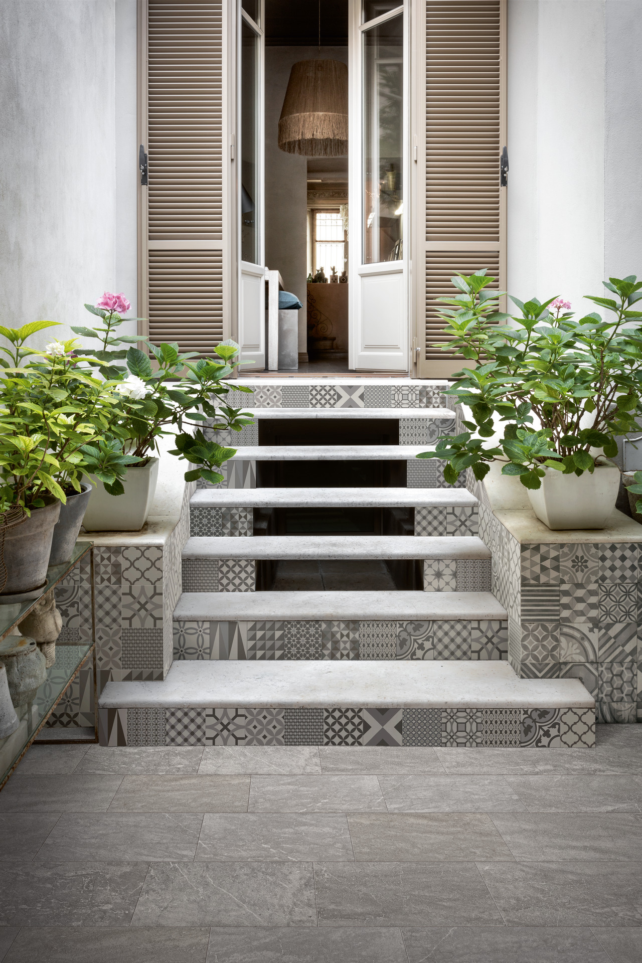 Usually, cleaning indoor and outdoor steps and stairs may involve a variety of difficulties. For example, although dust and debris often tend to build up on wooden staircases, cleaning porcelain stoneware will be easier due to the material’s non-porous surface. When it comes to outdoor steps, exposed to adverse weather, frost and atmospheric factors, porcelain stoneware is an excellent solution: it doesn’t fade due to exposure to UV radiation, doesn’t warp when temperatures change and doesn’t absorb water, so there’s no risk of cracking or splitting. It also withstands mould and bacteria, and stays intact, clean and safe in the long term.