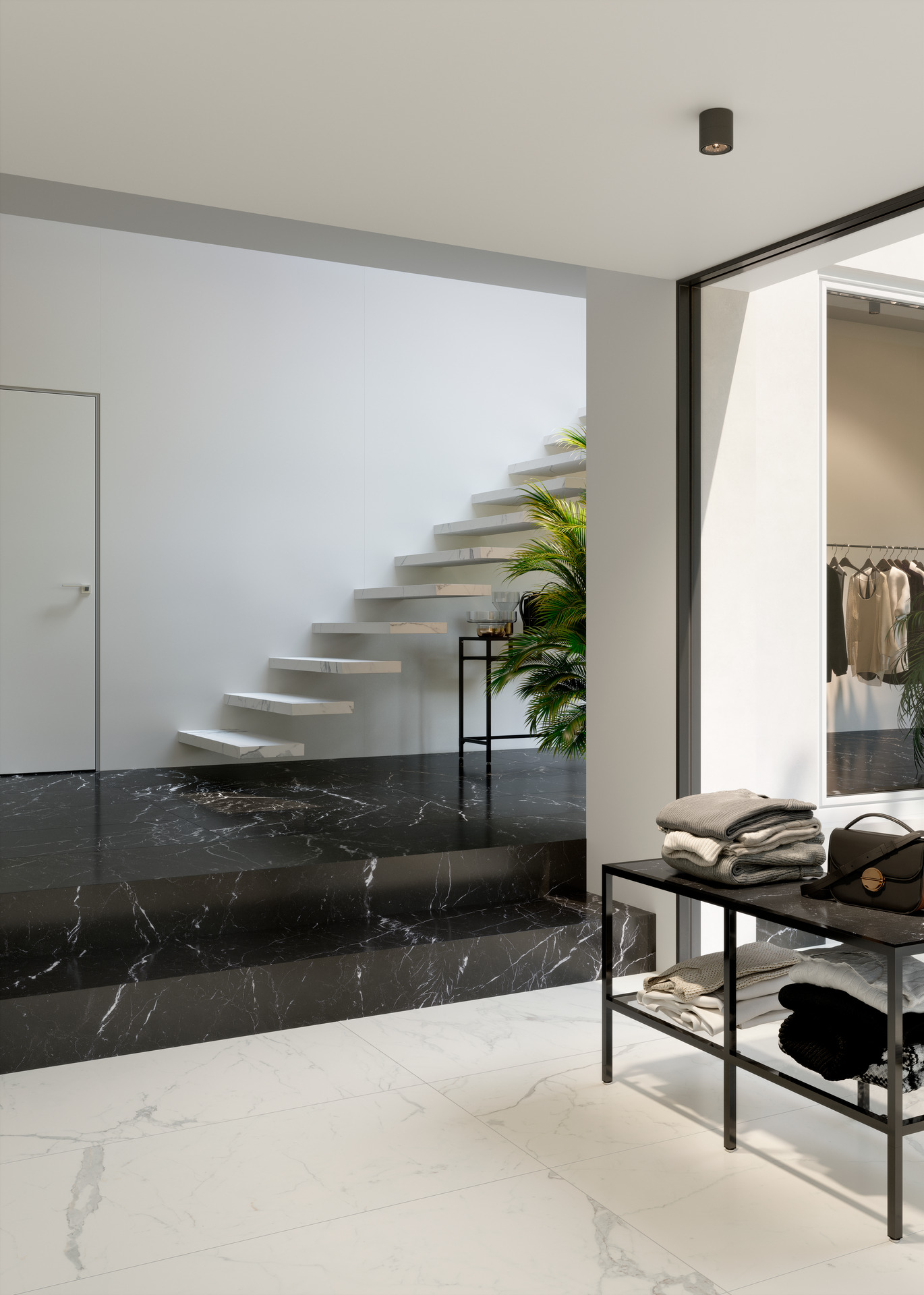 For a more luxurious finish, on the other hand, we recommend marble-effect porcelain stoneware, which accurately reproduces the constant variation and gleam of the natural stone, selecting its most elegant vein patterns for a strikingly decorative surface.
