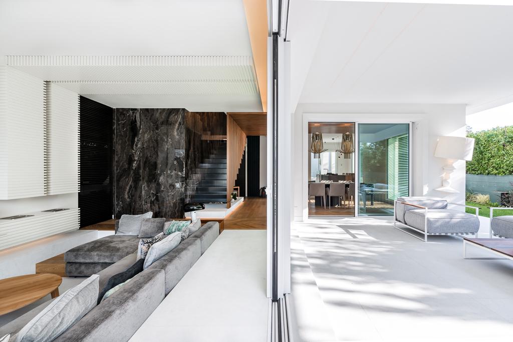 Villa Anna, designed by Michele Vitaloni of Charmitaliastudio, has an interior layout featuring an original use of materials, whose elegance is enhanced by the Frappuccino texture of Marazzi’s Grande Marble Look slabs.
