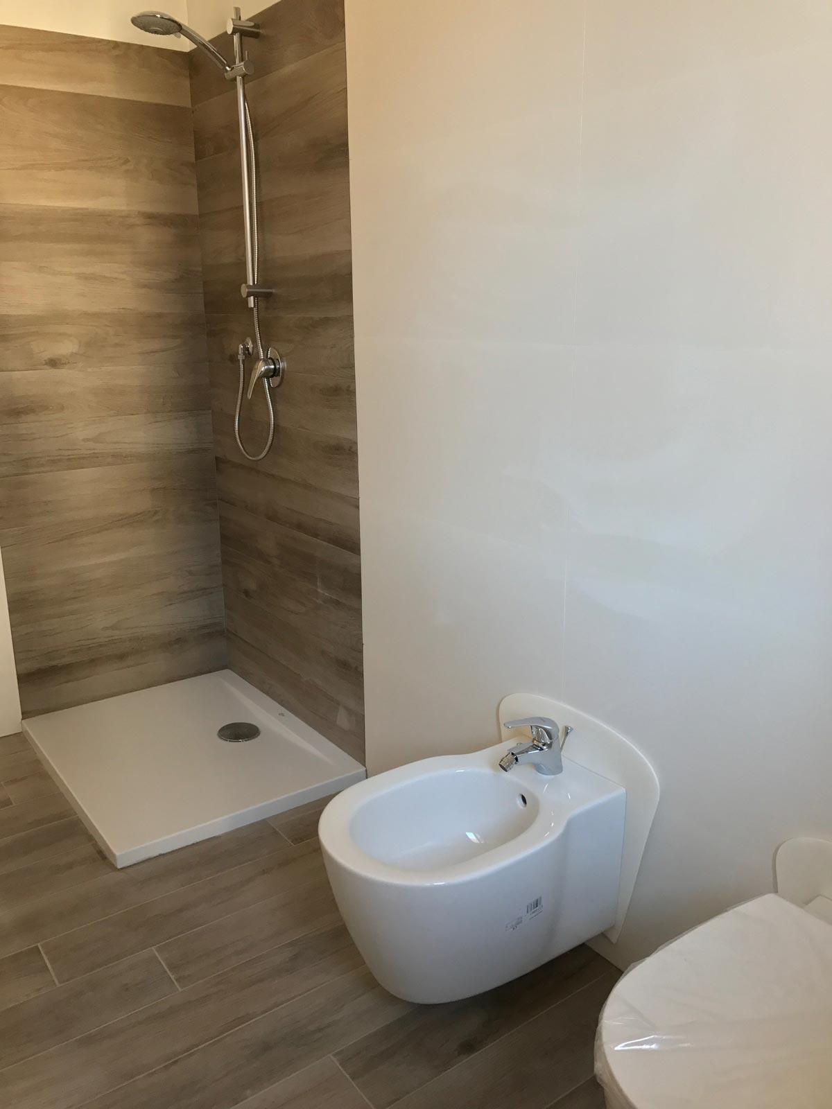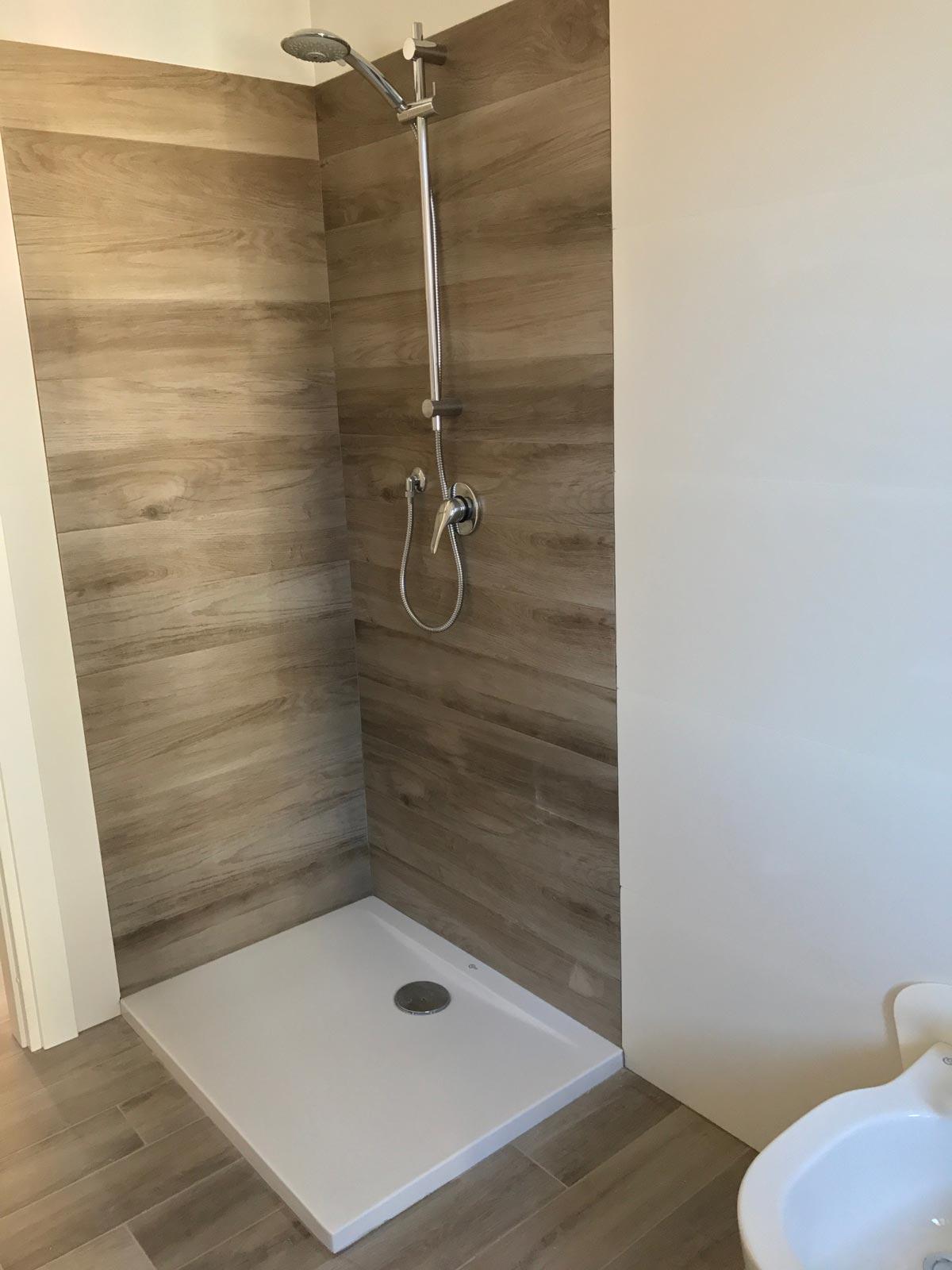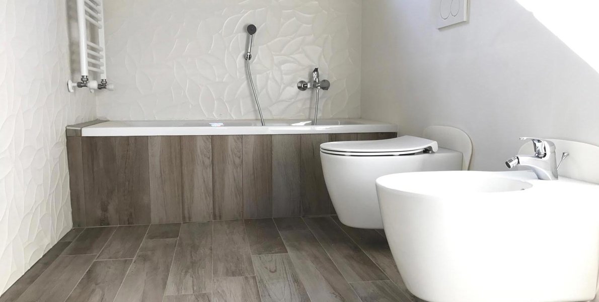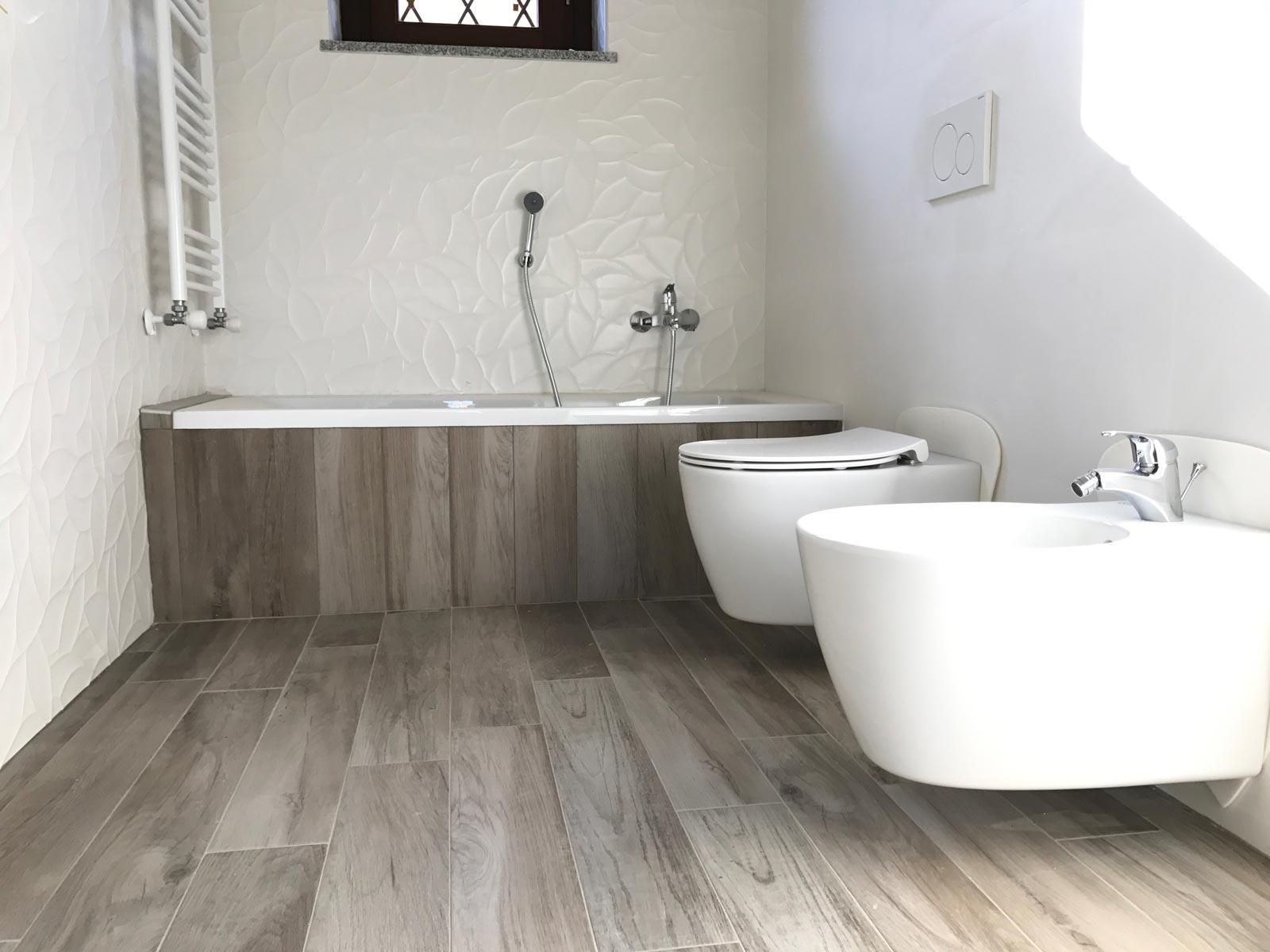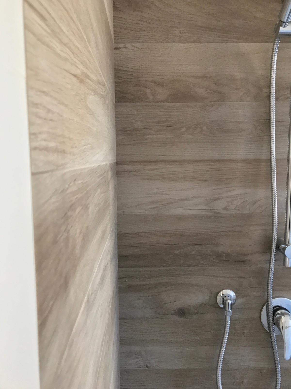 The bathroom was designed throughout with two Marazzi collections: Essenziale and Treverkmood. The wood-effect Treverkmood collection, chosen in the Rovere colour and the 15×90 cm size, was used both as flooring and as wall covering of the shower area, as well as to clad the bathtub structure.