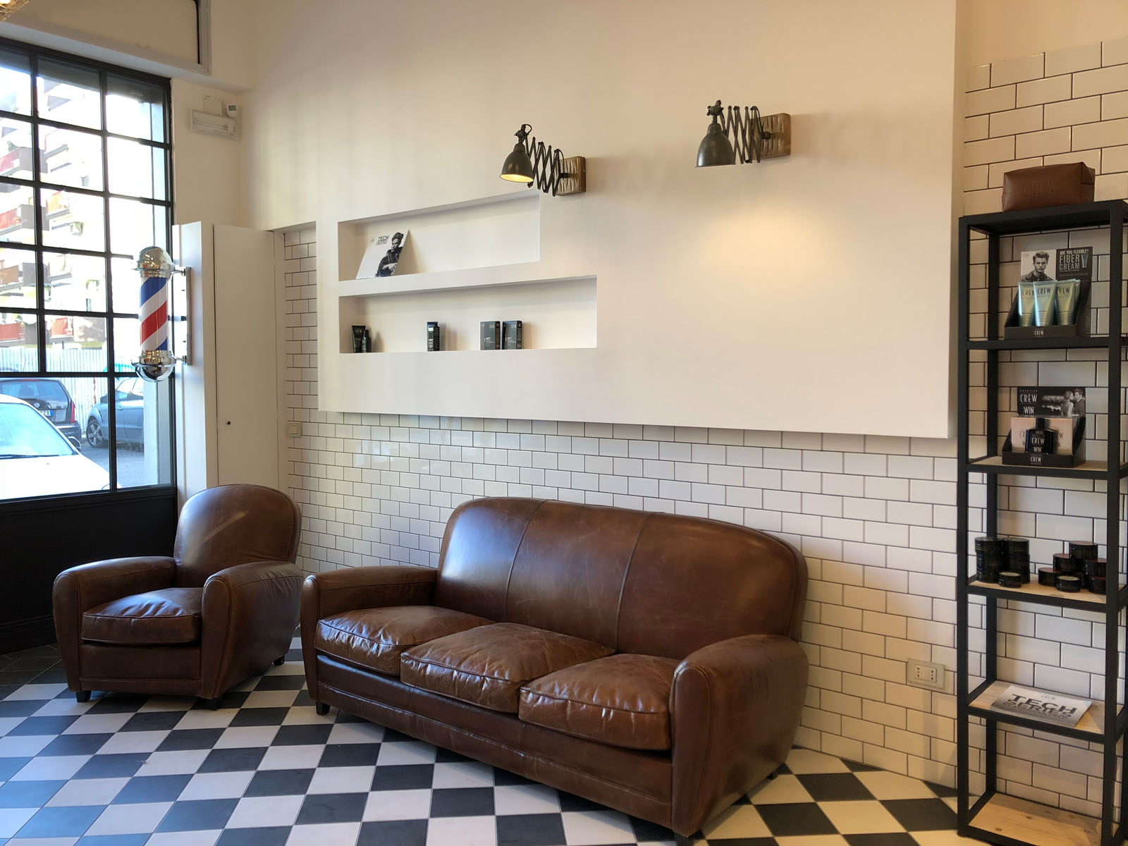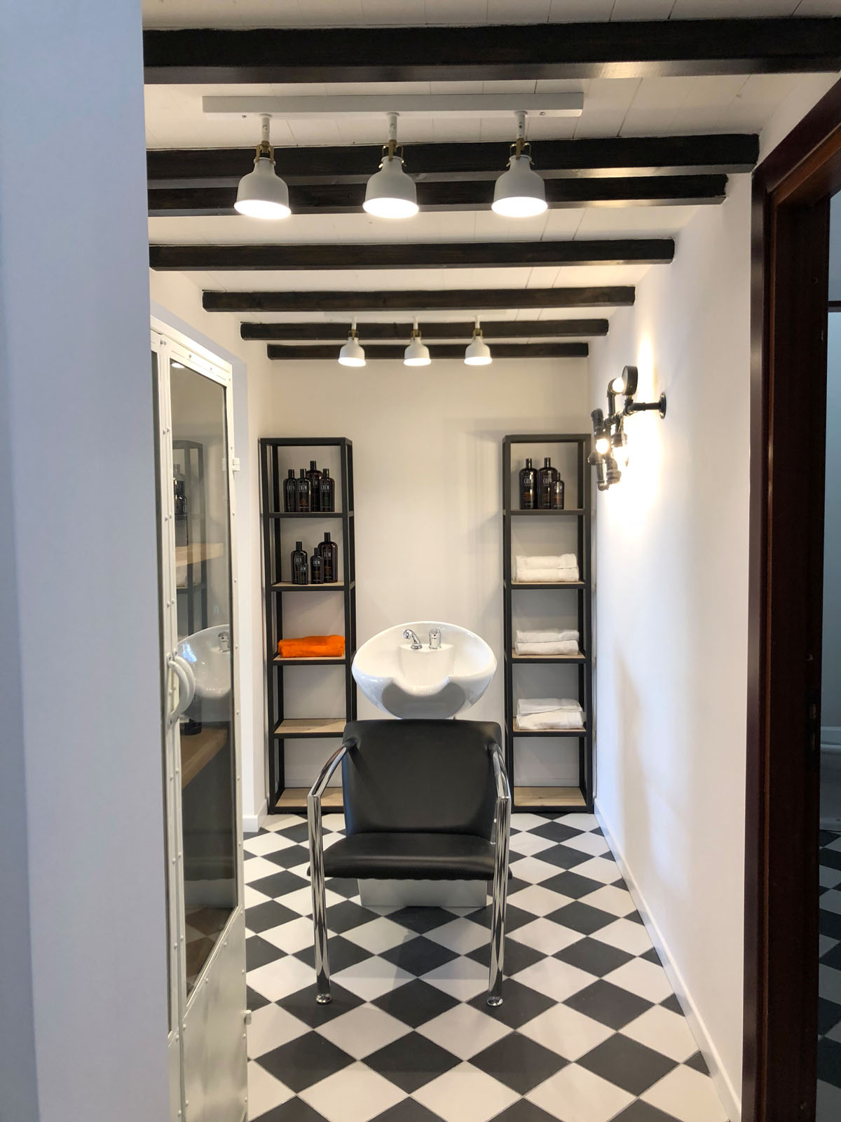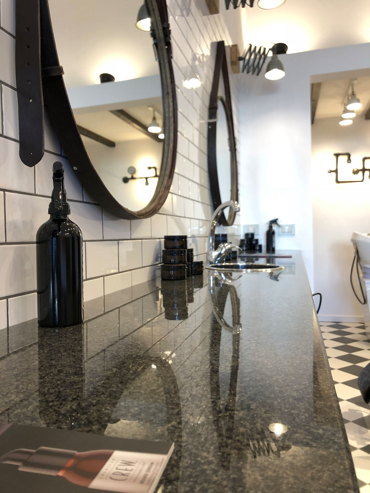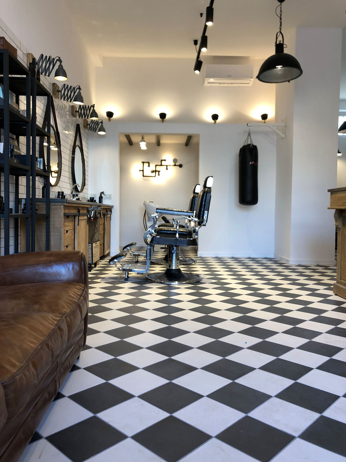 Brown Experience is the new barber’s shop in Taranto designed by the Gruppo Cactus architecture firm. 20x20 cm tiles from the D_Segni concrete-effect collection, chosen in the Midnight and Chalk colours and installed with a diagonal chessboard design, give the room a ‘50s vintage-industrial mood. This industrial style is also accentuated by the choice of materials and furnishing elements such as metal arm and pendant lamps, round hanging mirrors with leather hooks, rounded chairs and armchairs, industrial metal cabinets and raw wood. The project is completed by the brick wall-effect Hello White 7.5x15 cm collection, which evokes the charm of “subway tiles”, tiles that covered metro stations in large cities in the 20th century.