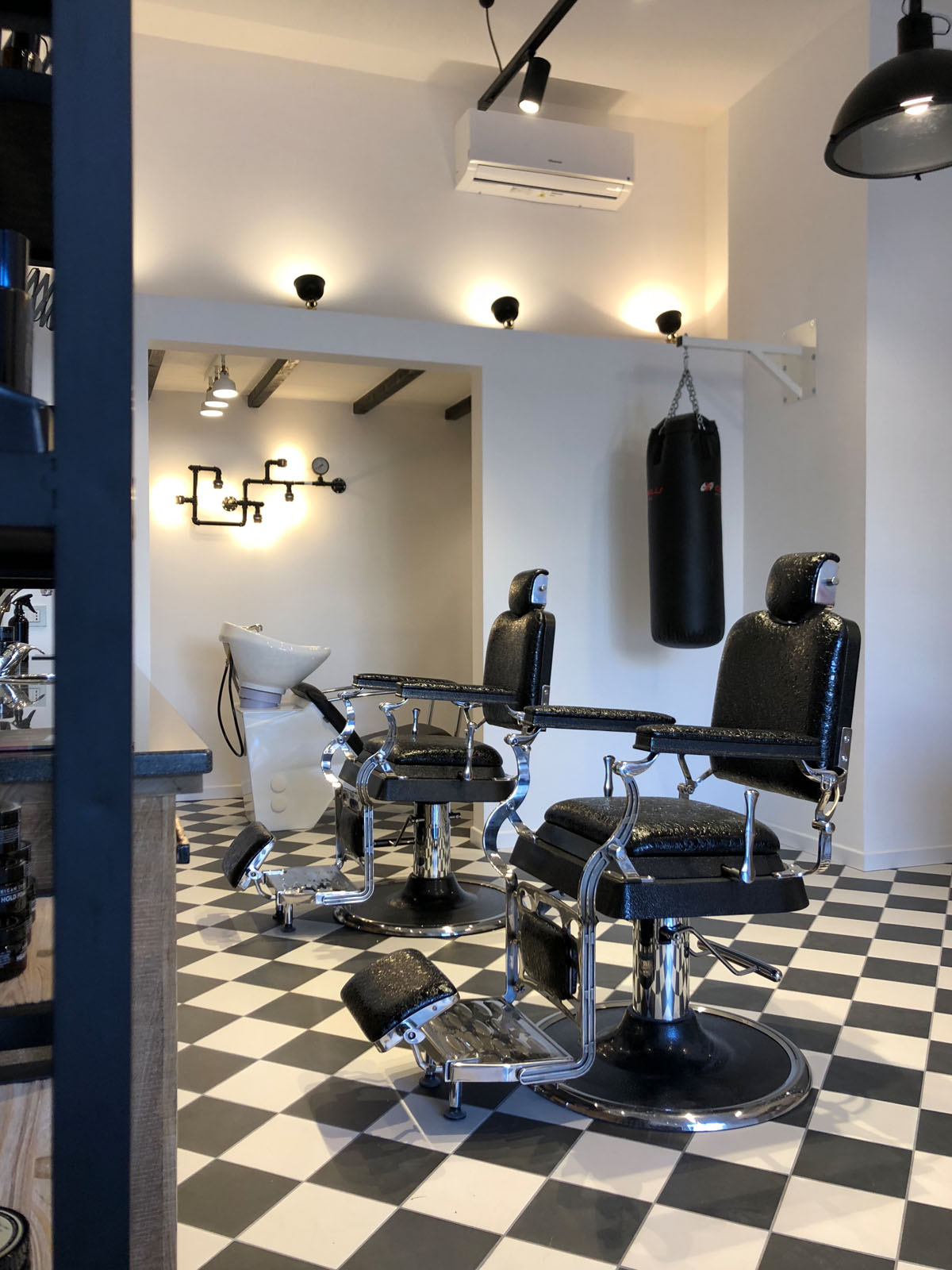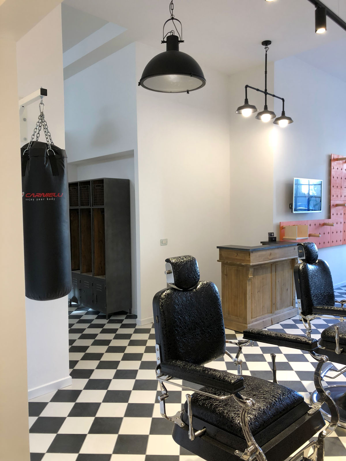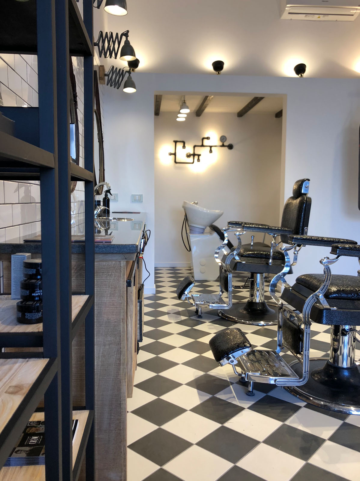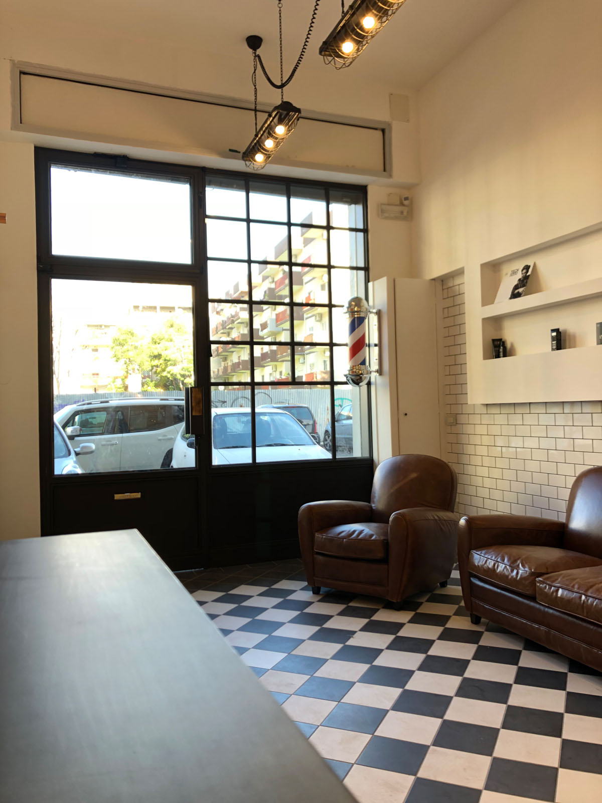 Brown Experience is the new barber’s shop in Taranto designed by the Gruppo Cactus architecture firm. 20x20 cm tiles from the D_Segni concrete-effect collection, chosen in the Midnight and Chalk colours and installed with a diagonal chessboard design, give the room a ‘50s vintage-industrial mood. This industrial style is also accentuated by the choice of materials and furnishing elements such as metal arm and pendant lamps, round hanging mirrors with leather hooks, rounded chairs and armchairs, industrial metal cabinets and raw wood. The project is completed by the brick wall-effect Hello White 7.5x15 cm collection, which evokes the charm of “subway tiles”, tiles that covered metro stations in large cities in the 20th century.