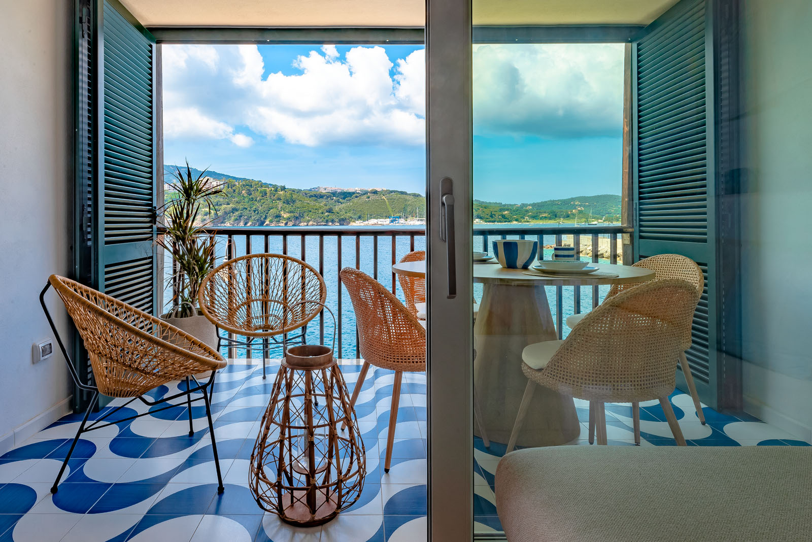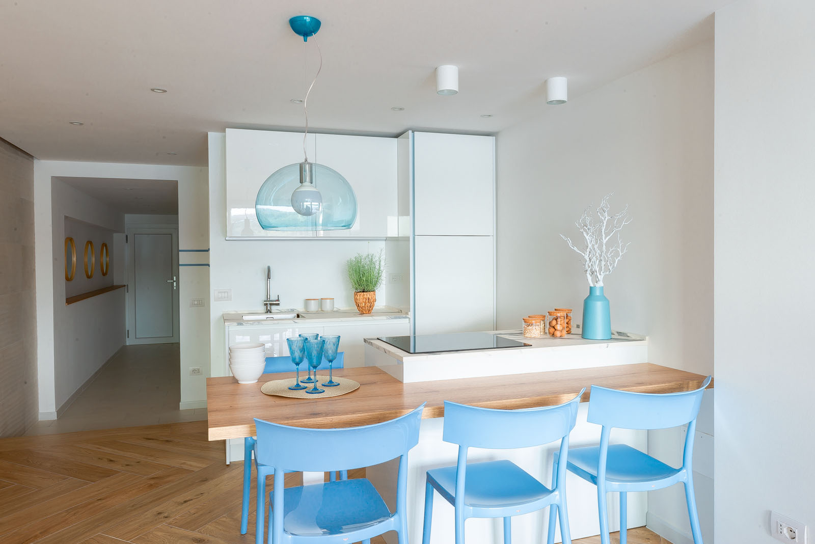 The small apartment overlooking the sea on the Island of Elba, in the holiday resort of Porto Azzurro, was completely renovated to reveal all its maritime nature. In this contemporary project in Mediterranean style, the breath-taking view of the sea was a great source of inspiration for architect Luca D’Errico, who created the design.