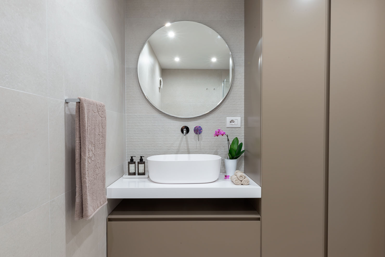 Last but not least, the architect selected Marazzi products for the bathroom, specifically Stone_Art: Steel Woodcut structure with ribbed effect to cover the area behind the washbasin and the plain tile in Steel colour for the other walls.