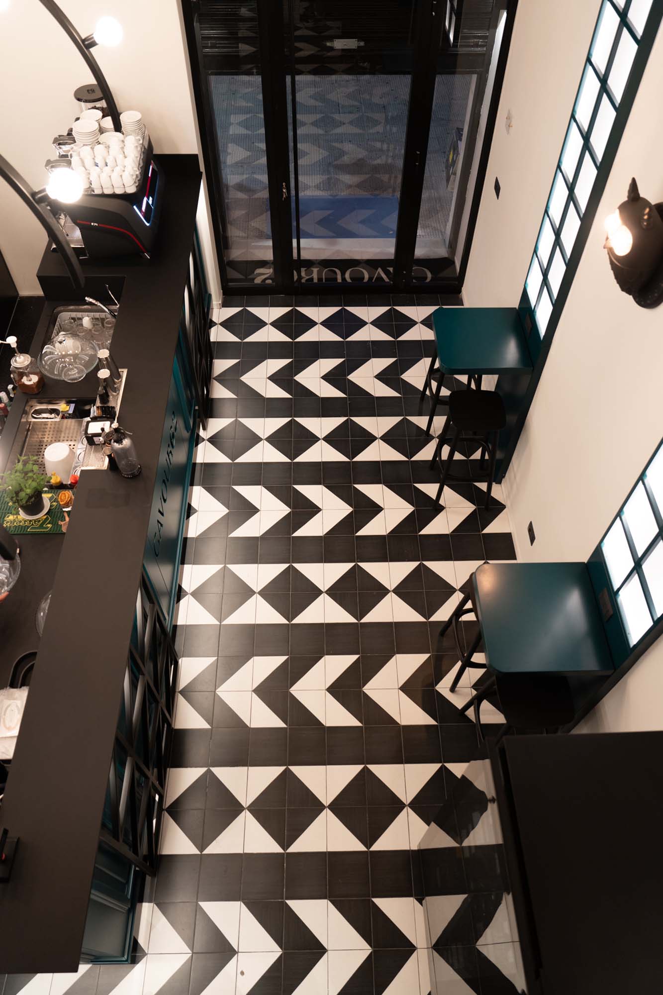 The contrasting tiles’ installation pattern was designed to make the space appear larger, by alternating bands in two solid colours and triangular decors, placed in alternation to give more depth to the interior.