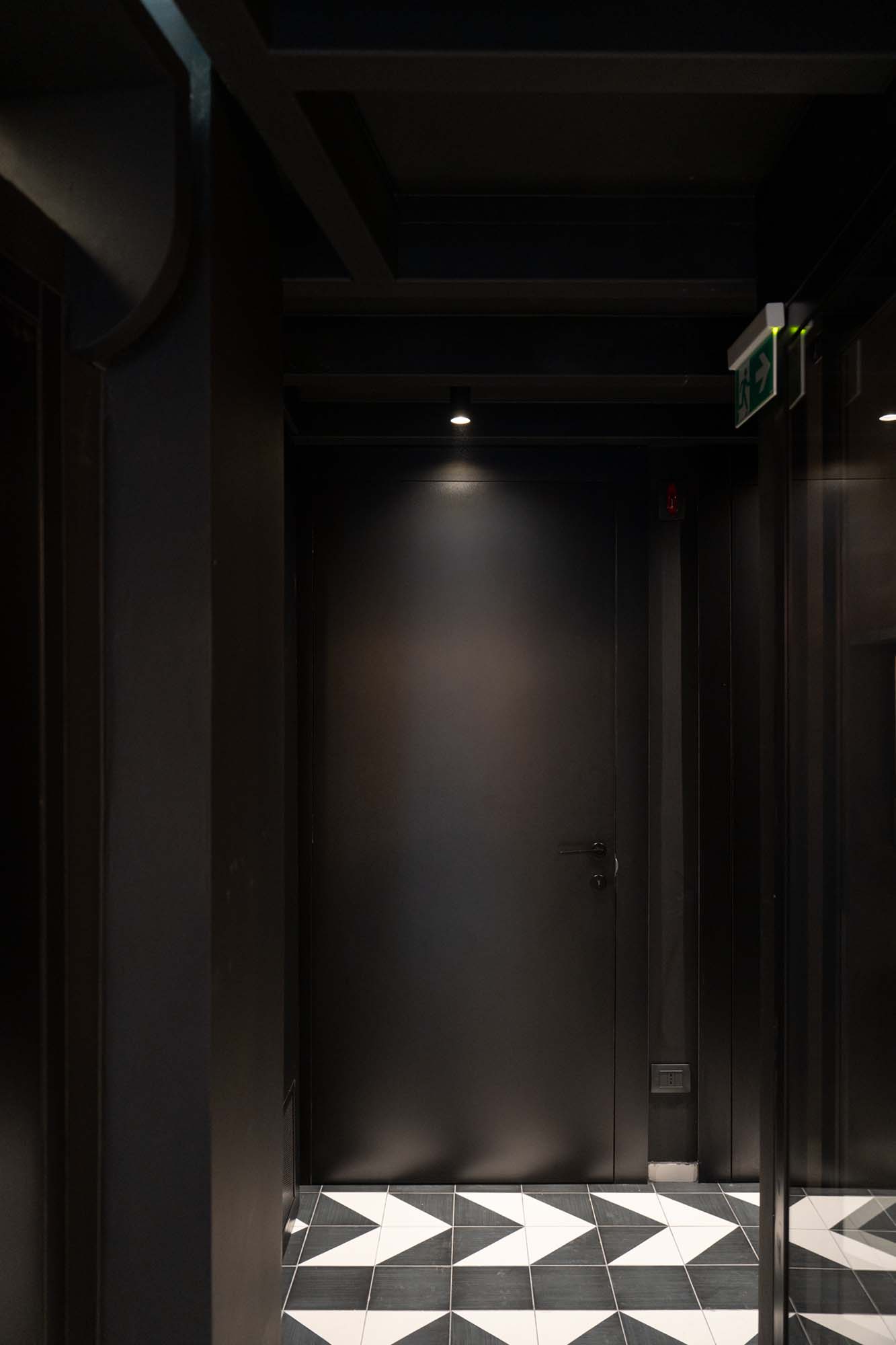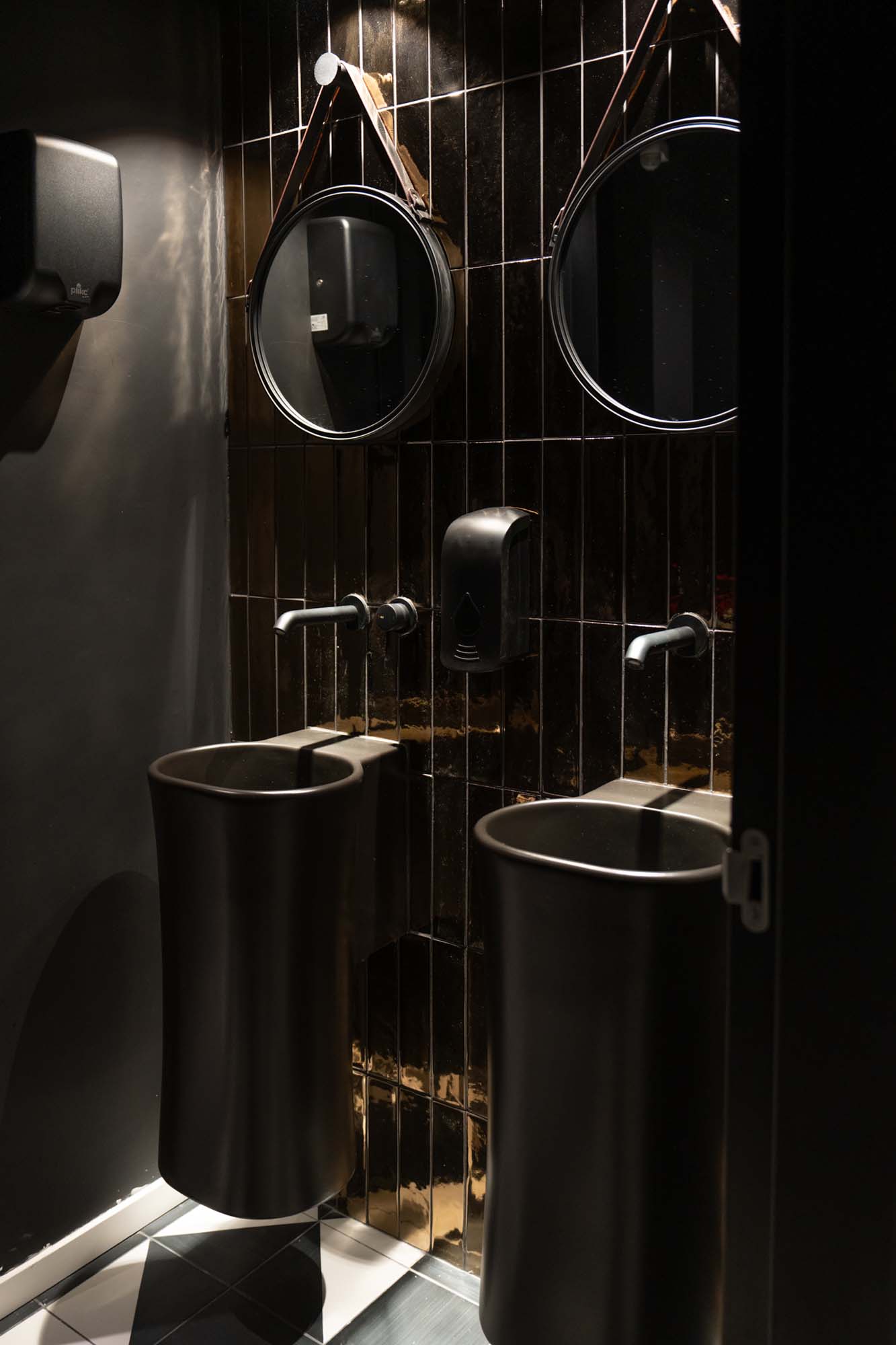 The same optical concept was also used for the washrooms, where the two-colour floor becomes the focus of the interiors, combined with all-black walls and sanitary fixtures.