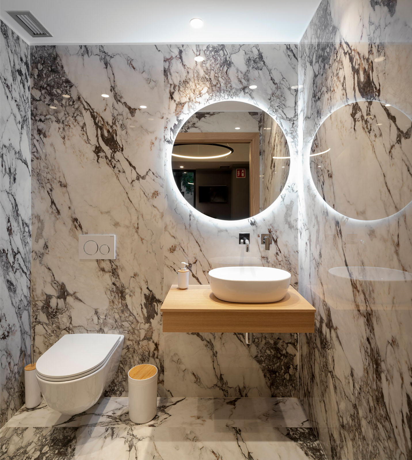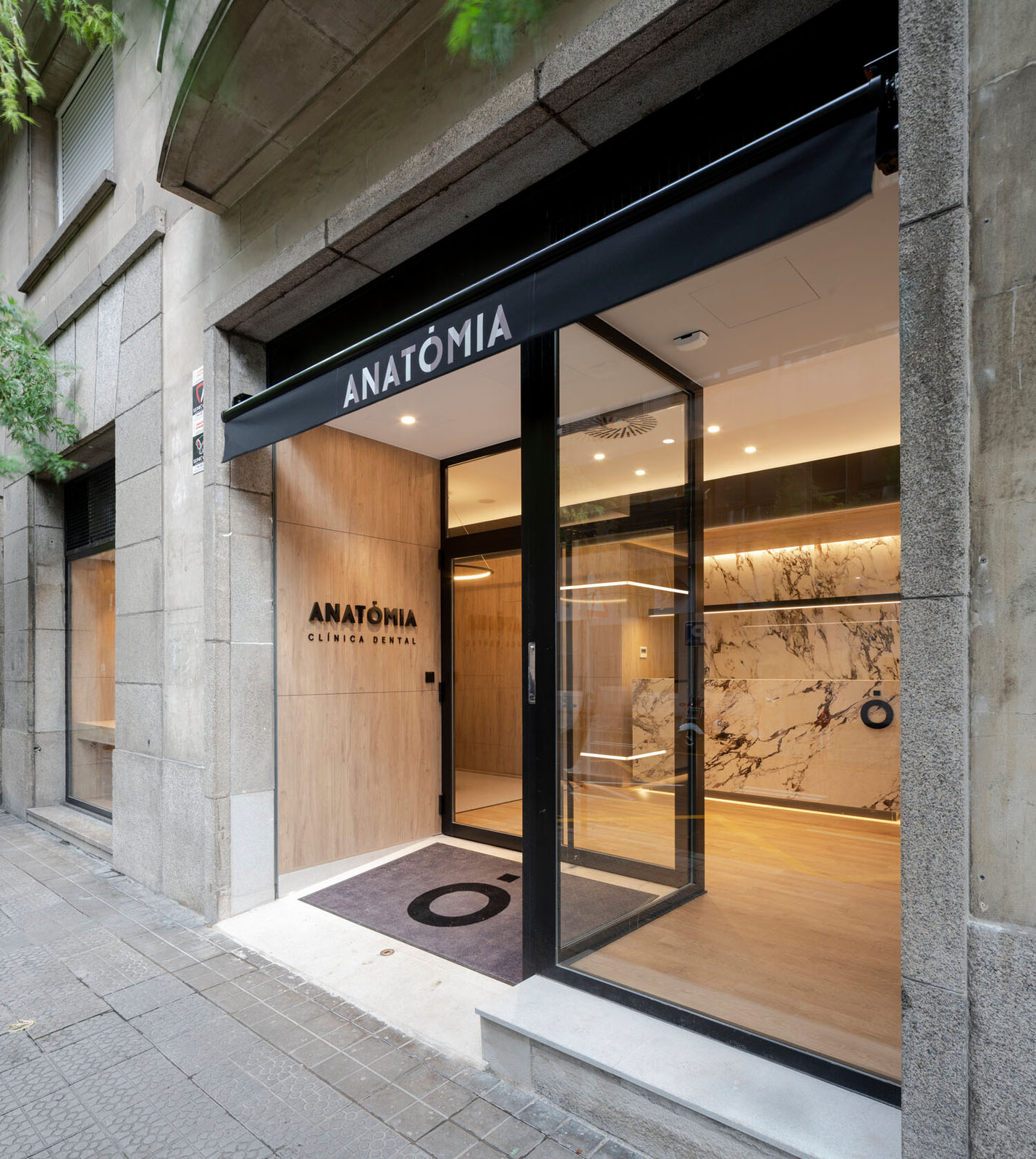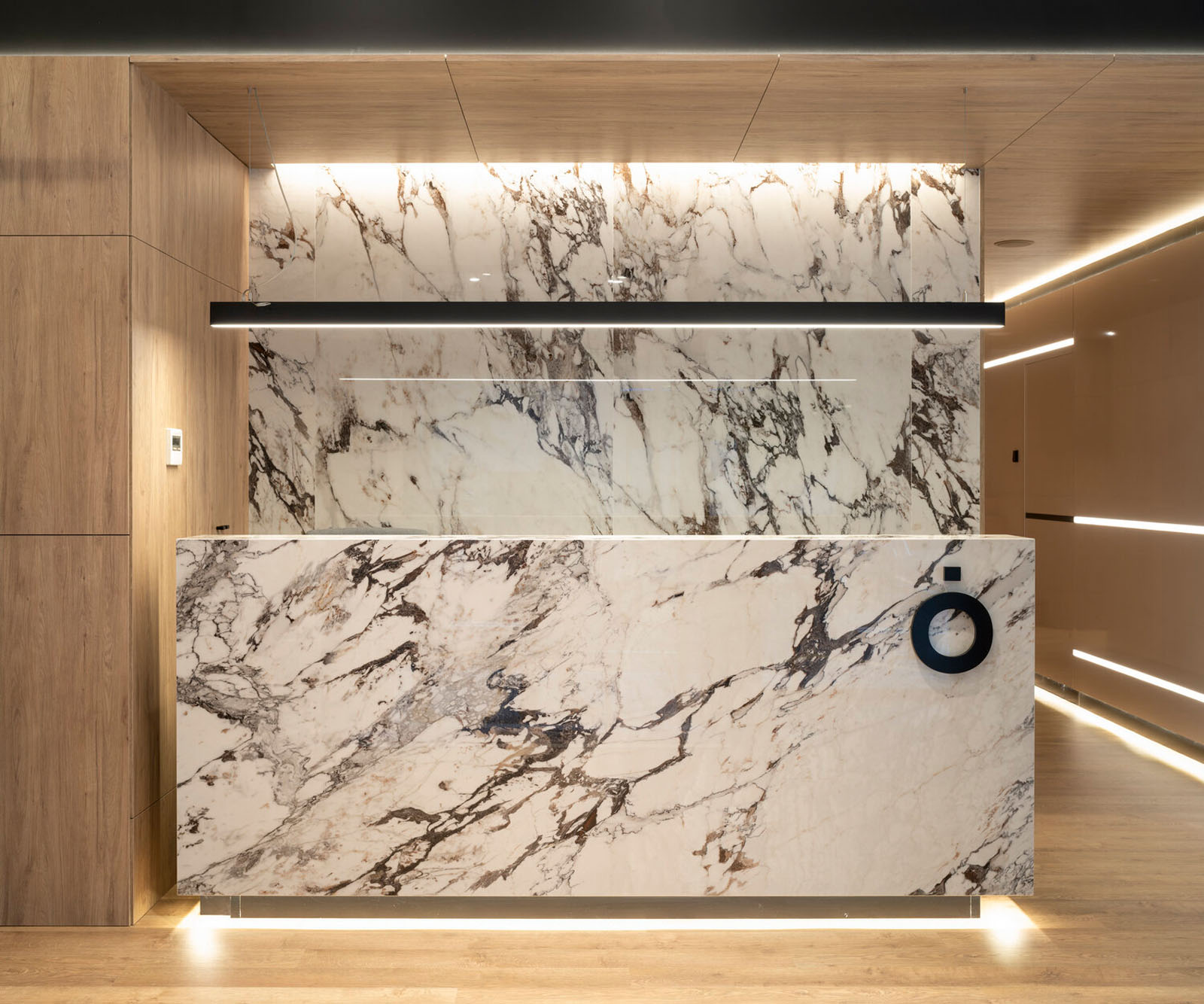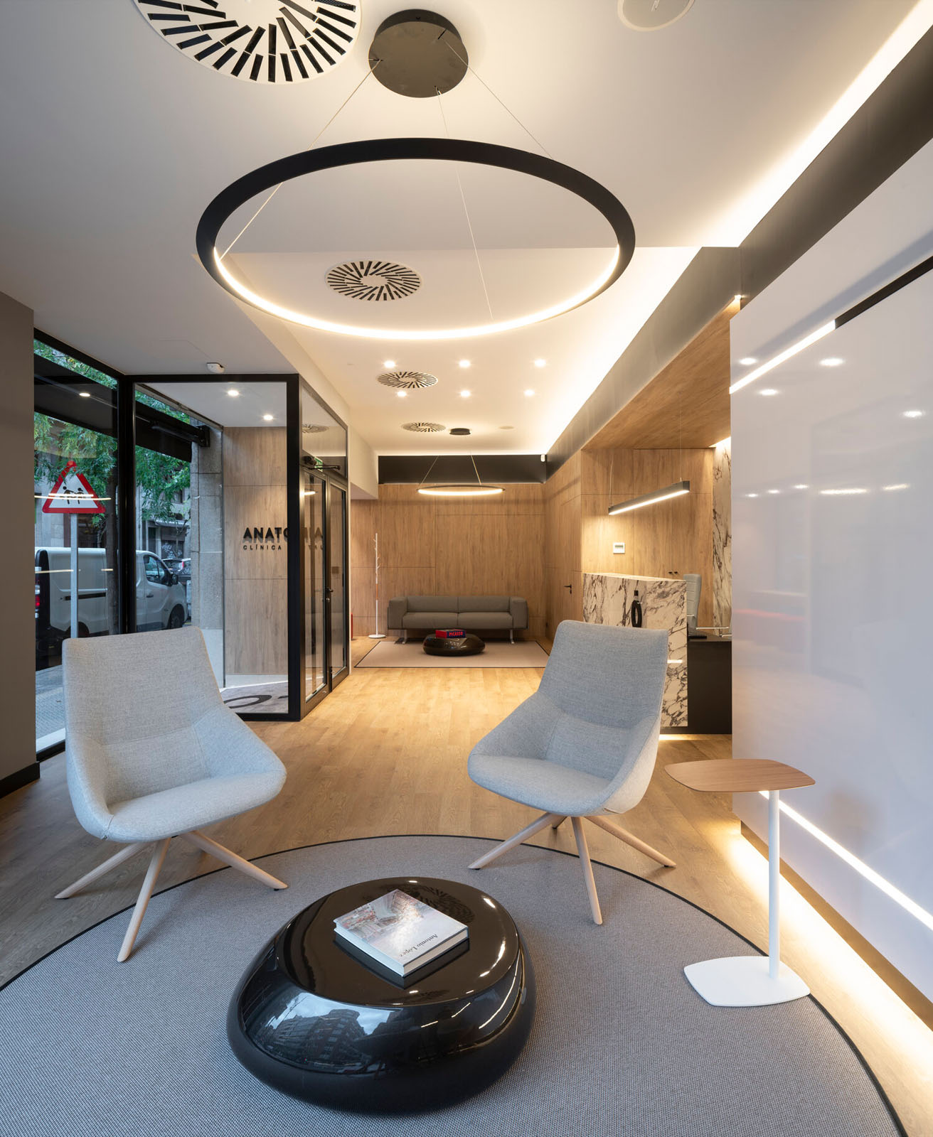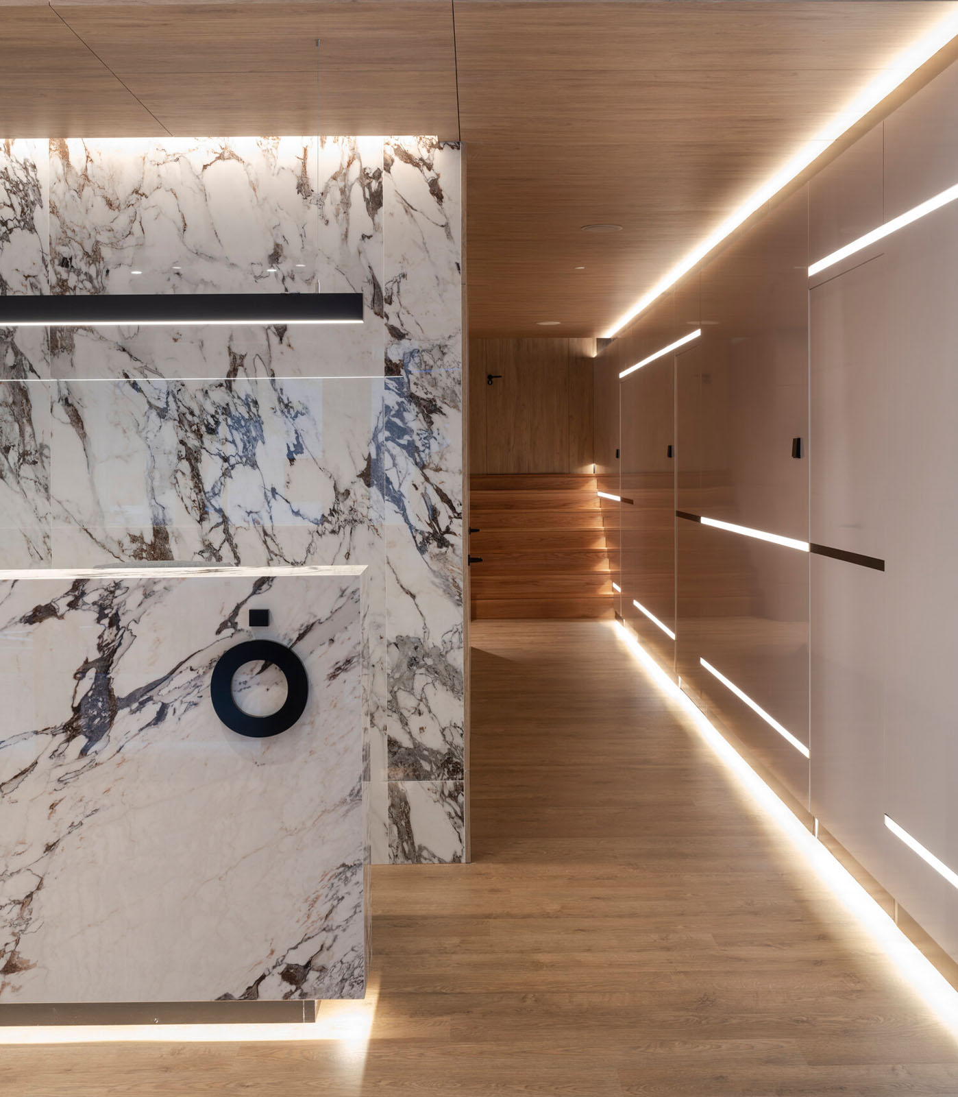 Health and educationFernando Vera of Lucio Diseño designed the Clínica Dental Anatômia in Bilbao, an innovative dental centre of excellence at c/ Rodríguez Arias 60. The new concept was developed to give clients greater comfort, with interiors furnished in contemporary style, and interplays of light and colour generated by the sometimes contrasting choice of materials, which highlight details of the interior. The elegant marble effect of the porcelain stoneware slabs of the Grande and The Top Marble Look collections, used here for floors, walls and the striking reception counter in the foyer of the clinic, as well as for the washrooms, was chosen in the Capraia variant with glossy finish in sizes 120x240 cm, with thickness of 6 mm, and 162x324 cm, thickness 12 mm, to give the interiors a modern yet refined mood, with evocations of classical architecture. The Grande Marble Look collection reinterprets 8 natural types of marble using Marazzi’s advanced digital printing technology; it is available in 4 large sizes and slimline thicknesses, and its technical characteristics include impressive strength, light weight and ductility.
