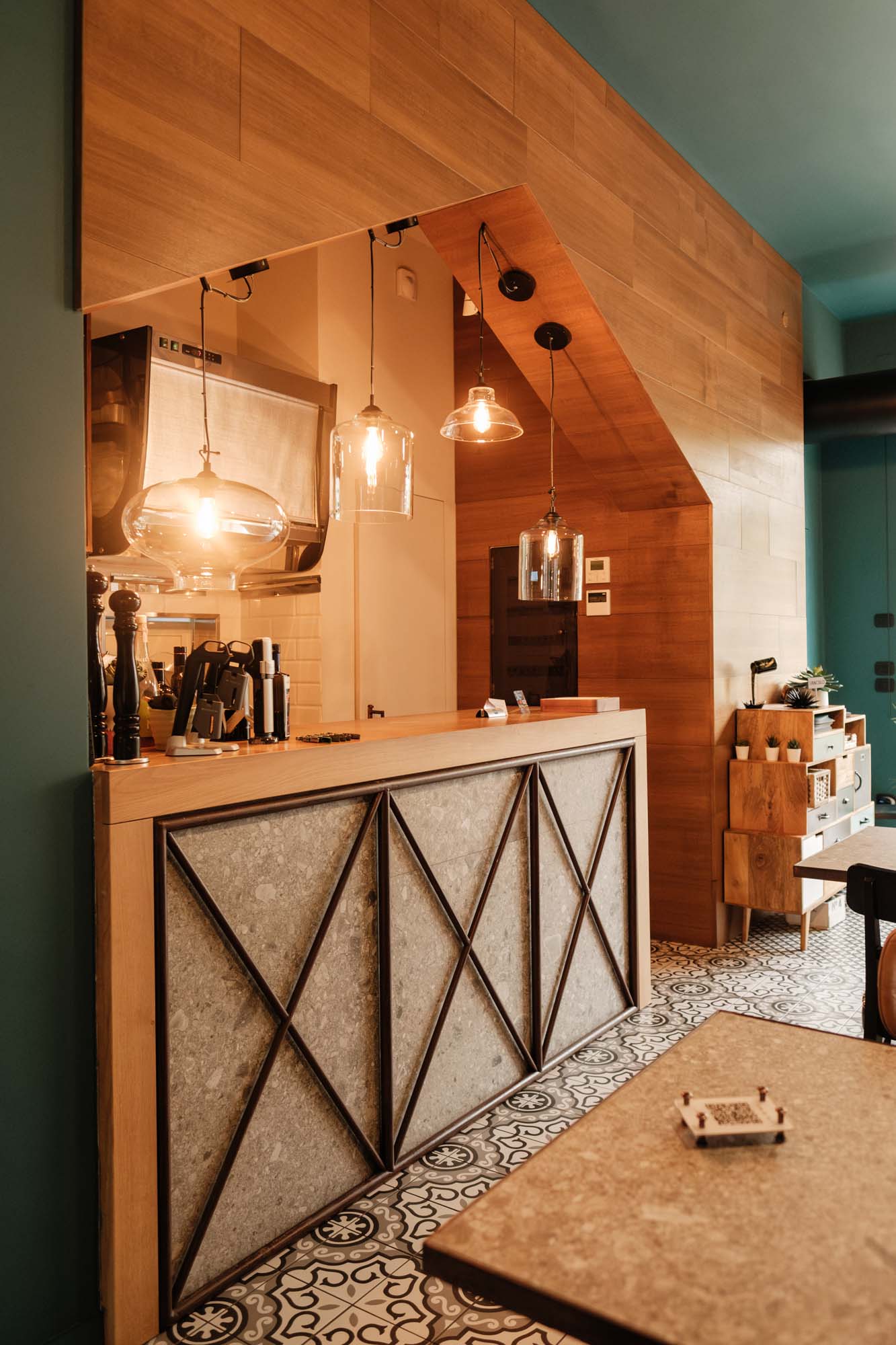 Ample use was made of Marazzi porcelain stoneware in different sizes and with a variety of decorative characteristics in the Di Sotto wine bar. “I took as my starting-point the warm shade of the wooden furnishings such as the top of the bar counter and the decorative features on the walls, and then established a dialogue with other materials. I chose the Mystone Ceppo di Gré porcelain stoneware collection in the 75x75 cm size to cover the sides of the bar counter and the tops of the tables in the dining-room, to be combined with corten-finish iron to create a contrast between the different materials’ shades and textures. For the flooring and also, seamlessly, on some of the walls I used the Crogiolo D_Segni collection in Tappeto Macro 2 and Tappeto Micro 3 versions in the 20x20 cm size. I set out to strike a balance between an eclectic assortment of features to give the locale a recognisable identity that would rise above fashions. The decoration evokes our tradition and will retain its value over time.”