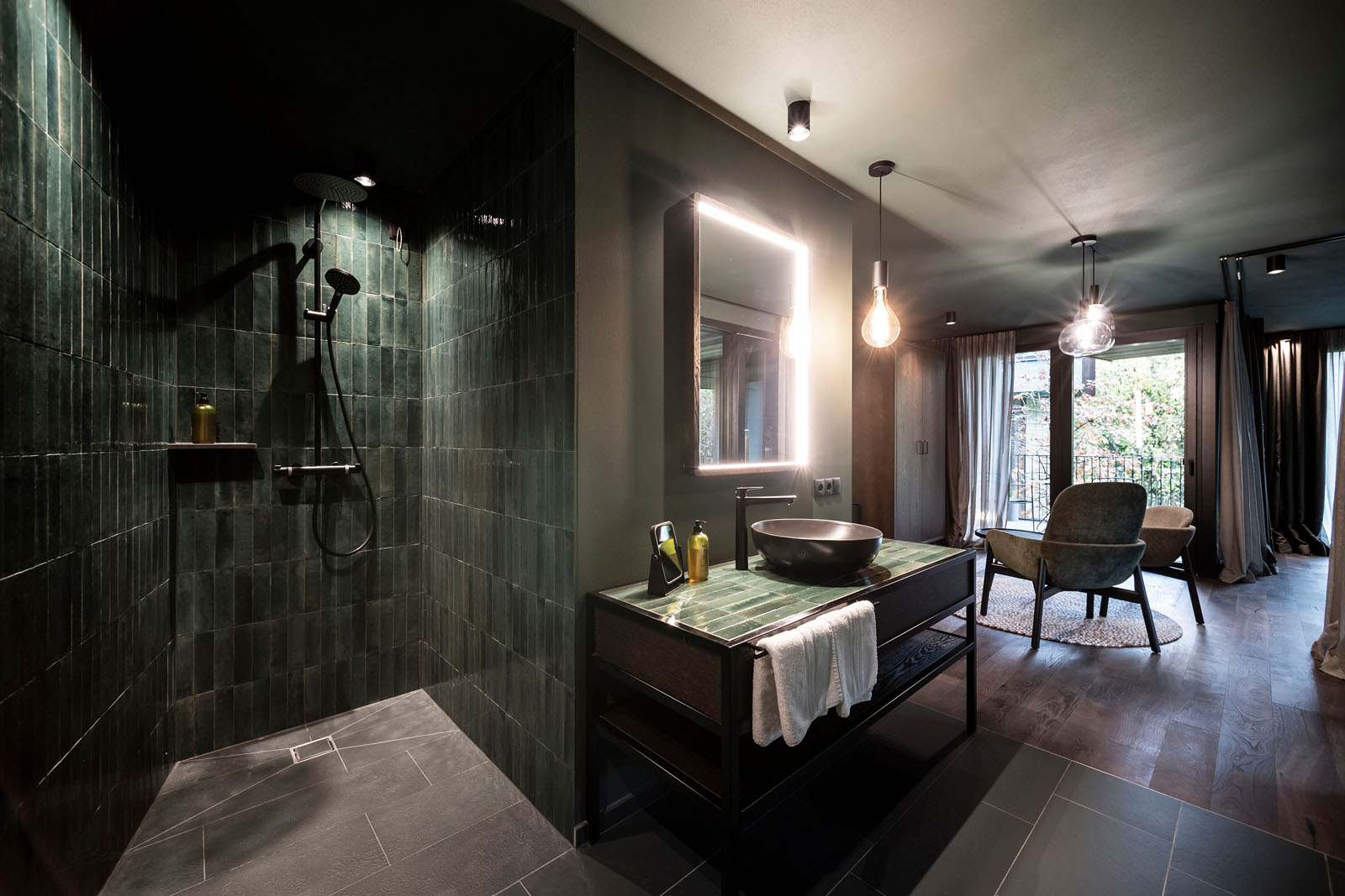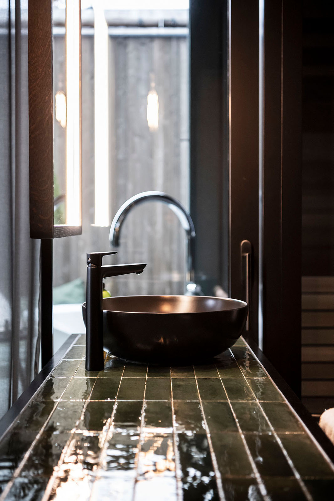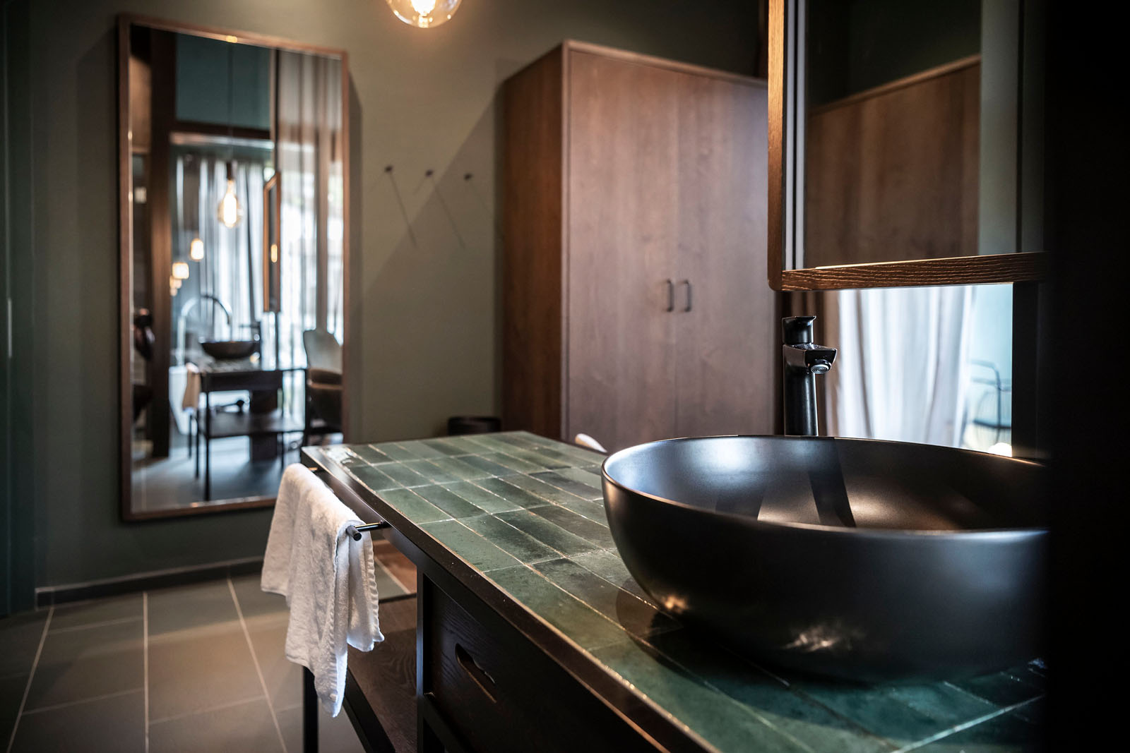 Inside, the materials and colours constantly evoke the local area. Such is the case for Crogiolo Lume, the small-size porcelain stoneware series, whose changing light refractions are masterfully used in the shower area and on the top of the freestanding washbasin in a brilliant Green colour in the new 6x24 cm size, a reference to elegant spas on the other side of the Alps.