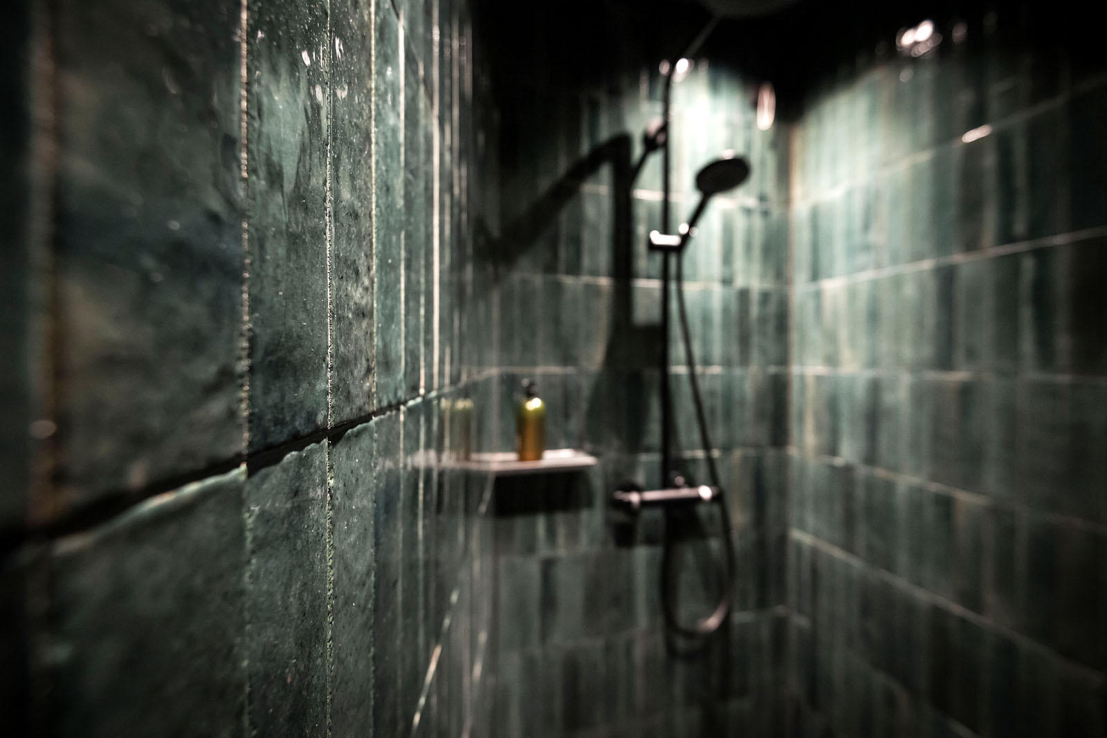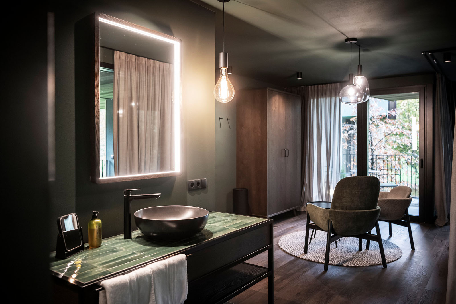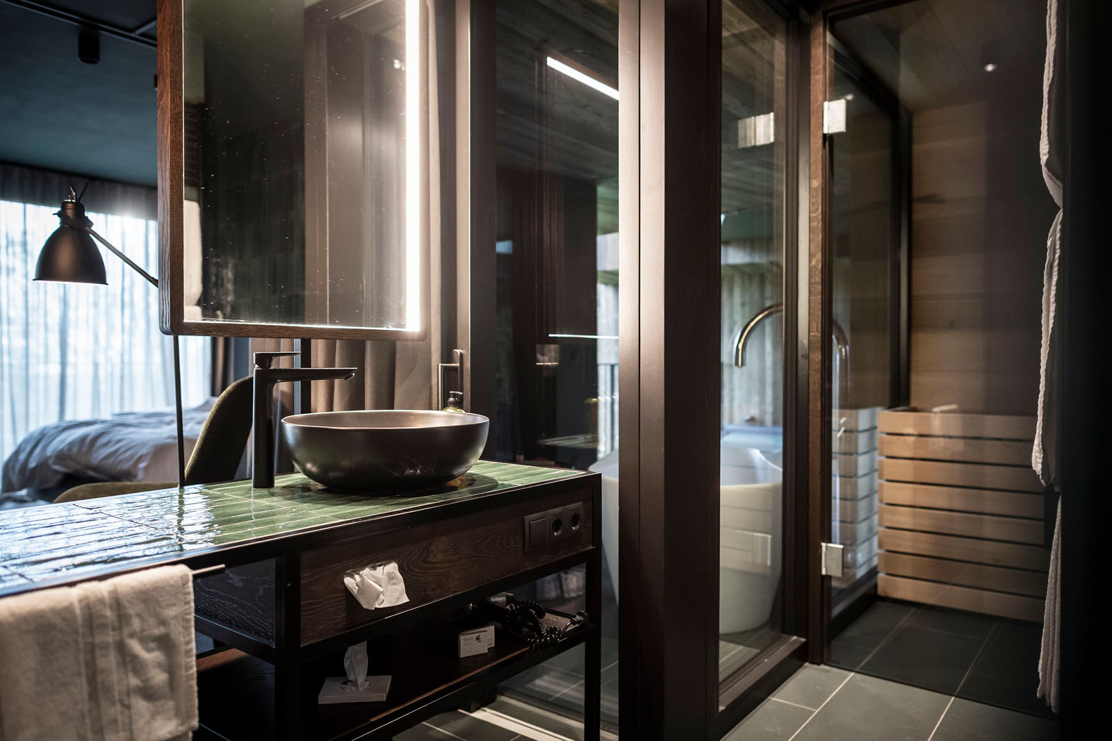 Inside, the materials and colours constantly evoke the local area. Such is the case for Crogiolo Lume, the small-size porcelain stoneware series, whose changing light refractions are masterfully used in the shower area and on the top of the freestanding washbasin in a brilliant Green colour in the new 6x24 cm size, a reference to elegant spas on the other side of the Alps.