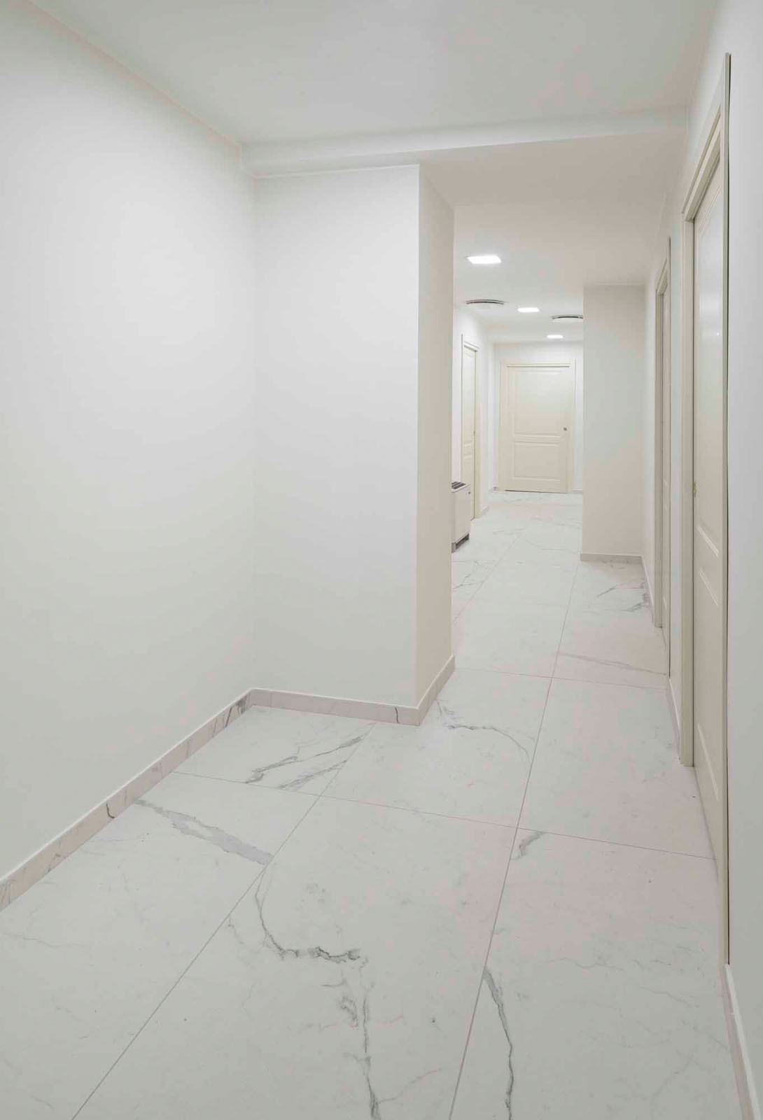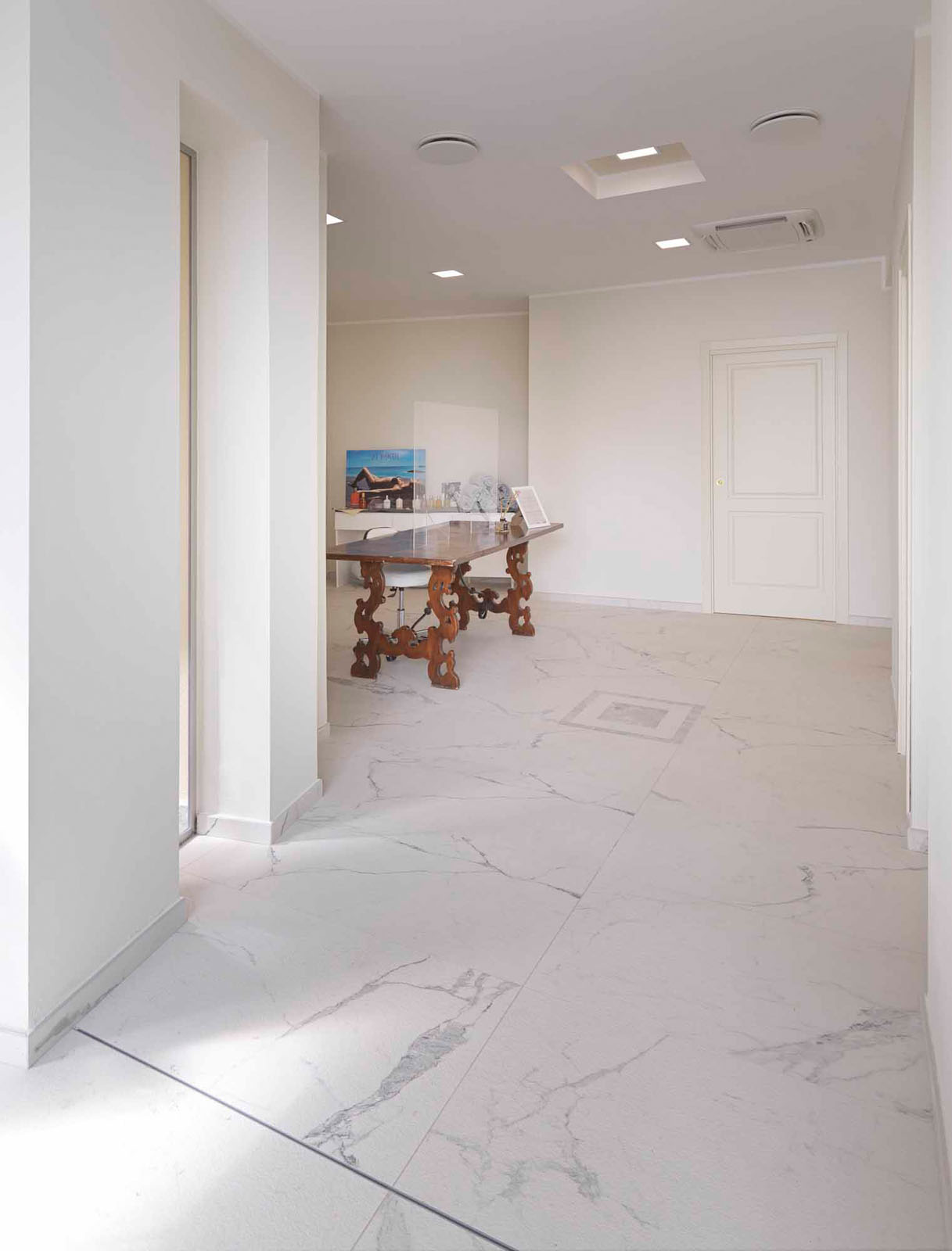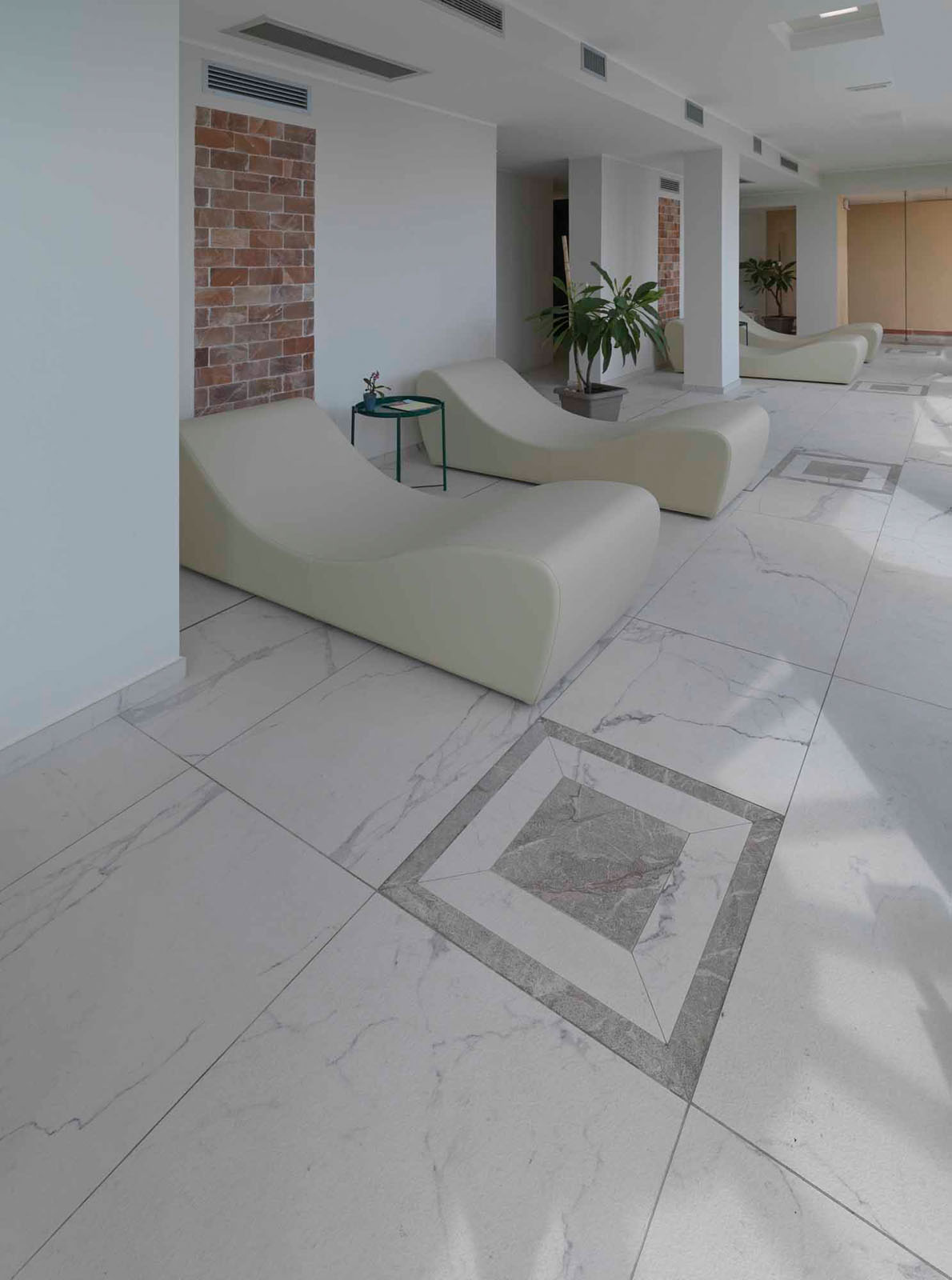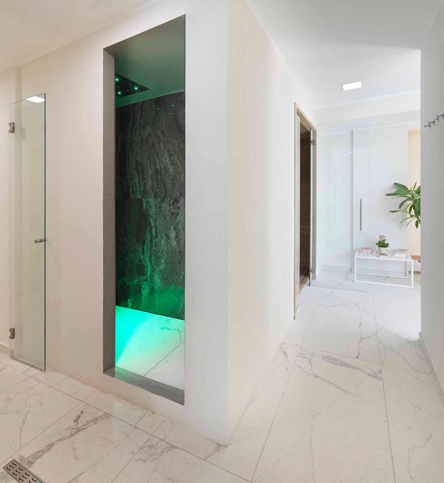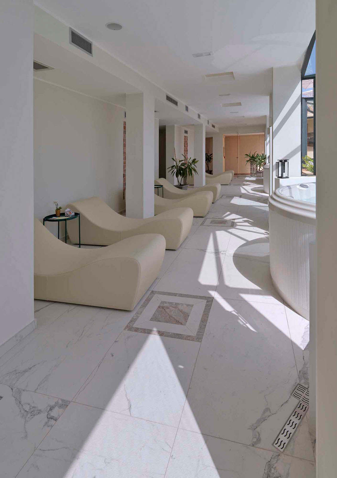 The spa, 240 m2 in area, is in almost total white. The Allmarble Statuario structured porcelain stoneware large slabs by Marazzi, in 60x120 cm size, alternate with decorative panels created using two colours from the Allmarble Lasa collection (lux and satin) in 60x120 cm, cut to size as required.