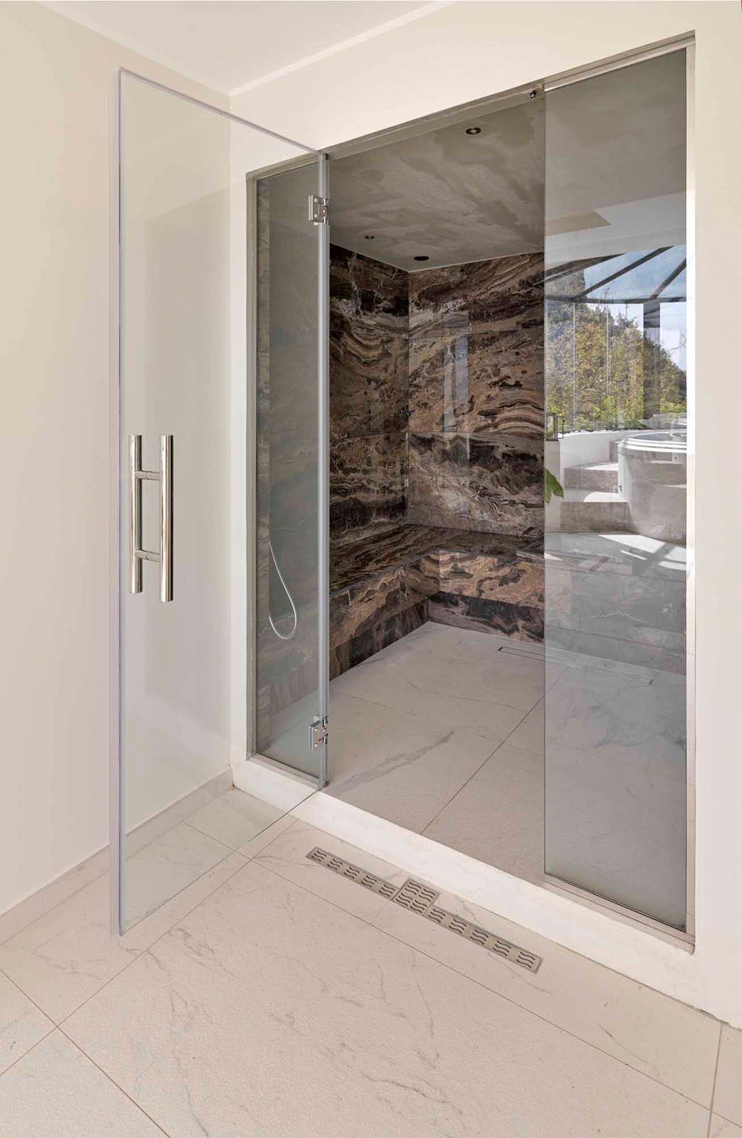 Allmarble Frappuccino lux and Allmarble Saint Laurent lux (60x120 cm) were chosen for the wall coverings of the bathrooms, Turkish bath and emotional shower; placed in the innermost area, they evoke the impression of being in underground caves carved by water.