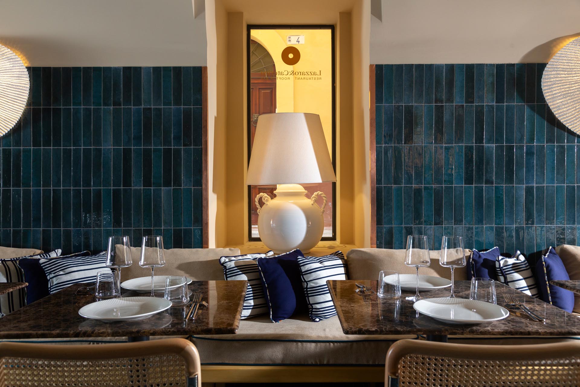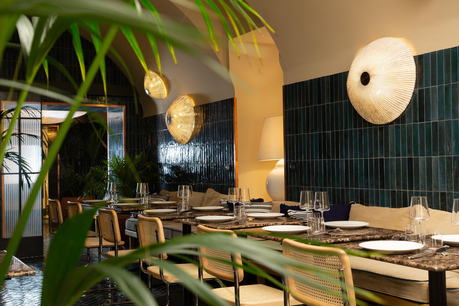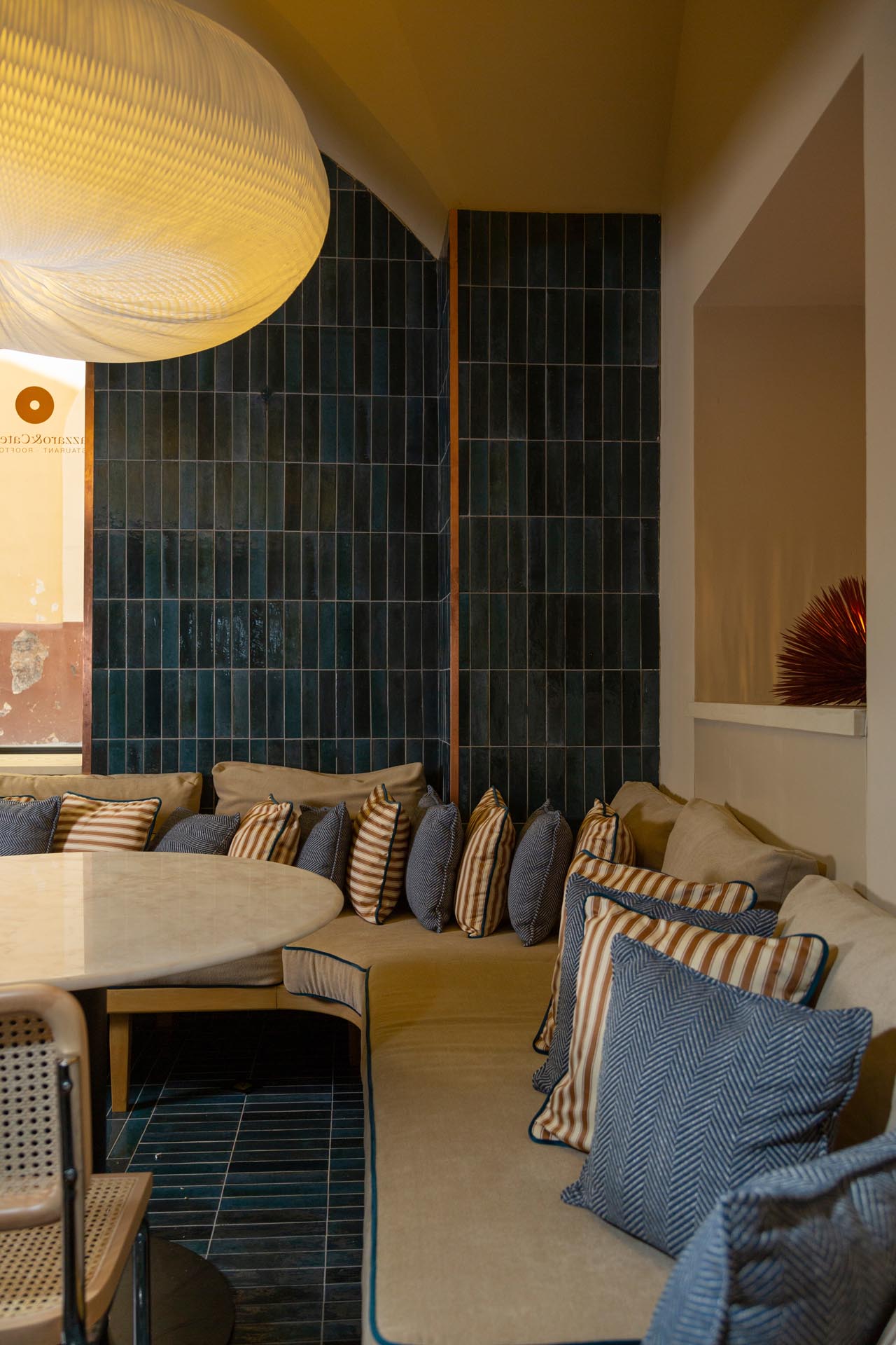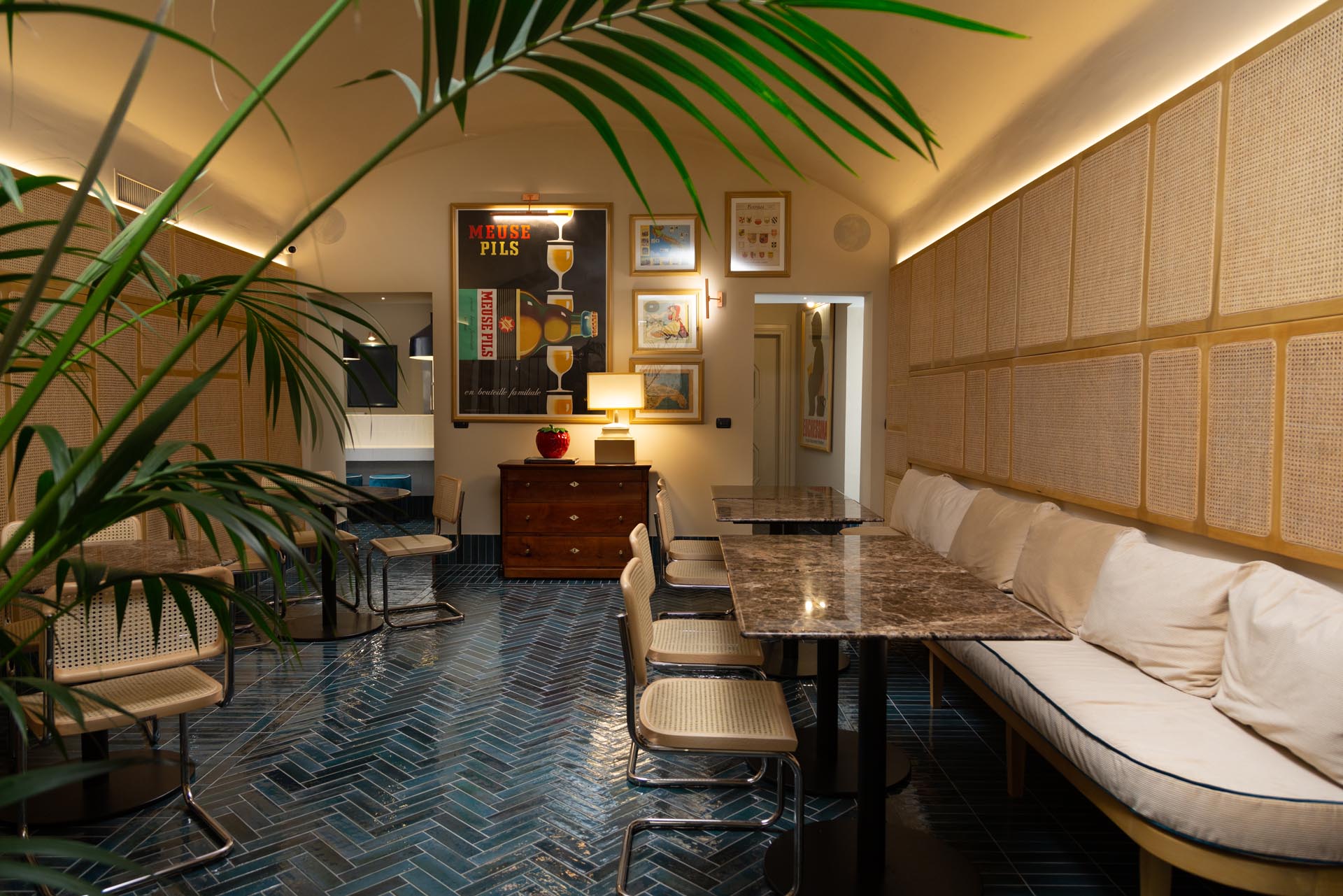 The interior design features an early C20th colonial mood, underlined by details such as an antique chest-of-drawers, Thirties posters and touches of palm-like green. An oak bench with light brown cushions runs around the walls, facing the chairs with woven cane seats and tables with beige stone-look tops: these light-coloured furnishing details contrast with the deep blue of the tiles all around. So the design scheme is based on sandy shades and colours of the depths of the sea.