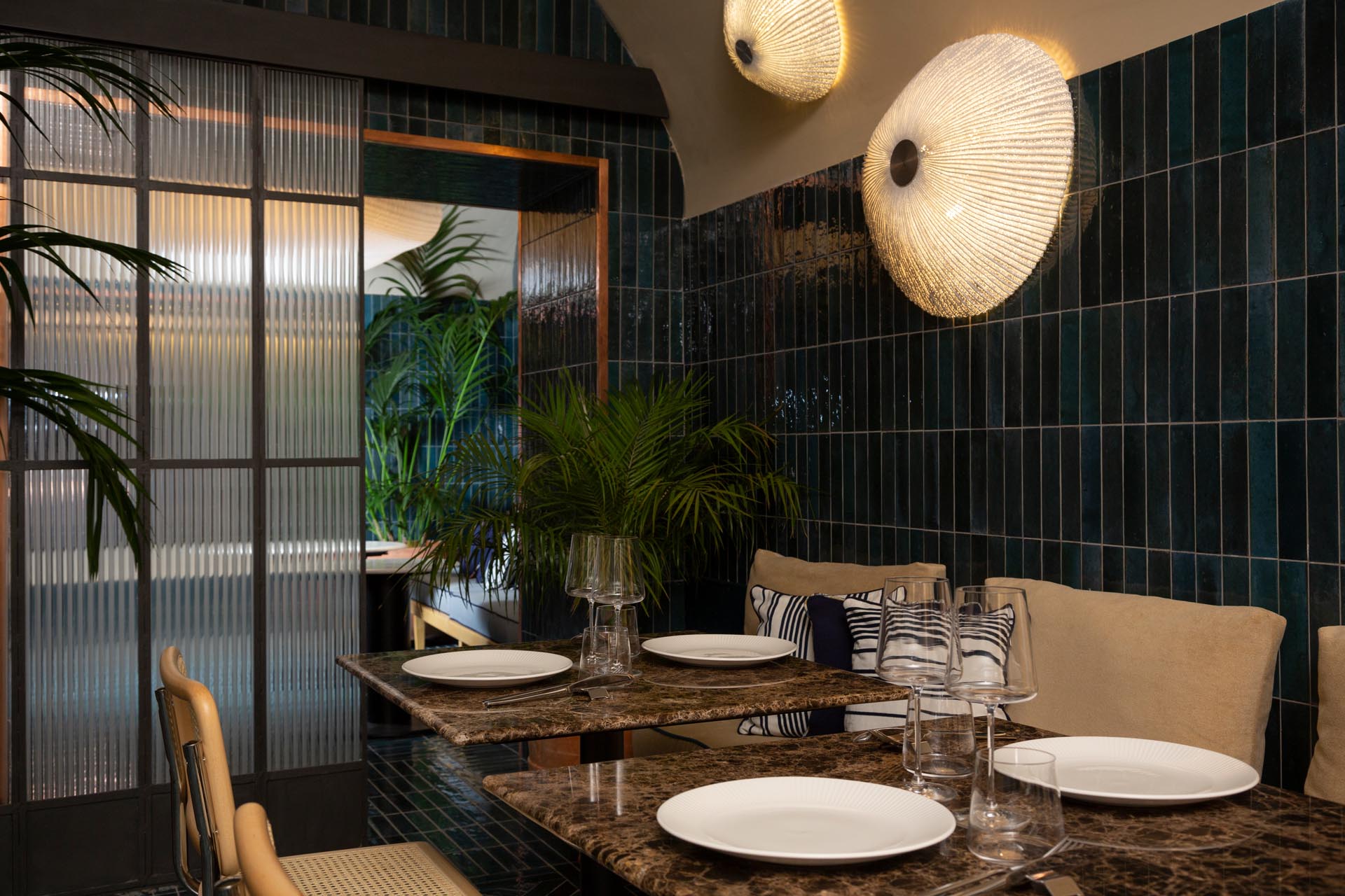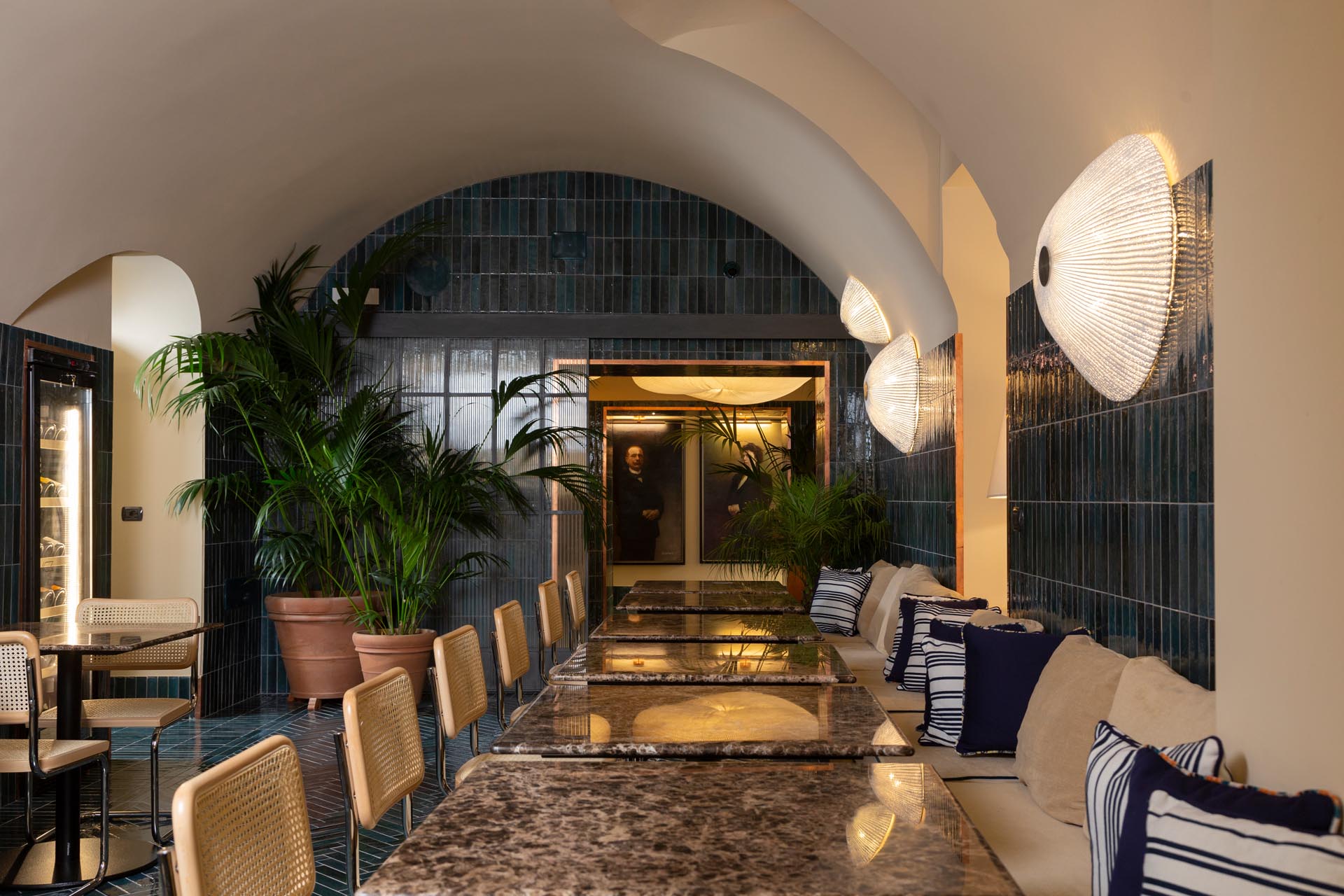 The restaurant was created by combining and renovating four apartments, with a long, narrow dining-room to which the architects brought fluidity and variation through lavish use of Crogiolo Lume tiles in Blue colour, used on both the walls and the floor. “In the floor,” explains architect Mattia Pareschi of AtelierP, “we certainly aimed for a uniform background but we also wanted subtle variations in colour, while still using the same material. To give the impression of the nearby sea, we used Crogiolo Lume iridescent brick tiles to cover the walls up to a certain height. This amplified the shade variations and highlighted the furnishings, such as the sofas or the other marble-effect surfaces.”