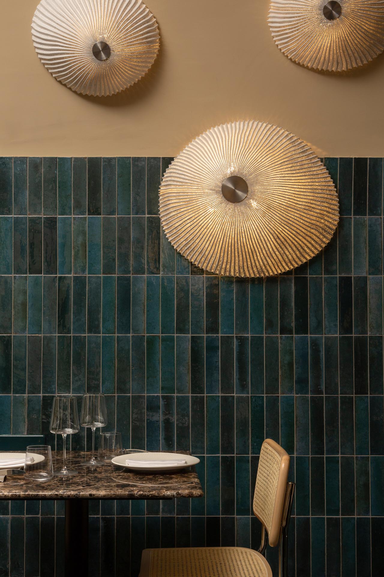 Although the restaurant is slightly below street level, natural daylight floods in through the large windows which give onto the narrow street of the old town, and is reflected in the majolica-look brick tiles to generate a constantly changing iridescence. To conclude, the marine concept is evoked by the Medusa-like wall lamps by Arturo Álvarez and the recycled paper lamps by Molo Design, which hang in the bar area like two sea-anemones.