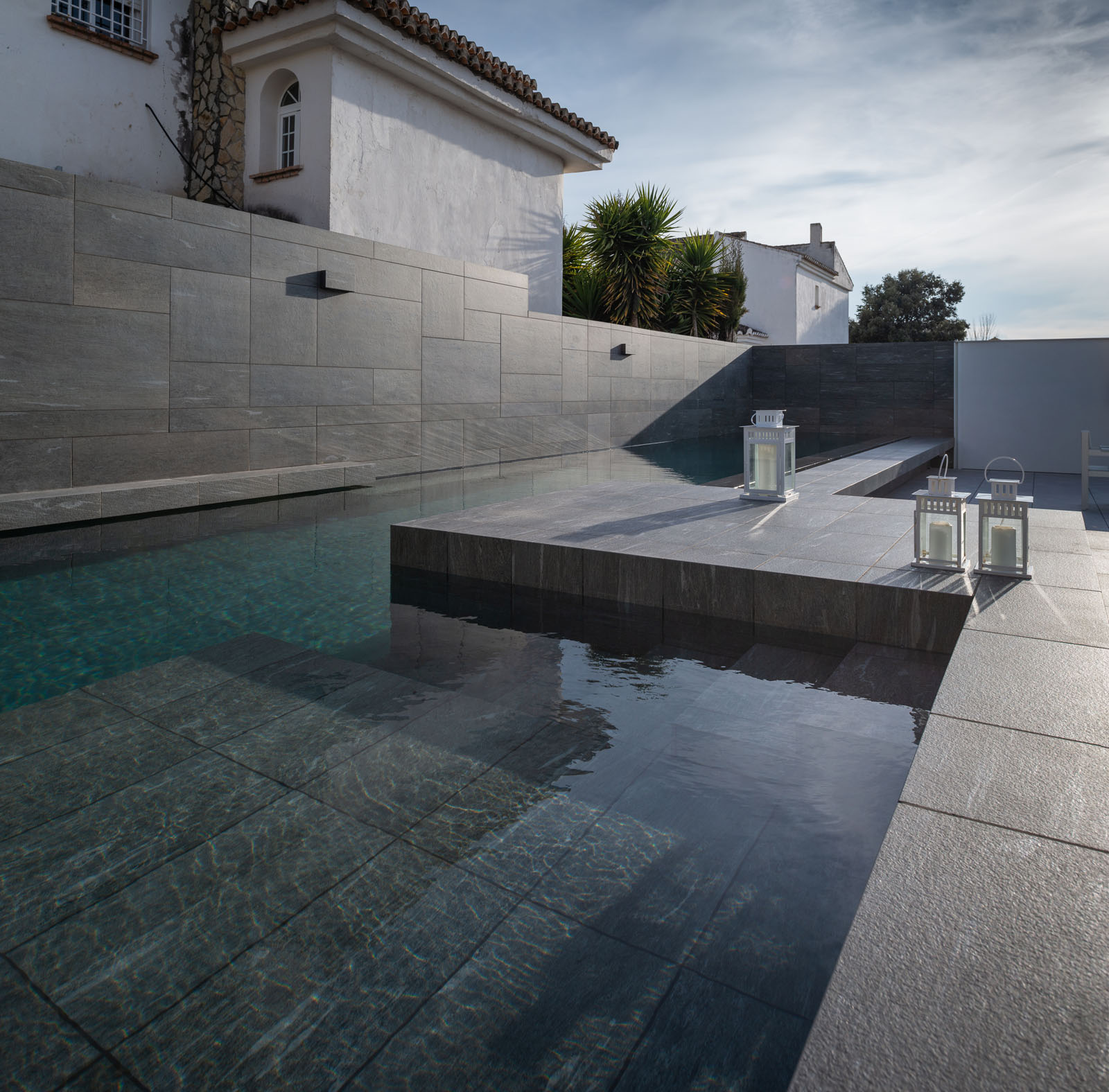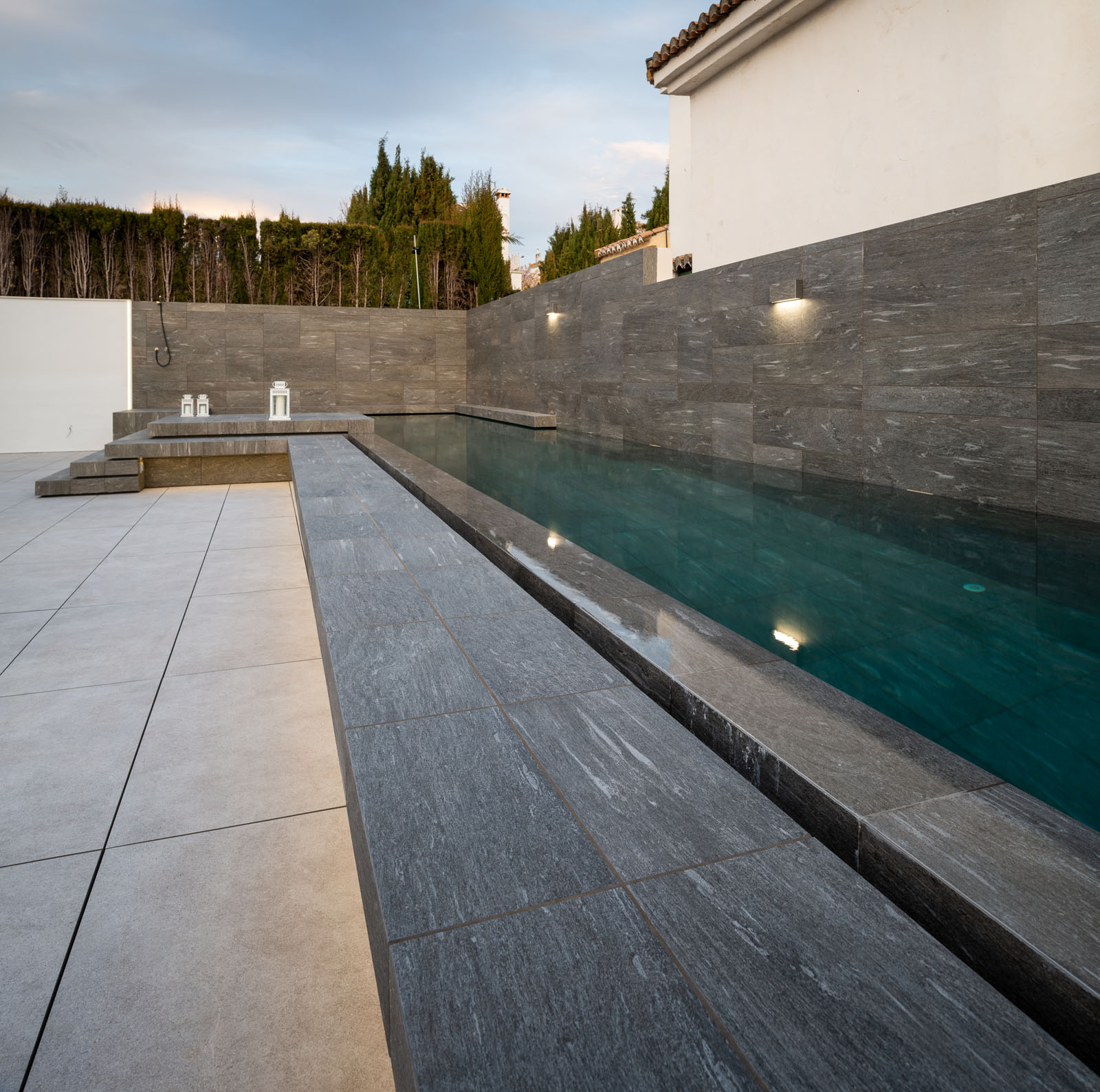 The garden surrounding the building contains a swimming pool area, which is particularly pleasant in the warm Andalusian climate. Marazzi’s Mystone Pietra di Vals series, created with High Performance technology, is the collection used for the horizontal and vertical covering of the pool, edges, steps and shower areas, chosen for its outstanding non-slip, tactile and weather-resistant qualities. Made of porcelain stoneware – here in Antracite finish, but also available in Greige and Grigio – it offers an incredible reproduction of the roughness and aesthetic appeal of quartzite. The different sizes used for vertical installation – 60x120, 30x120, 60x60 and 30x60 cm – and those used for horizontal installation in the non-slip version, are available to designers and accentuate the realistic randomness of natural stone installation.