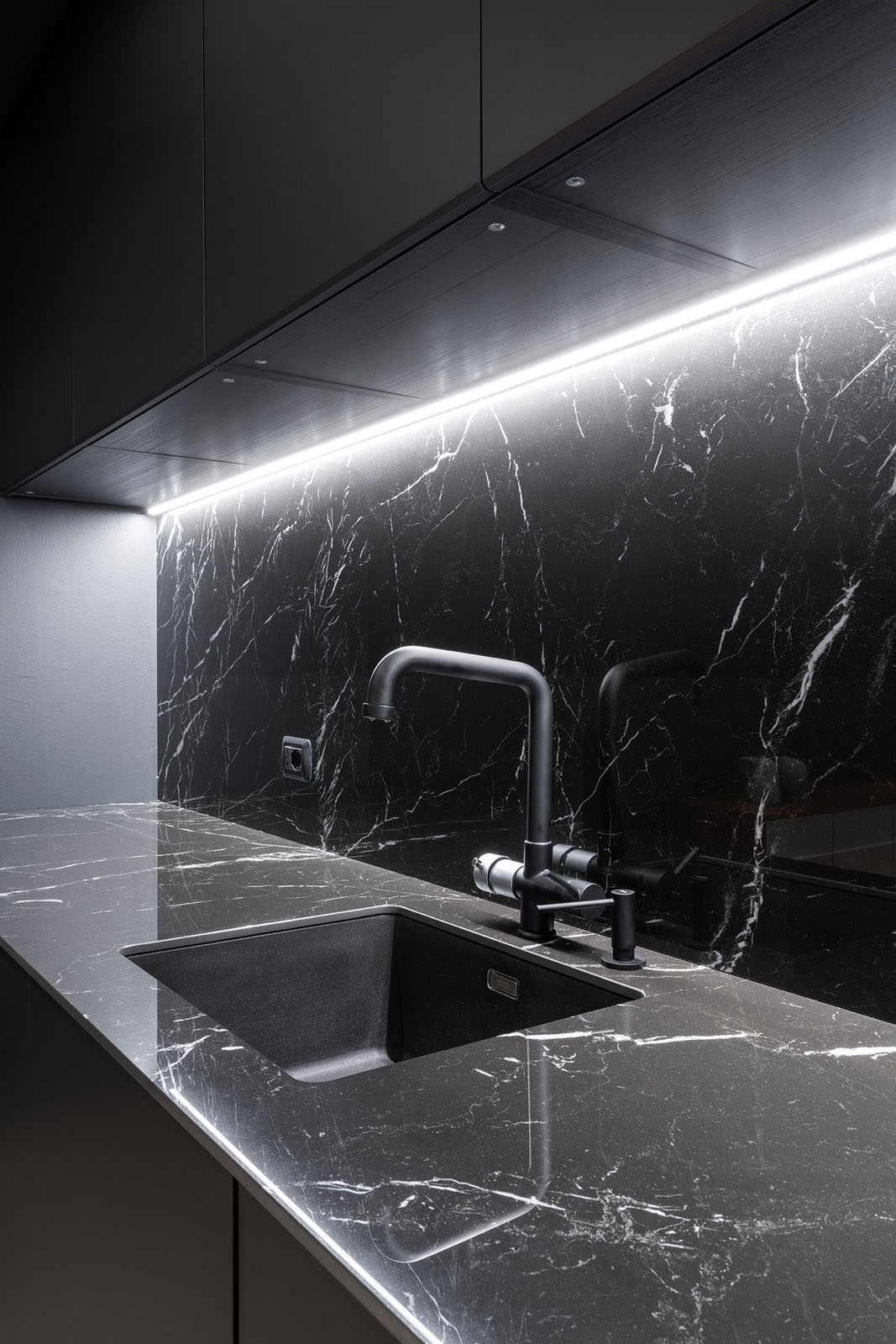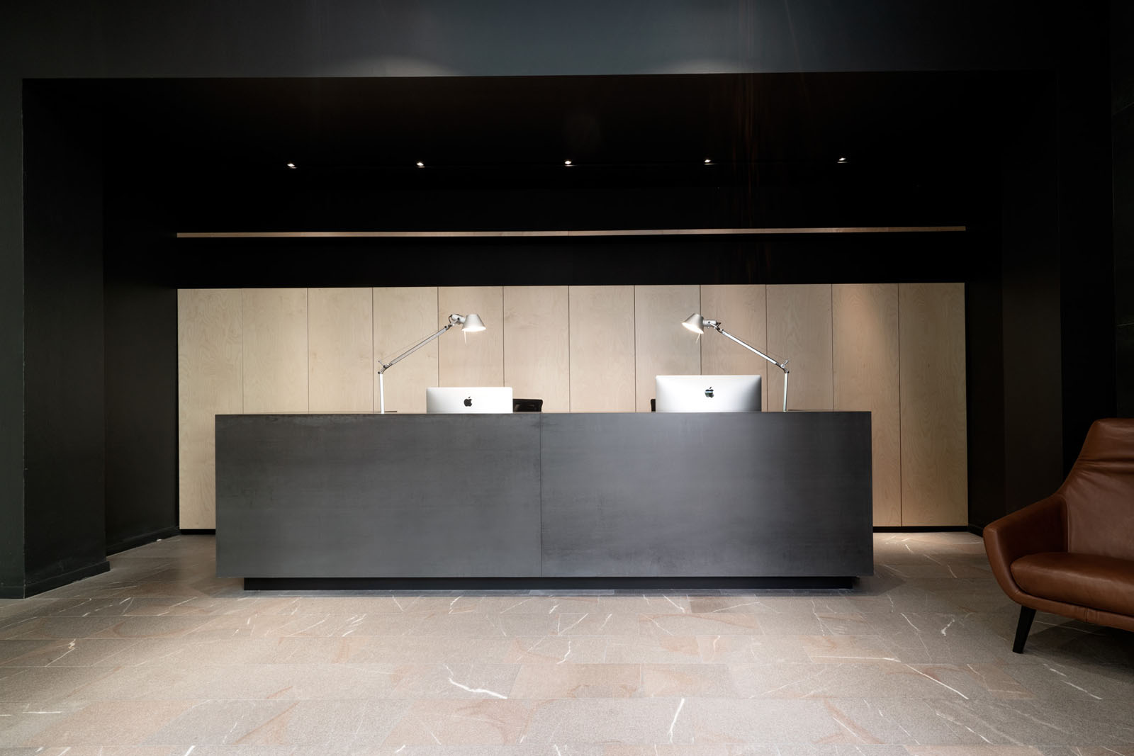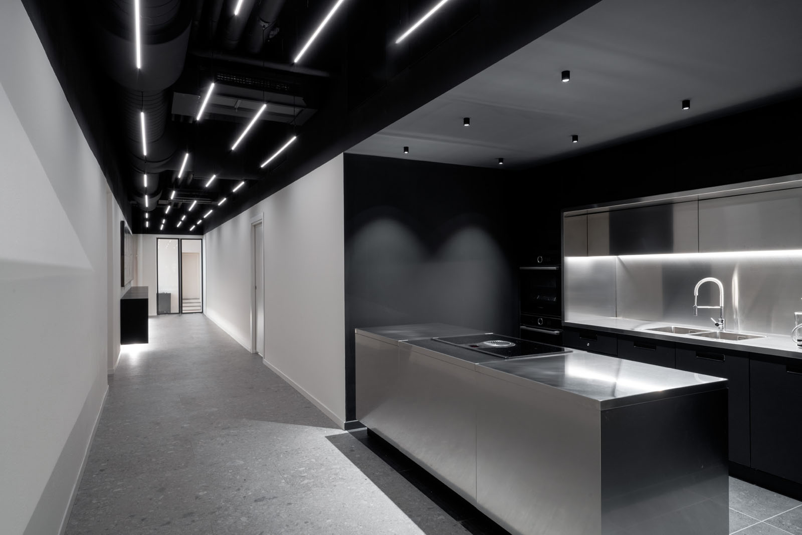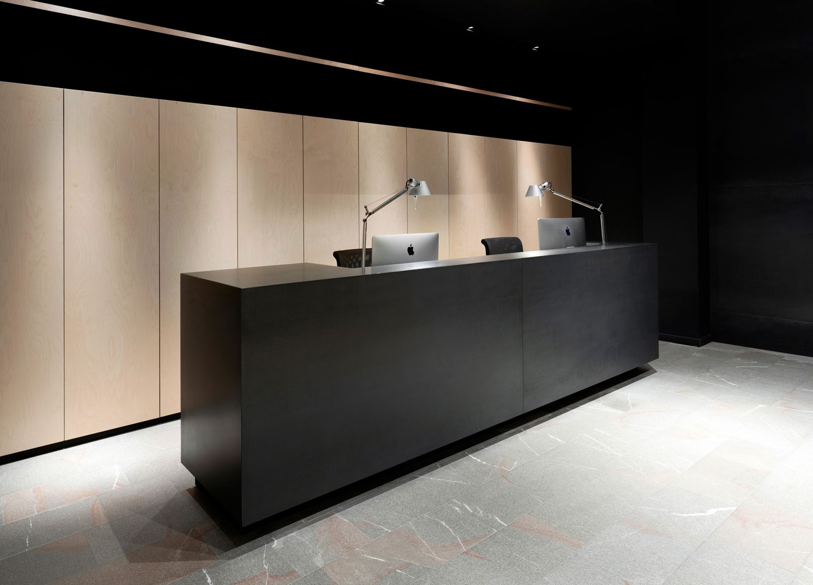 Mystone Ceppo di Gré and Gris Fleury were the stone-effect collections in three different shades of grey used for most of the interiors, from the foyer to the communal washrooms. Slimline thickness slabs, on the other hand, were chosen for the finishes of the kitchen (The Top Elegant Black in glossy finish) and the reception counter (The Top Metal Look in Iron Dark).