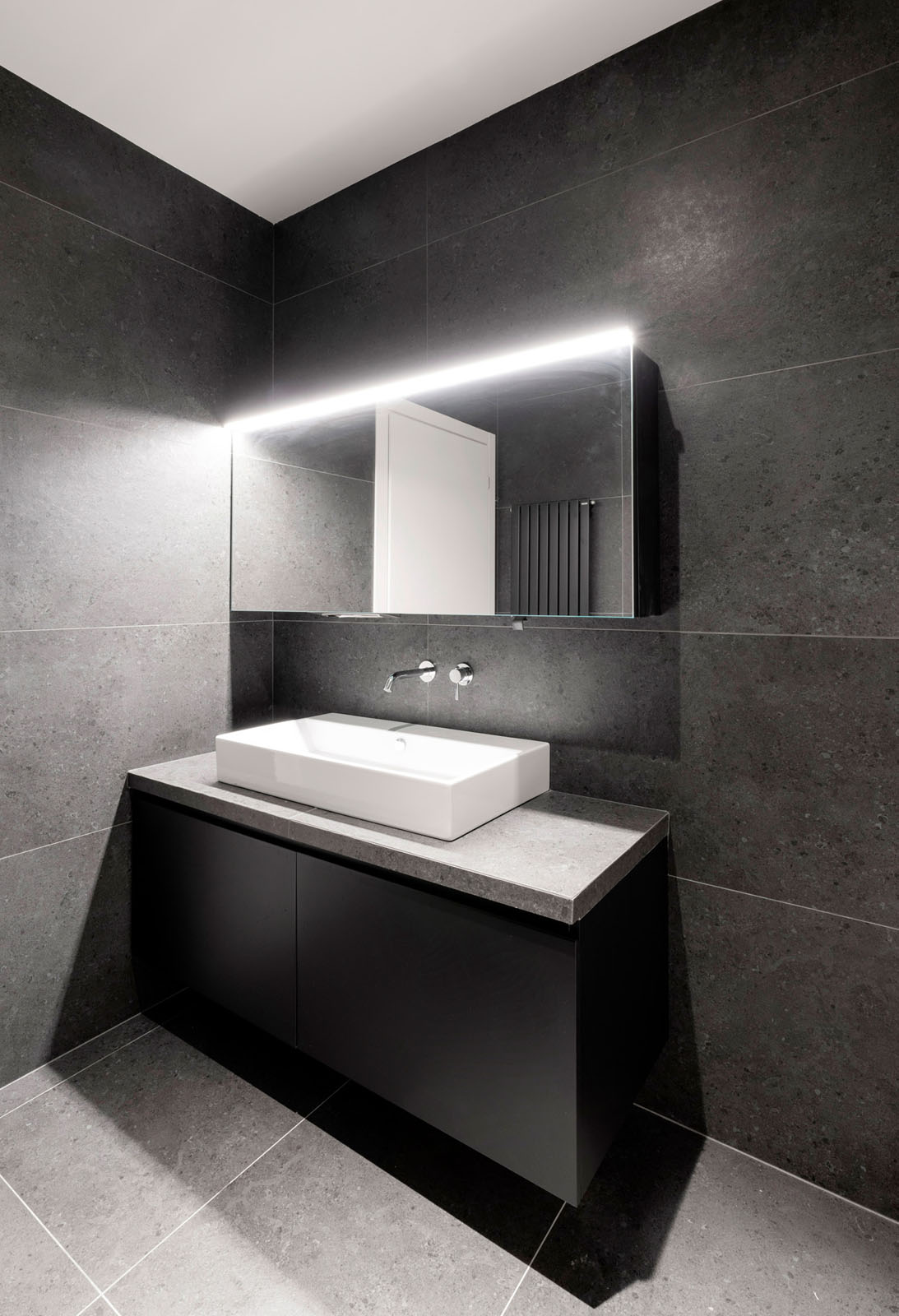 The project used five types of porcelain stoneware, chosen both as floor and wall coverings and as a finishing material.