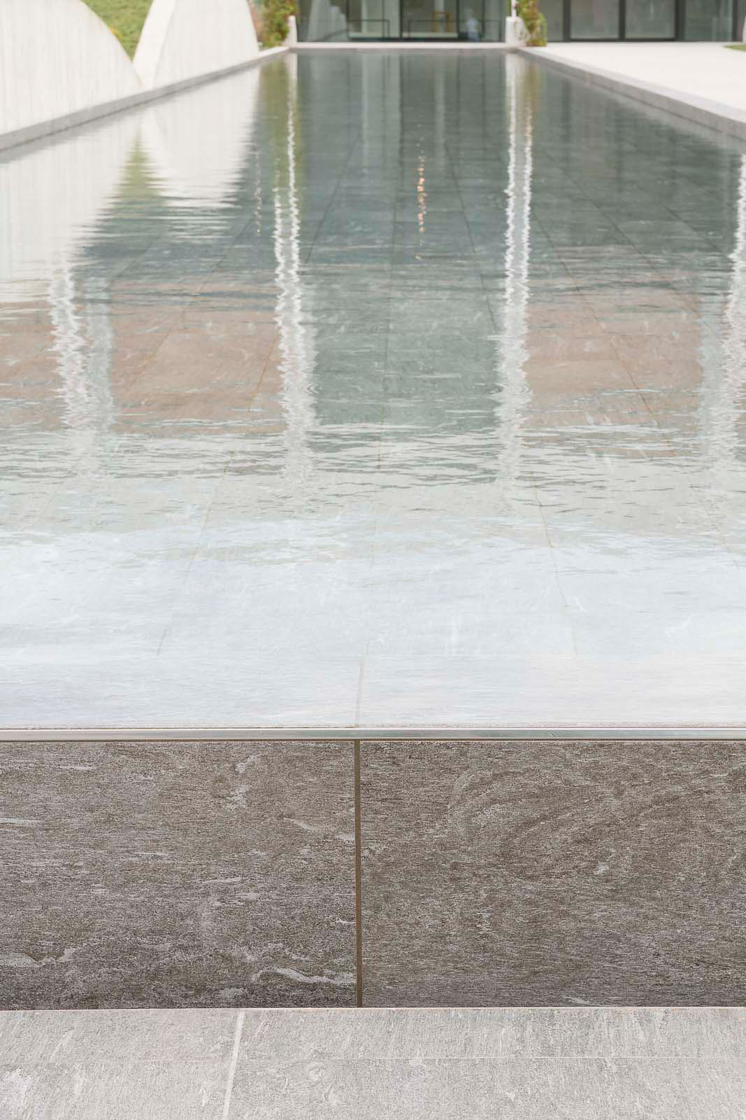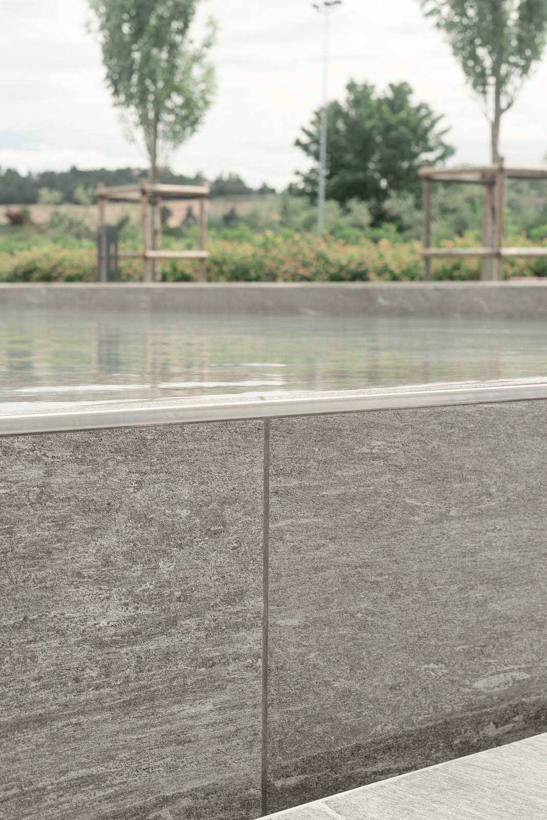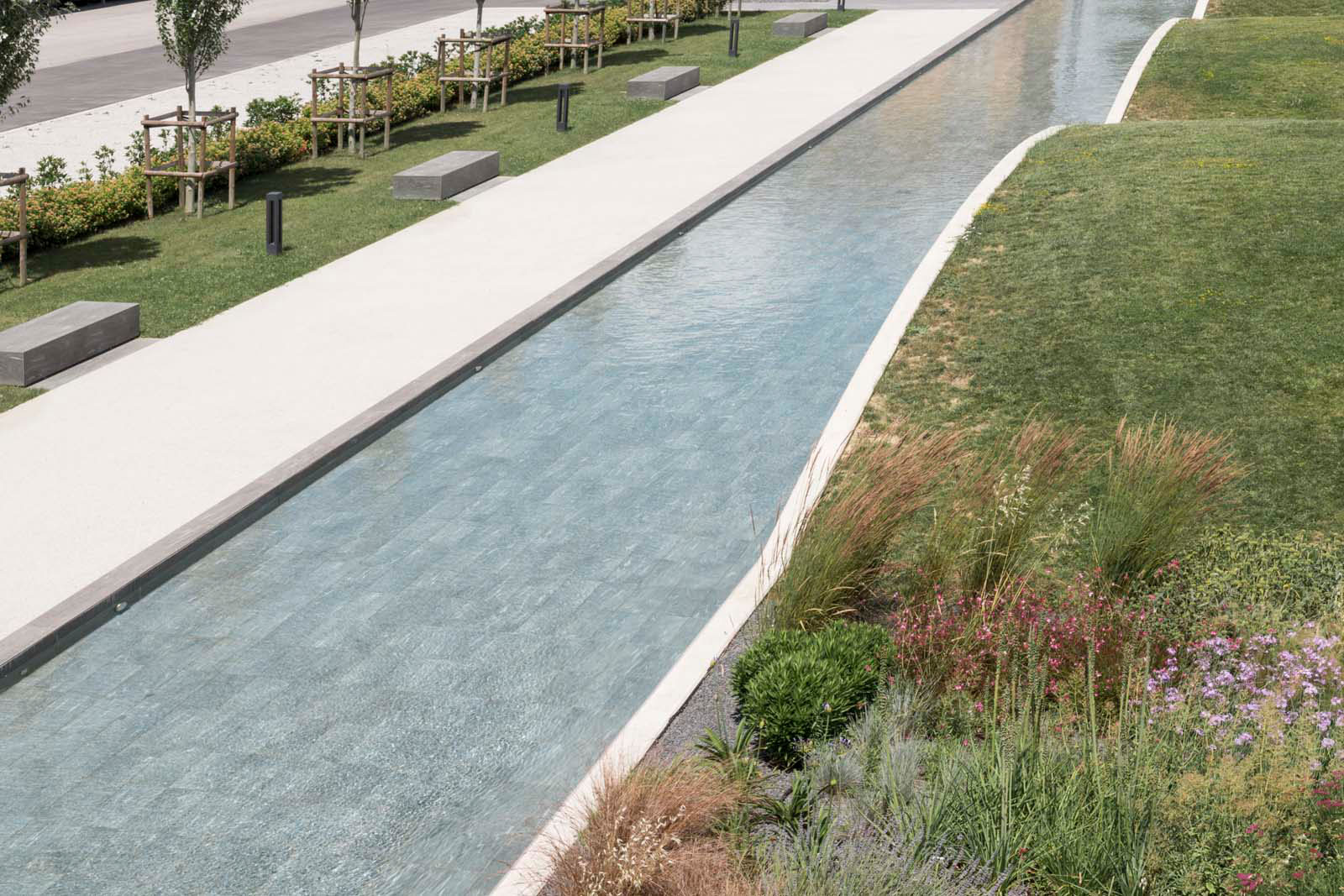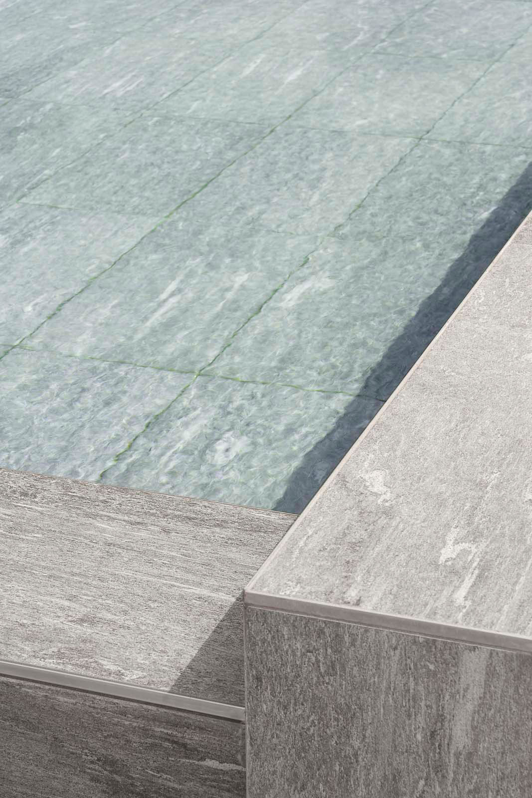 Scrigno, a manufacturer of counterframes for retractable sliding doors and windows, entrusted the redevelopment of its headquarters to architectural firms Pampa and Giacobbi Venturini Ferrini. The new design of the headquarters, located in Santarcangelo di Romagna in the province of Rimini, entailed the creation of Scrigno Lab, a dynamic space that includes the showroom and the rooms for conferences and company training. The exterior area was also renovated: the large paved square was transformed into a leafy area that forms the nucleus between the company’s various buildings (offices, warehouses and production facilities). For the panoramic terrace, the designers opted for a raised floor with 40x120 cm Mystone Pietra di Vals Antracite stone-effect porcelain stoneware with a thickness of 20 mm, while 60x120 cm Mystone Pietra di Vals Antracite was chosen for the walkways in the square. In addition to the walkways, Mystone Pietra di Vals was also used for the seats, the garden’s ornamental water feature, the desk in the conference room and the showroom.