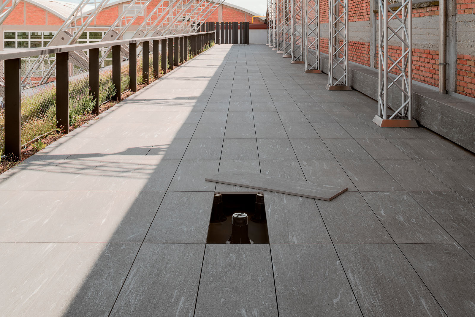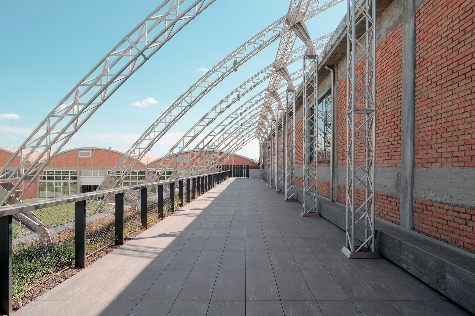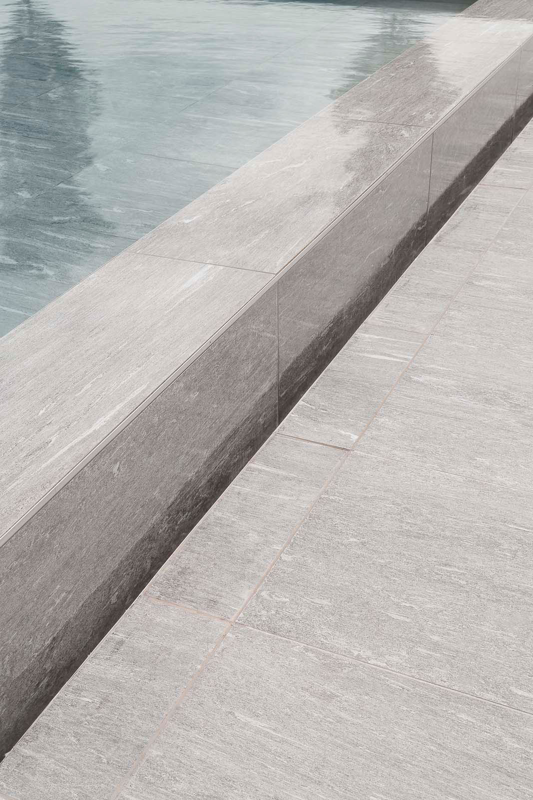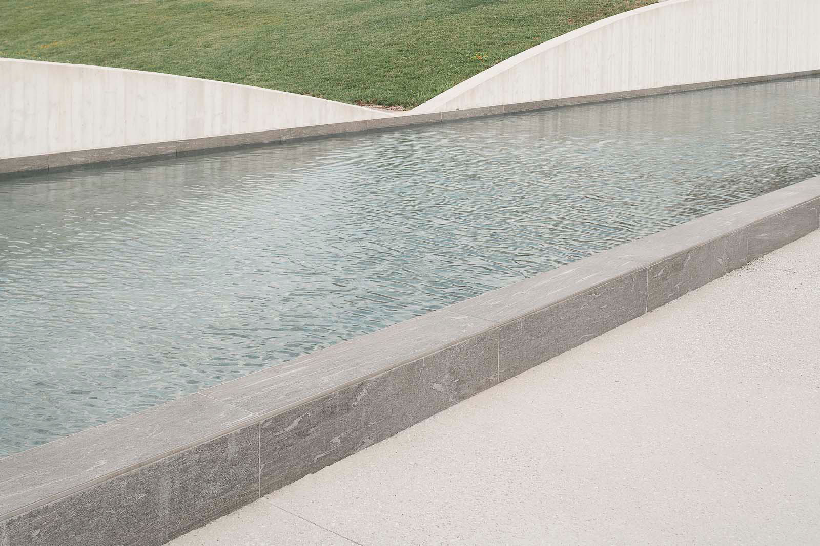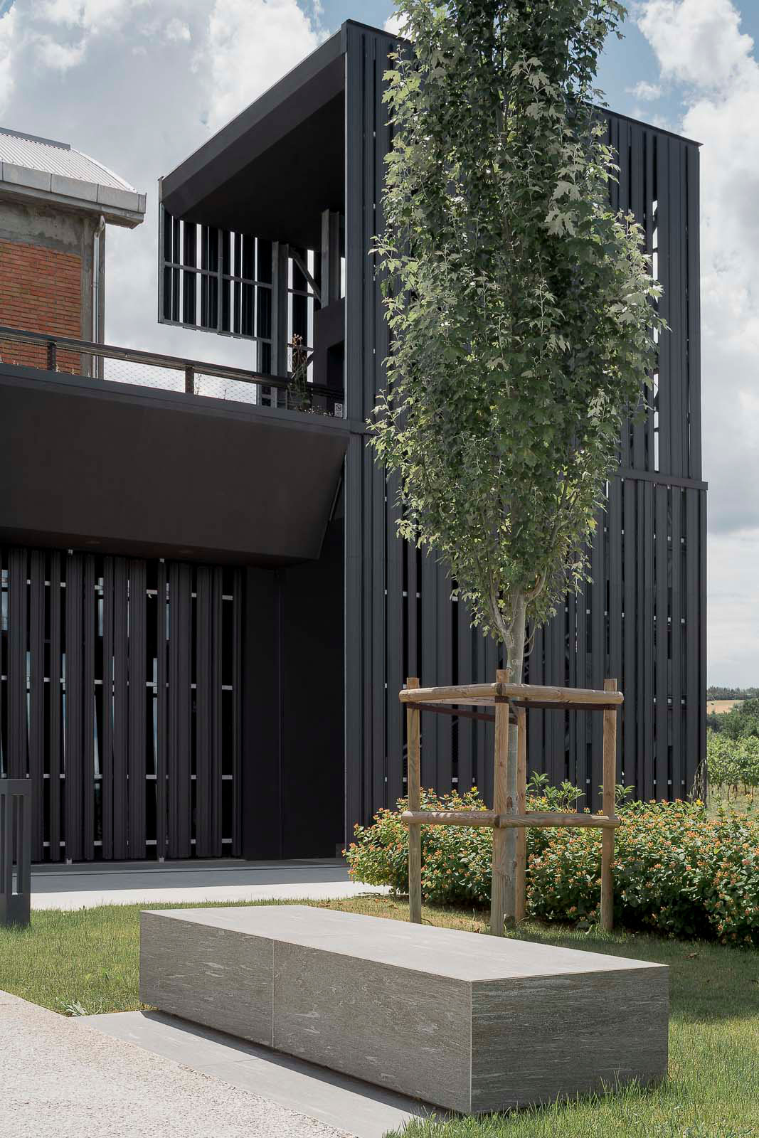 Scrigno, a manufacturer of counterframes for retractable sliding doors and windows, entrusted the redevelopment of its headquarters to architectural firms Pampa and Giacobbi Venturini Ferrini. The new design of the headquarters, located in Santarcangelo di Romagna in the province of Rimini, entailed the creation of Scrigno Lab, a dynamic space that includes the showroom and the rooms for conferences and company training. The exterior area was also renovated: the large paved square was transformed into a leafy area that forms the nucleus between the company’s various buildings (offices, warehouses and production facilities). For the panoramic terrace, the designers opted for a raised floor with 40x120 cm Mystone Pietra di Vals Antracite stone-effect porcelain stoneware with a thickness of 20 mm, while 60x120 cm Mystone Pietra di Vals Antracite was chosen for the walkways in the square. In addition to the walkways, Mystone Pietra di Vals was also used for the seats, the garden’s ornamental water feature, the desk in the conference room and the showroom.