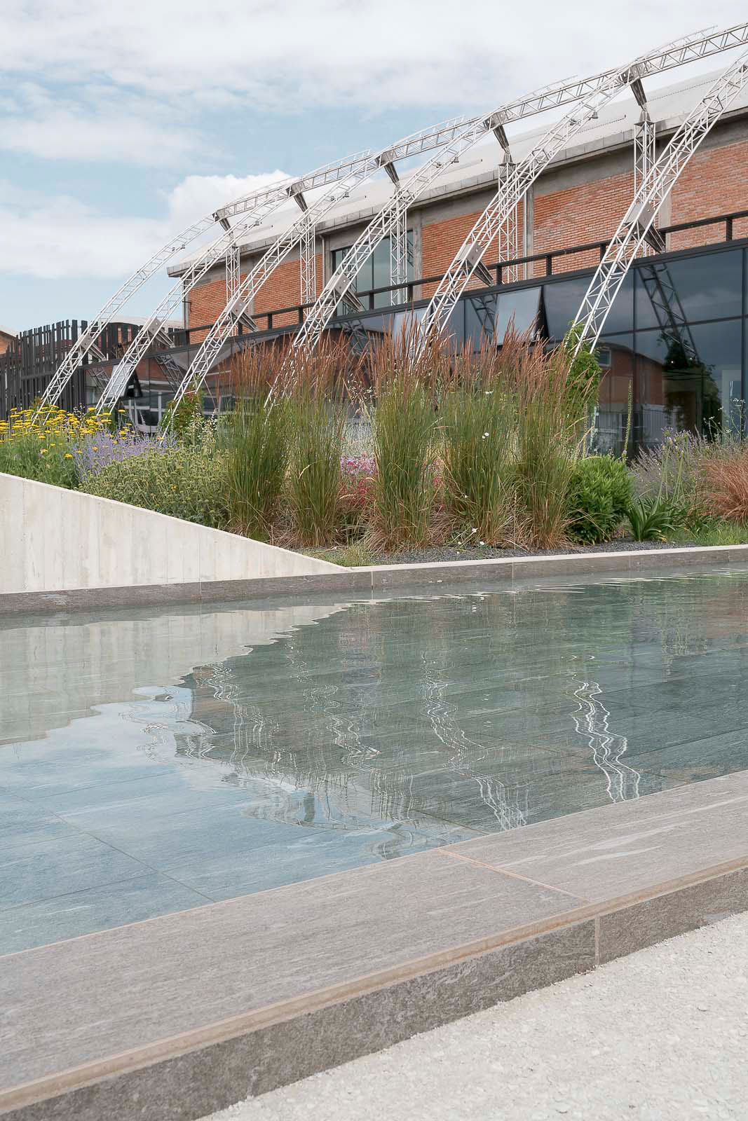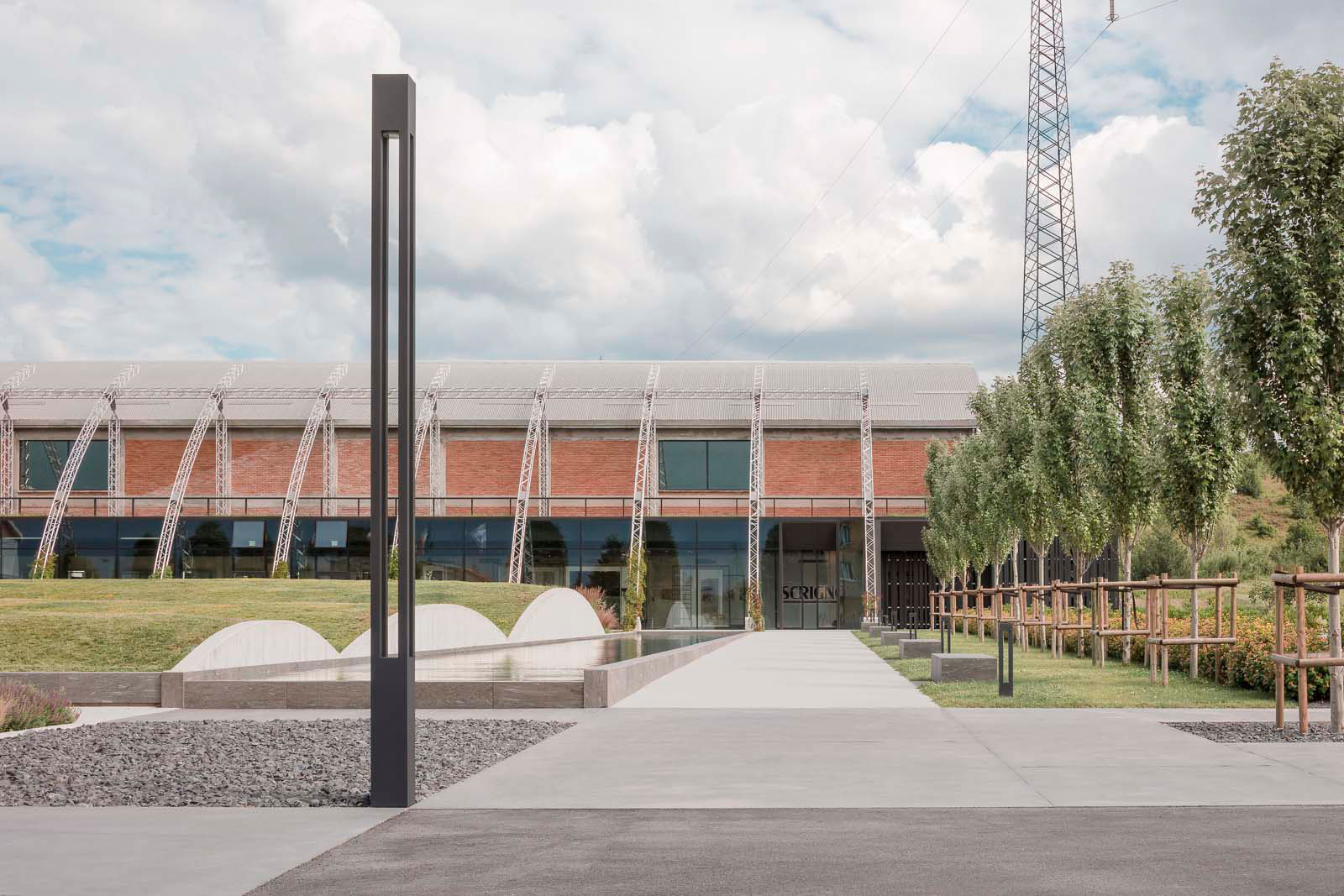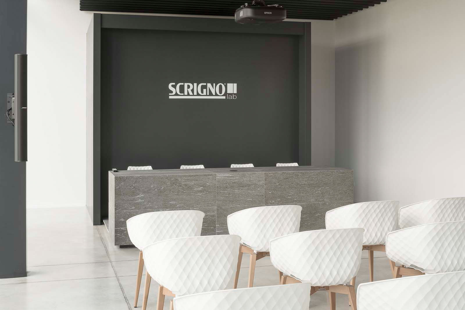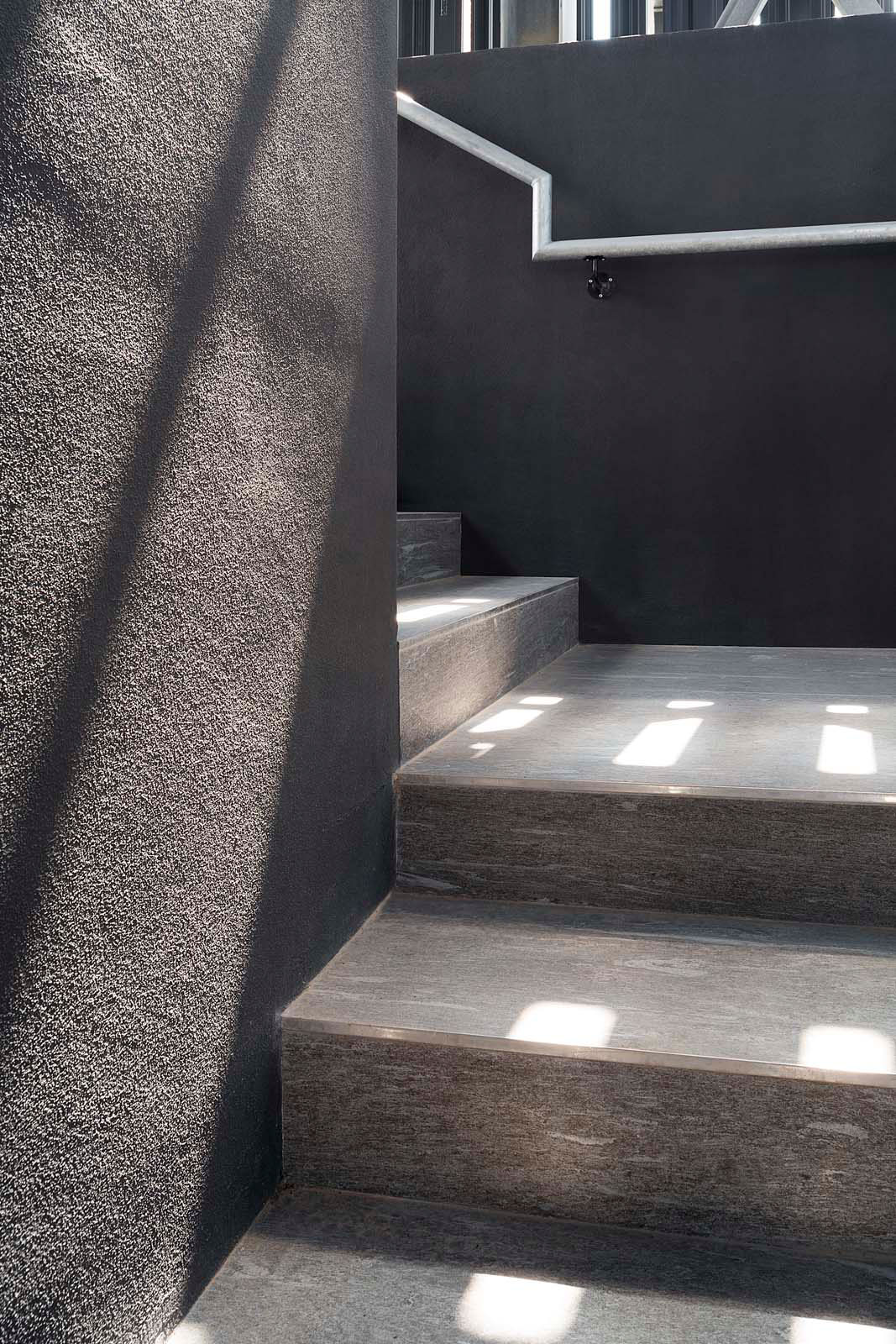 Scrigno, a manufacturer of counterframes for retractable sliding doors and windows, entrusted the redevelopment of its headquarters to architectural firms Pampa and Giacobbi Venturini Ferrini. The new design of the headquarters, located in Santarcangelo di Romagna in the province of Rimini, entailed the creation of Scrigno Lab, a dynamic space that includes the showroom and the rooms for conferences and company training. The exterior area was also renovated: the large paved square was transformed into a leafy area that forms the nucleus between the company’s various buildings (offices, warehouses and production facilities). For the panoramic terrace, the designers opted for a raised floor with 40x120 cm Mystone Pietra di Vals Antracite stone-effect porcelain stoneware with a thickness of 20 mm, while 60x120 cm Mystone Pietra di Vals Antracite was chosen for the walkways in the square. In addition to the walkways, Mystone Pietra di Vals was also used for the seats, the garden’s ornamental water feature, the desk in the conference room and the showroom.