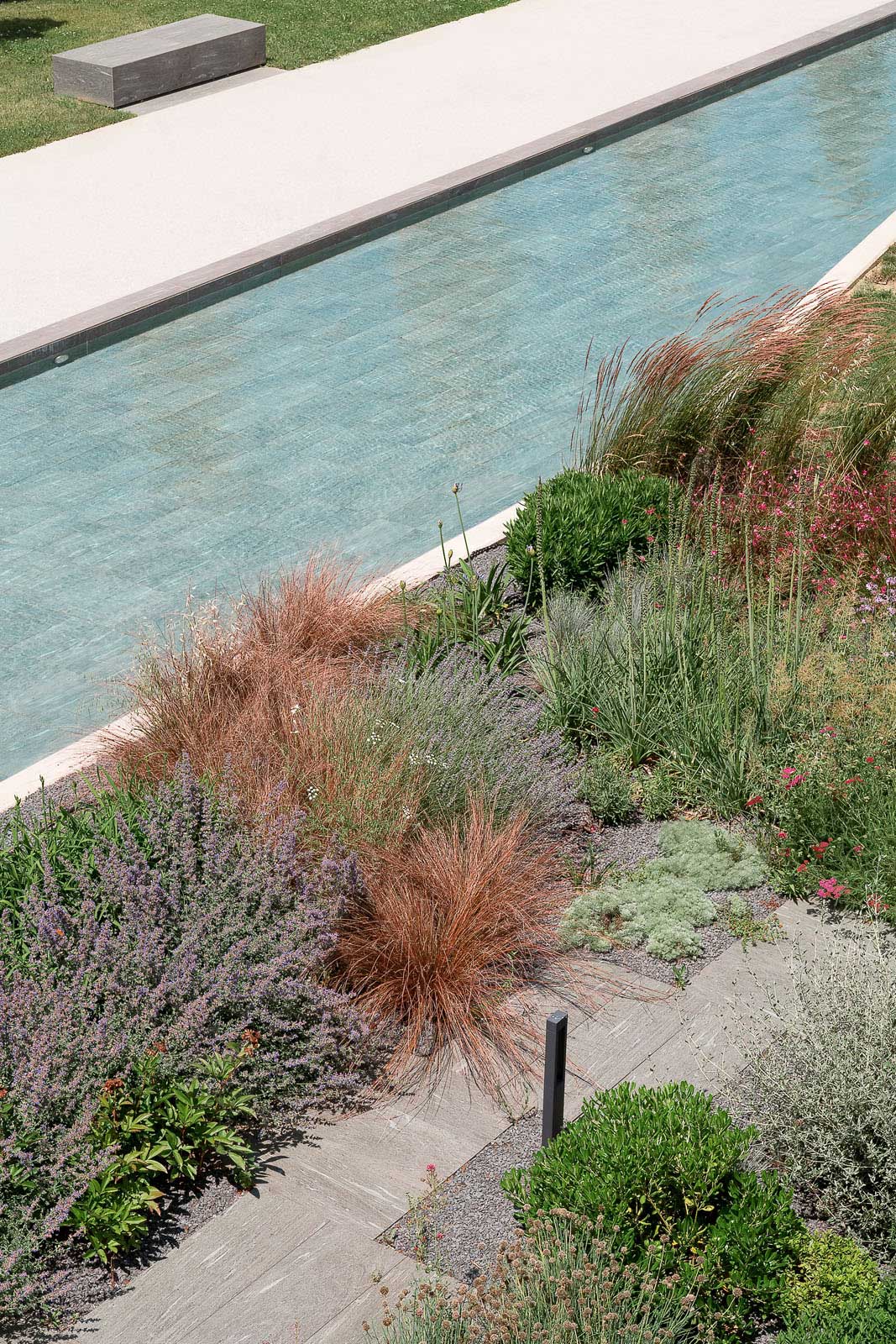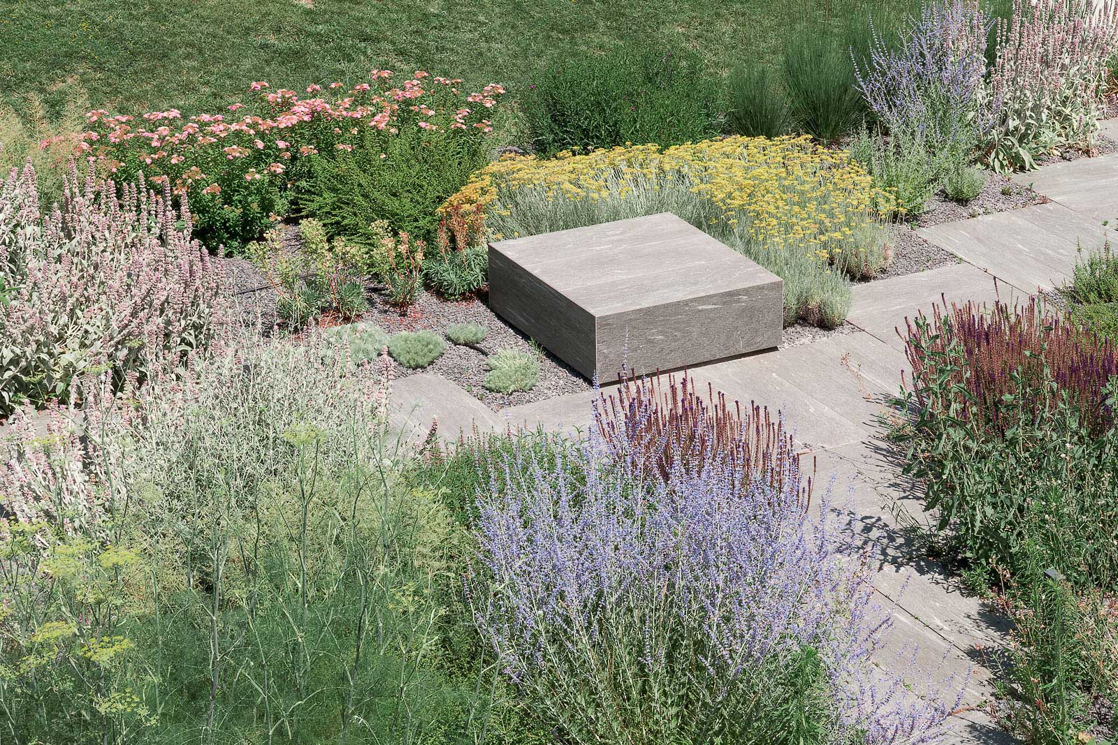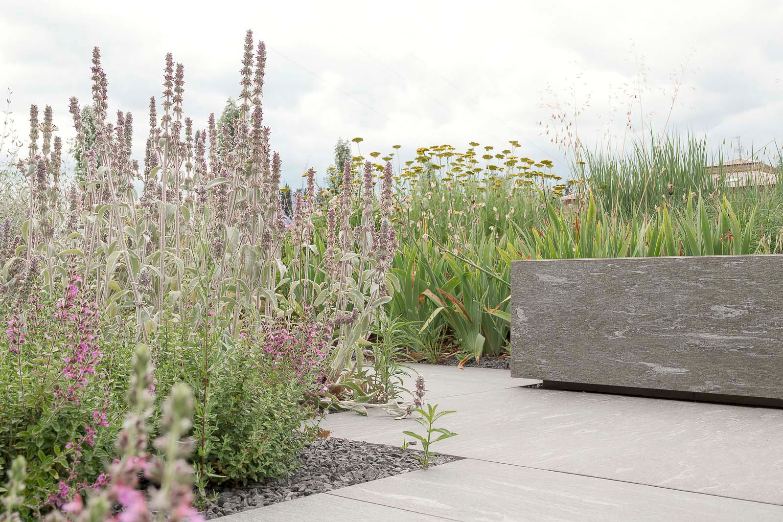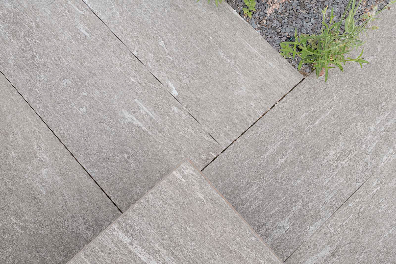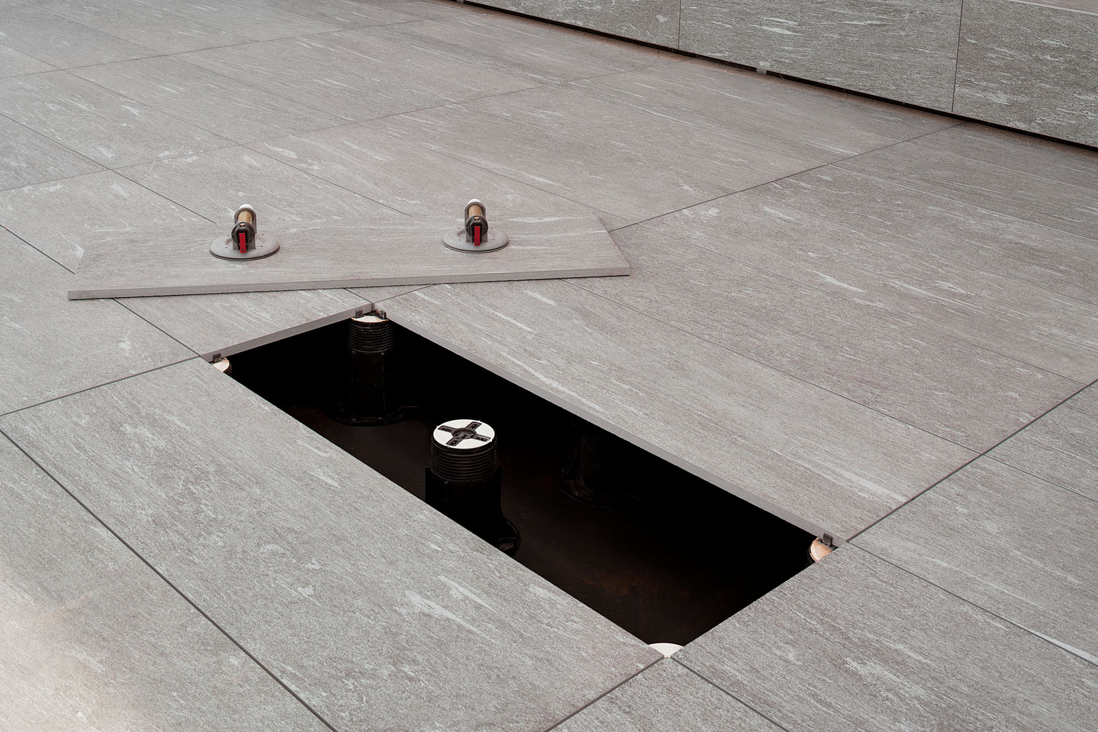 Scrigno, a manufacturer of counterframes for retractable sliding doors and windows, entrusted the redevelopment of its headquarters to architectural firms Pampa and Giacobbi Venturini Ferrini. The new design of the headquarters, located in Santarcangelo di Romagna in the province of Rimini, entailed the creation of Scrigno Lab, a dynamic space that includes the showroom and the rooms for conferences and company training. The exterior area was also renovated: the large paved square was transformed into a leafy area that forms the nucleus between the company’s various buildings (offices, warehouses and production facilities). For the panoramic terrace, the designers opted for a raised floor with 40x120 cm Mystone Pietra di Vals Antracite stone-effect porcelain stoneware with a thickness of 20 mm, while 60x120 cm Mystone Pietra di Vals Antracite was chosen for the walkways in the square. In addition to the walkways, Mystone Pietra di Vals was also used for the seats, the garden’s ornamental water feature, the desk in the conference room and the showroom.