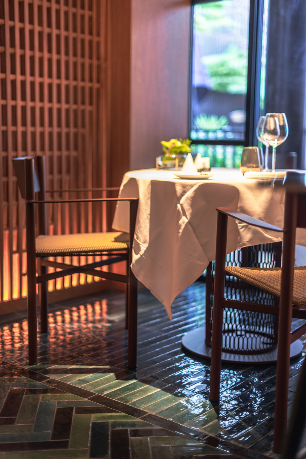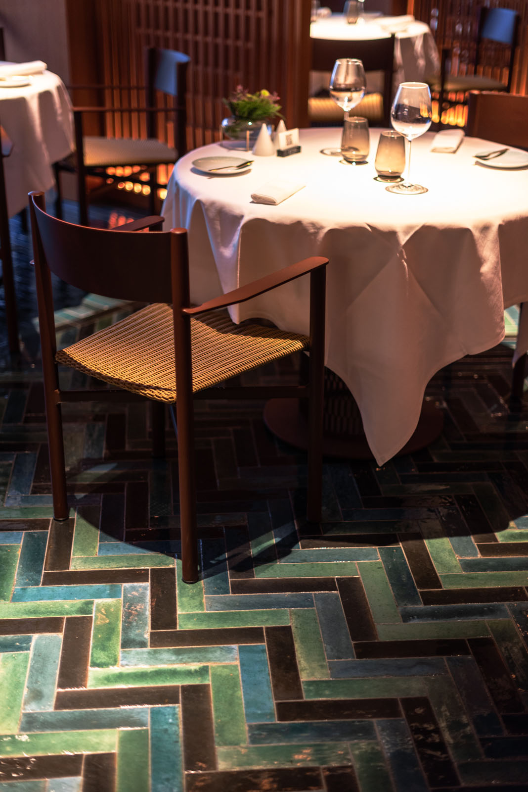 On entering the restaurant’s dining room, the most eye-catching feature is certainly the floor, installed in a masterly combination of colour and light. Crogiolo Lume porcelain stoneware tiles, in 6x24 cm size, installed in a herringbone pattern with an alternation of the Green, Blue and Black shades, create the impression of a fabric, as their surfaces generate brilliant vibrations of light that bounce off the intentionally flawed surface to provide the “unique situation” Bastir were seeking.