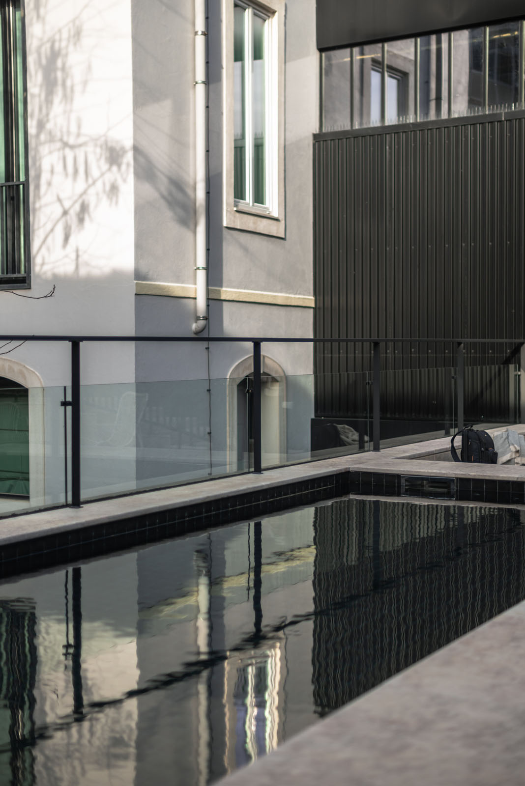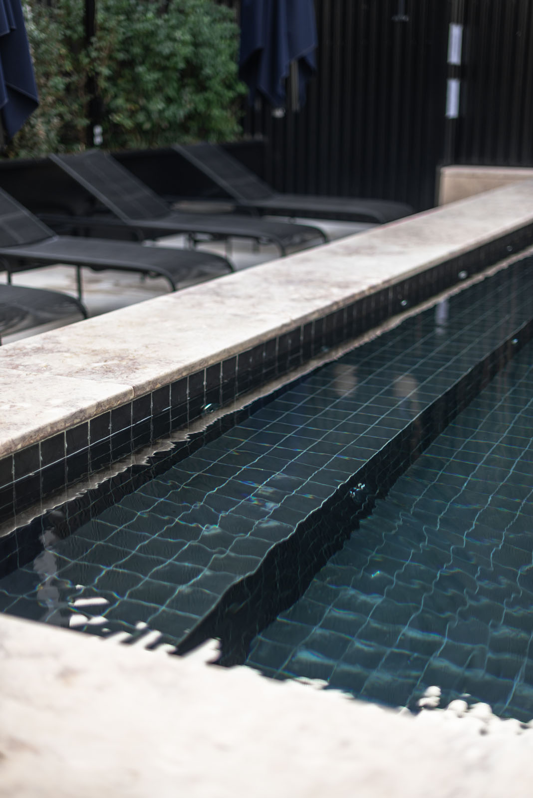 In the heated pool area, to contrast with the slabs of pale limestone, the local stone, the small size ceramic tiles of the Crogiolo Zellige collection are used in Carbone Lux finish to cover the sides and bottom of the pool. A striking, unexpected colour that evokes the deep shade of the waters of the Atlantic Ocean.