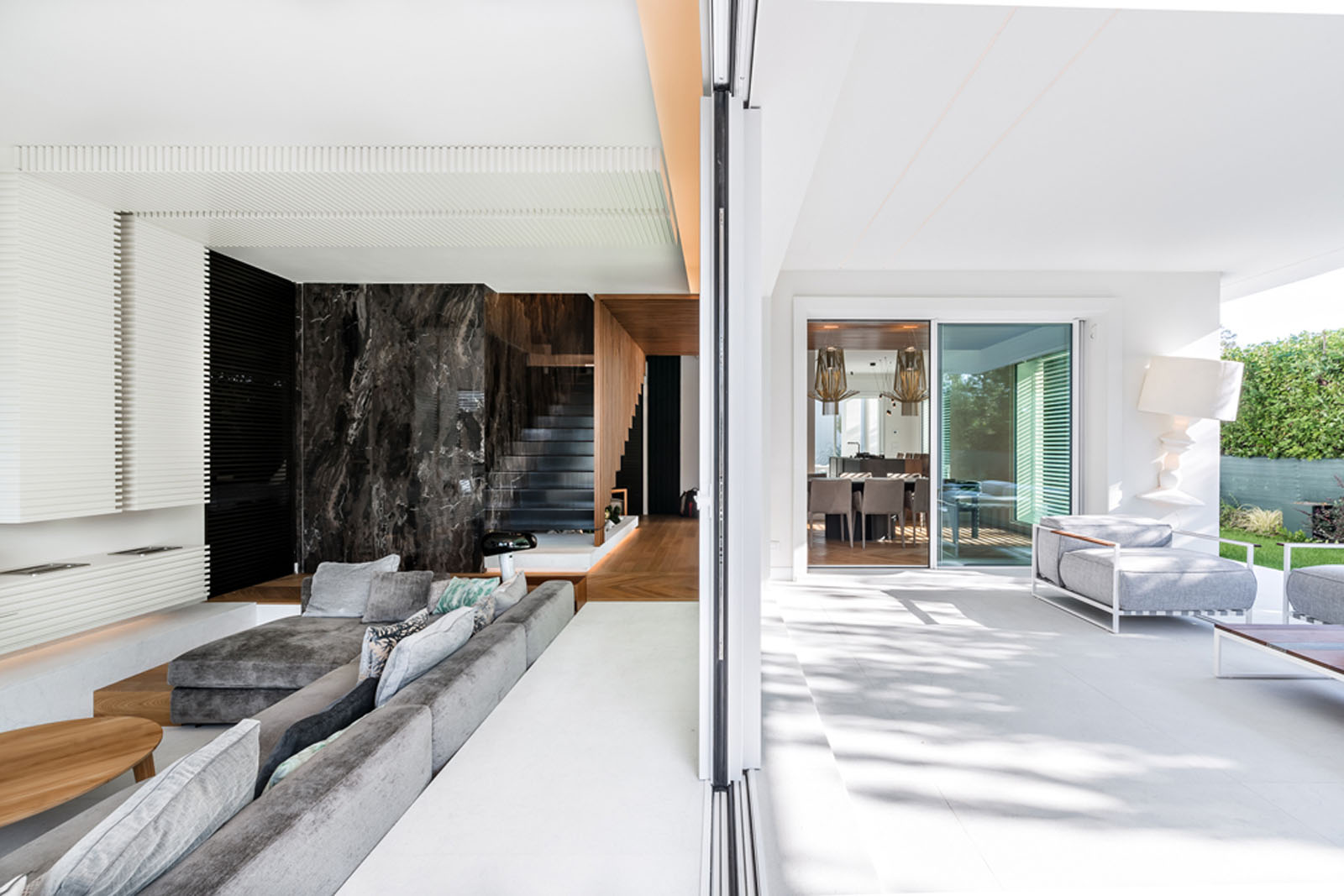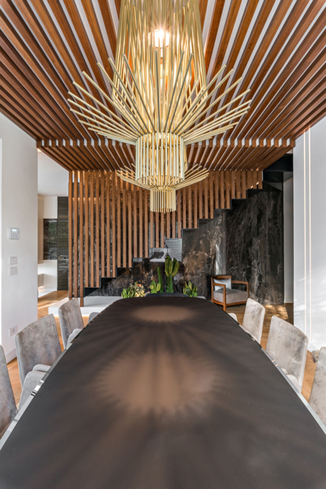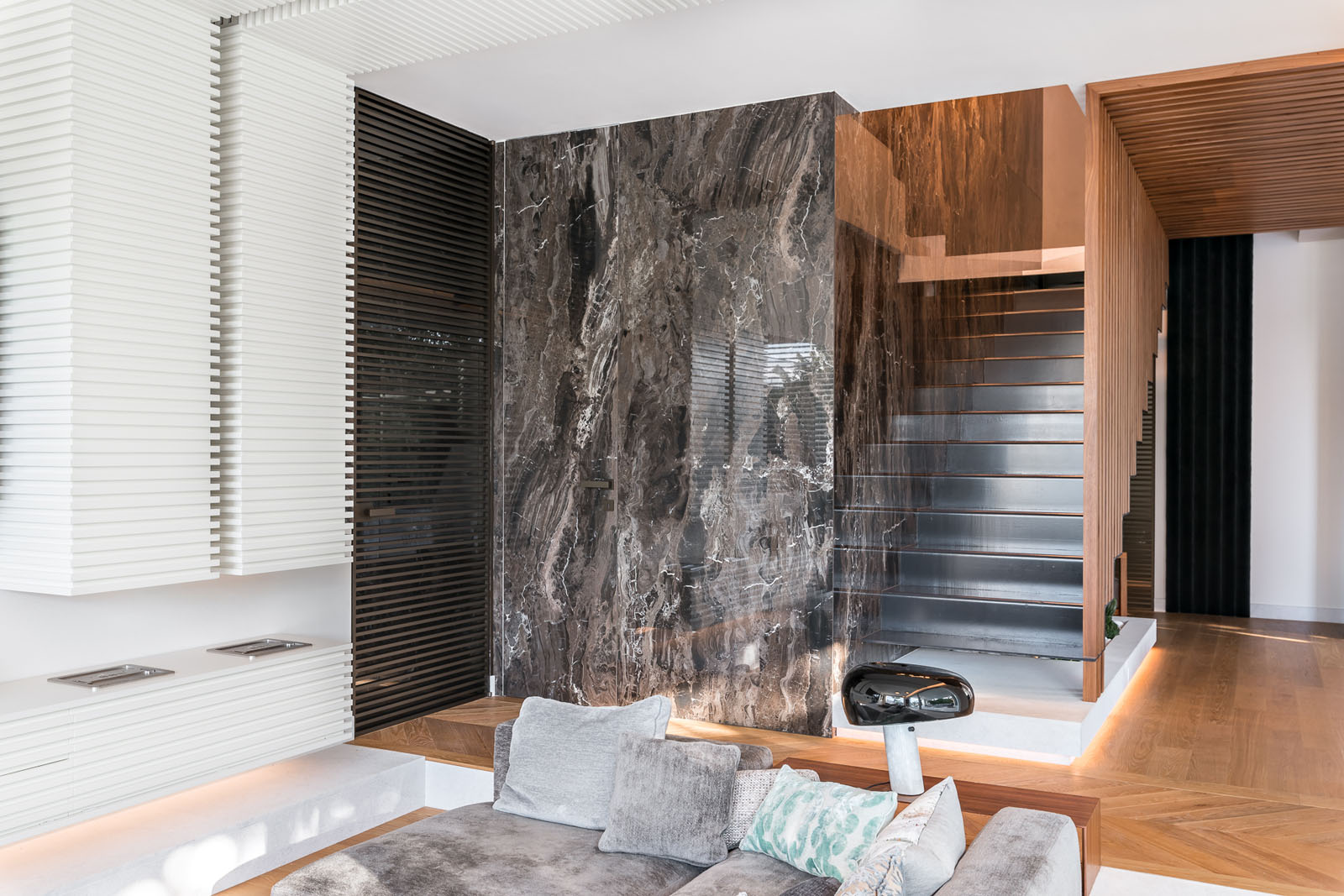 In the living area, Grande Marble Look extra-large slabs, in the Frappuccino texture, are used for the wall covering surrounding the staircase and as a strip on the wall in the sofa area. Marazzi’s innovative digital technology makes it possible to create incredibly realistic replications of marble vein patterns, choosing from 25 variants with a glossy, matt or satin finish, available in different sizes, from 120x120 cm to 160x320 cm, offering impressive seamless solutions. The company’s attention to the environment, extended to the entire production cycle, is guaranteed by the strictest international certifications and contributes to obtaining LEED® credits for sustainable design.