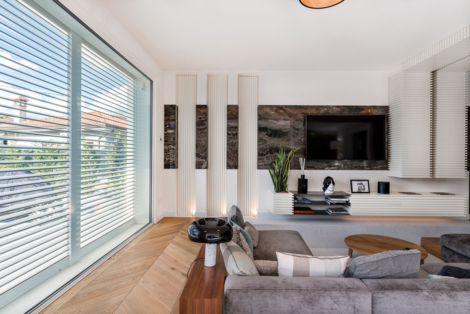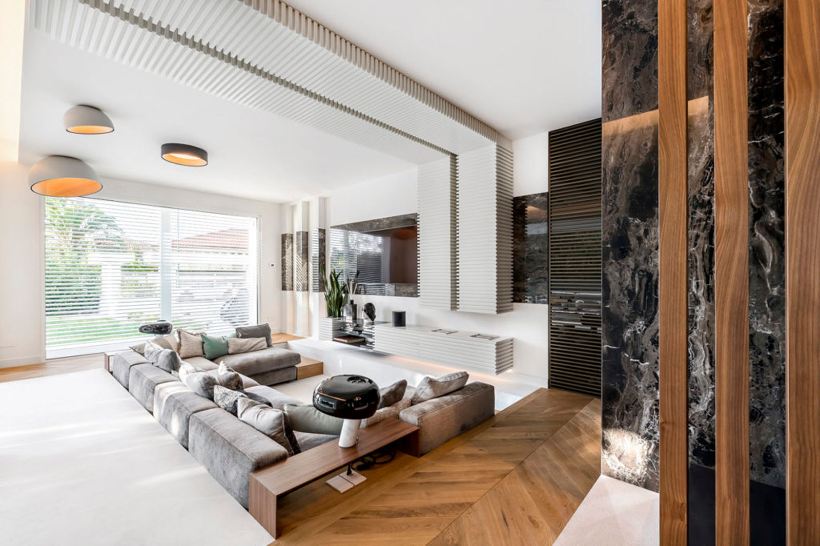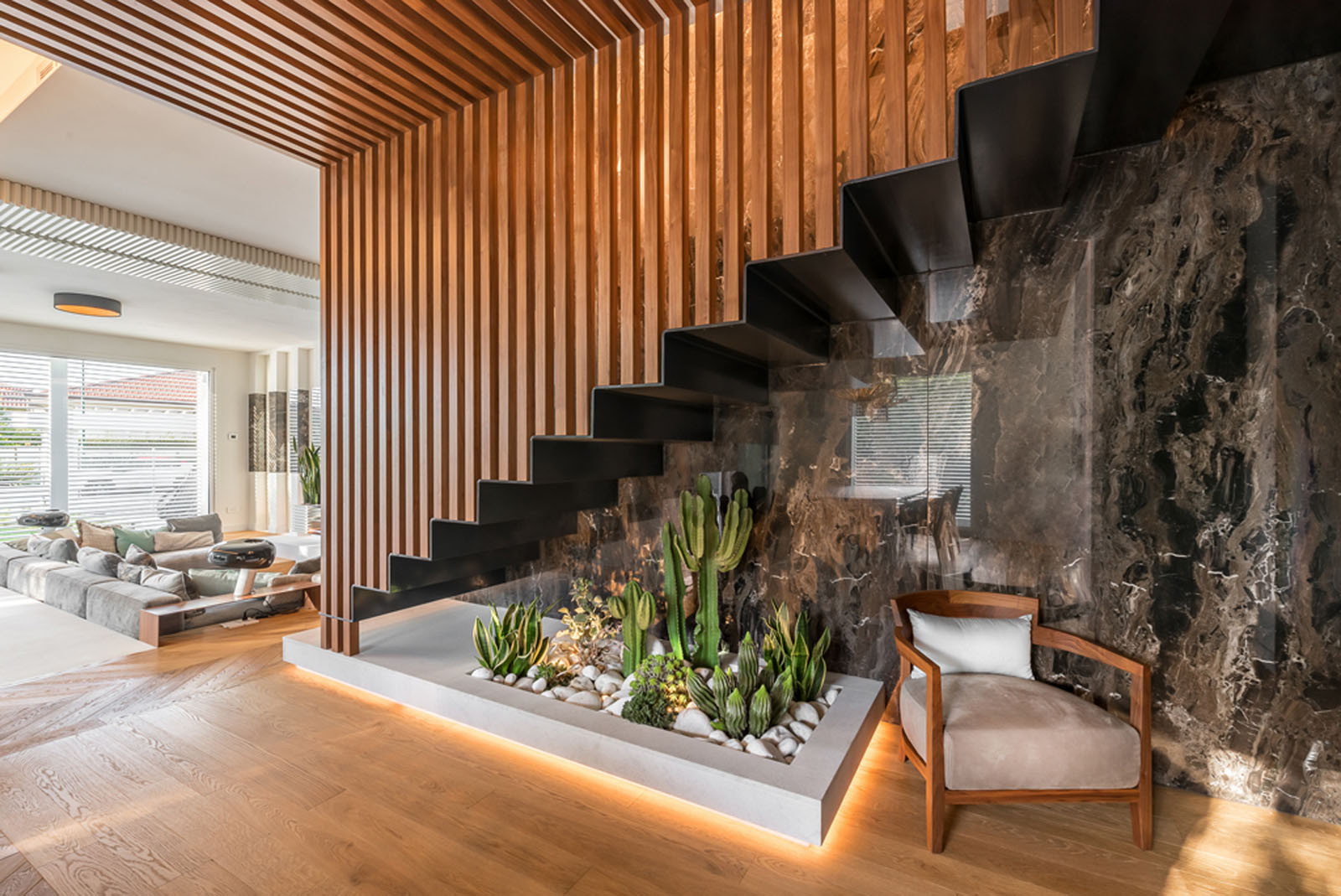 In the living area, Grande Marble Look extra-large slabs, in the Frappuccino texture, are used for the wall covering surrounding the staircase and as a strip on the wall in the sofa area. Marazzi’s innovative digital technology makes it possible to create incredibly realistic replications of marble vein patterns, choosing from 25 variants with a glossy, matt or satin finish, available in different sizes, from 120x120 cm to 160x320 cm, offering impressive seamless solutions. The company’s attention to the environment, extended to the entire production cycle, is guaranteed by the strictest international certifications and contributes to obtaining LEED® credits for sustainable design.