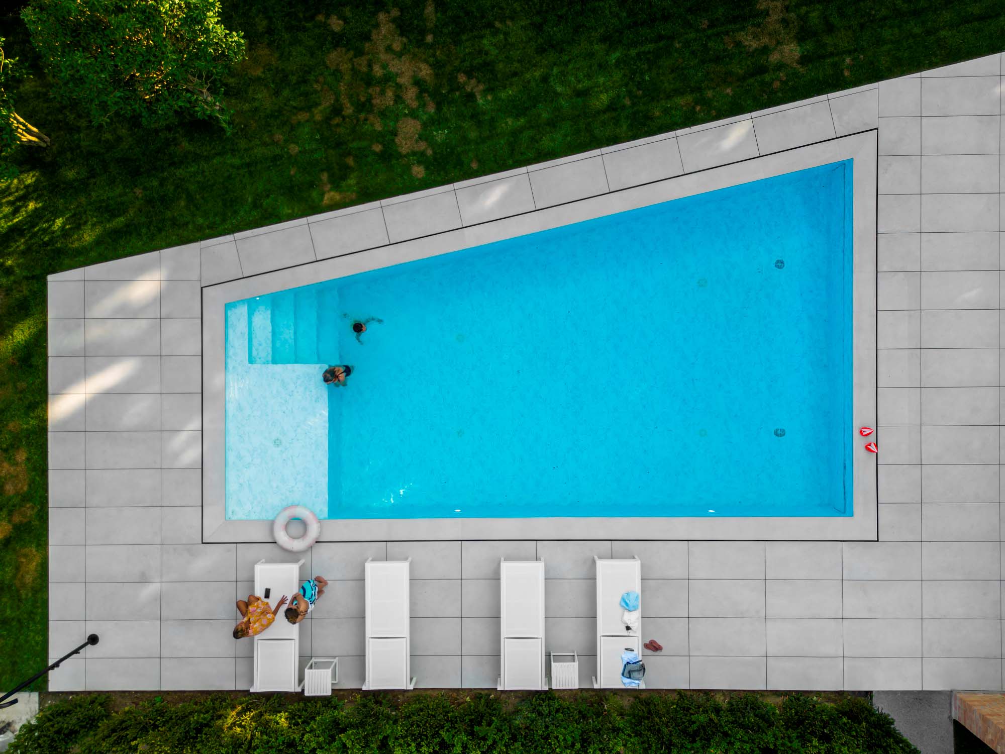 To combine functional performance with stylistic consistency, in partnership with Marazzi the architecture firm designed a floating paving in porcelain stoneware, used seamlessly across the yard, on the terrace and around the pool: the immaculate result underlines the villa’s unusual ground plan. The advantage of a raised floating paving is that it creates a continuous void beneath the surface to accommodate all utility systems, ensuring optimal integration with the surroundings and flexibility in the routing of systems themselves.
