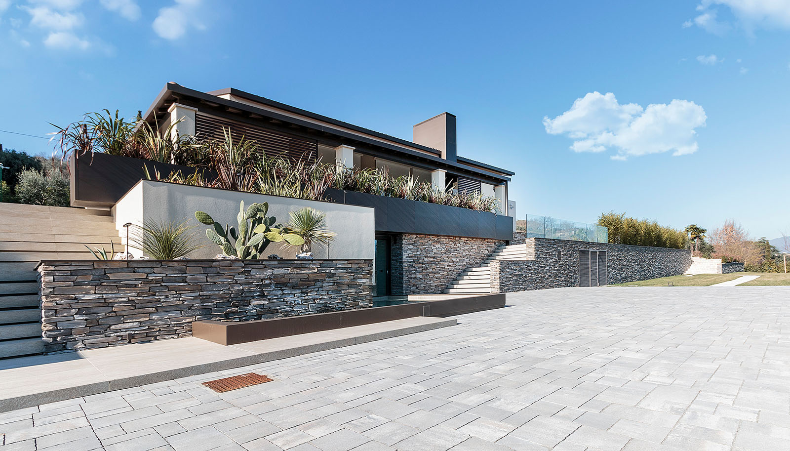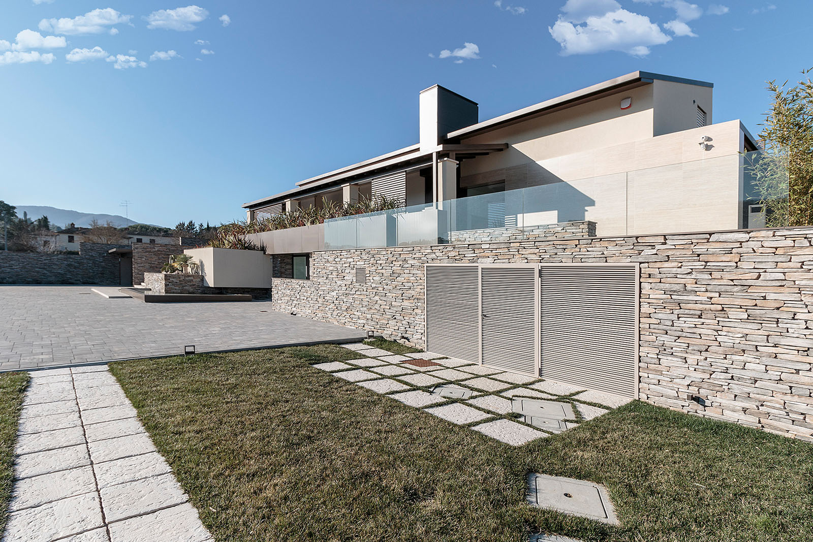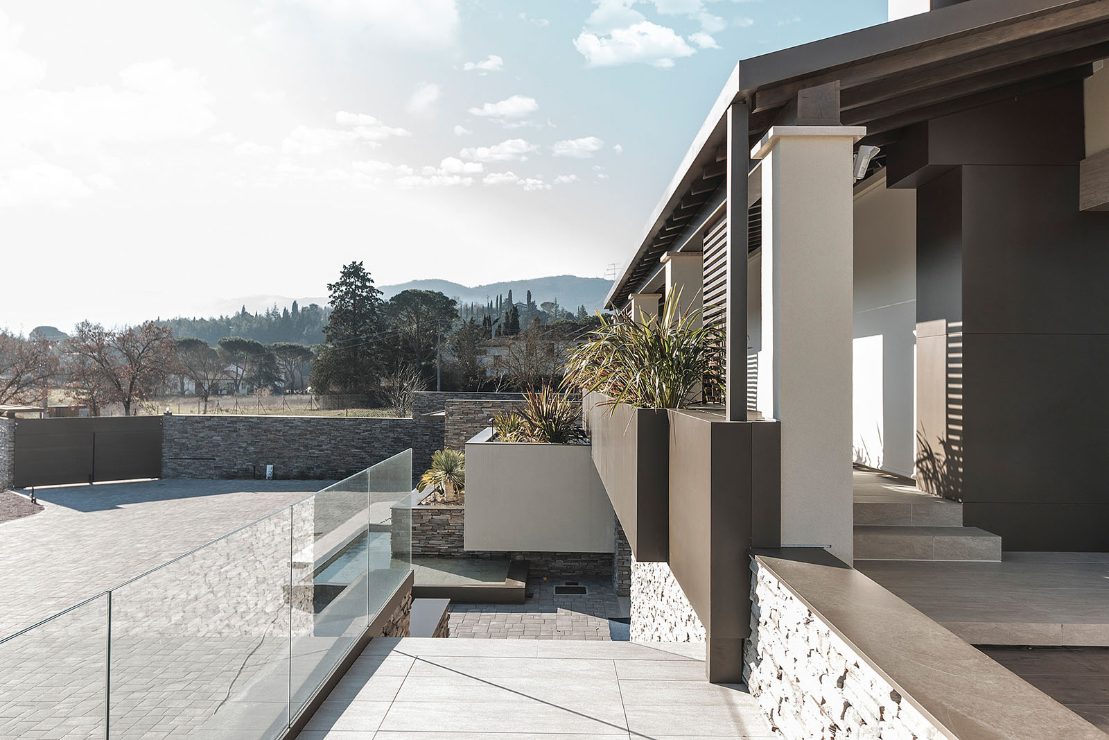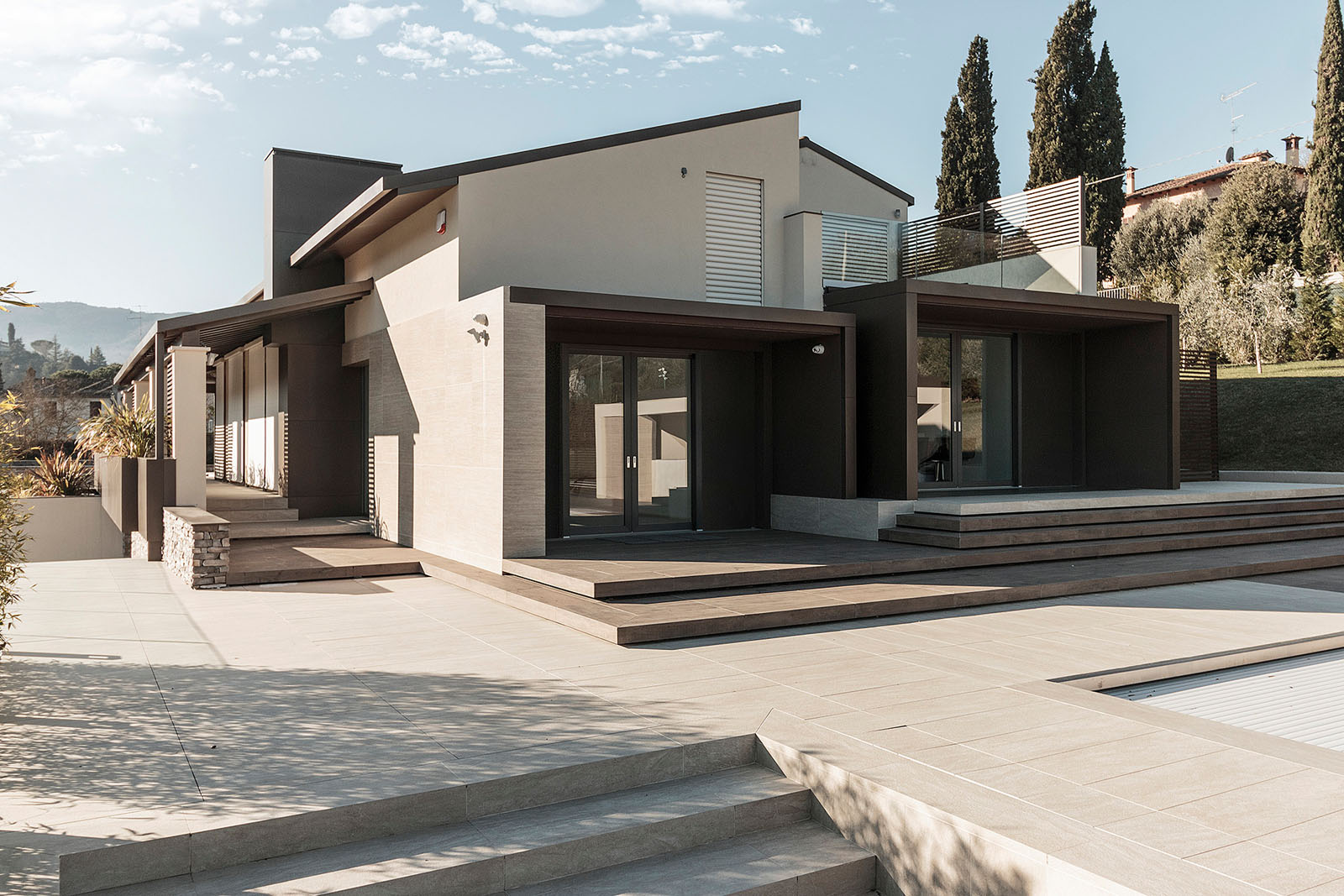 The outdoor areas are finished to a high standard and styled with the aid of the materials used: the Mystone Pietra Italia20 Beige porcelain stoneware collection (size 40x120 cm) is installed on the raised paving system on most of the terraced areas, while the Treverkdear20 wood look in Brown colour (size 20x120 cm) gives a separate identity to the doorways and the areas immediately around the house.