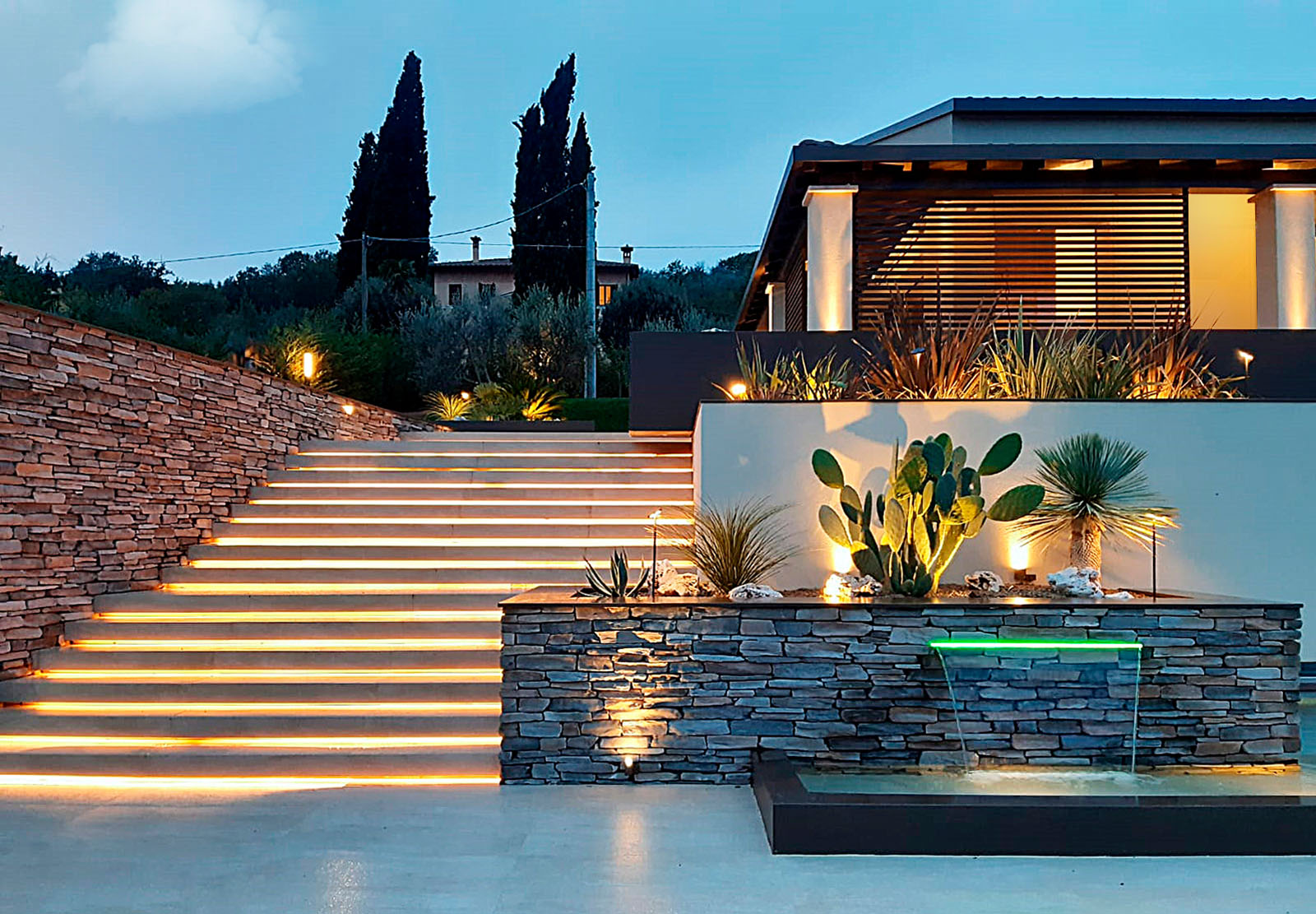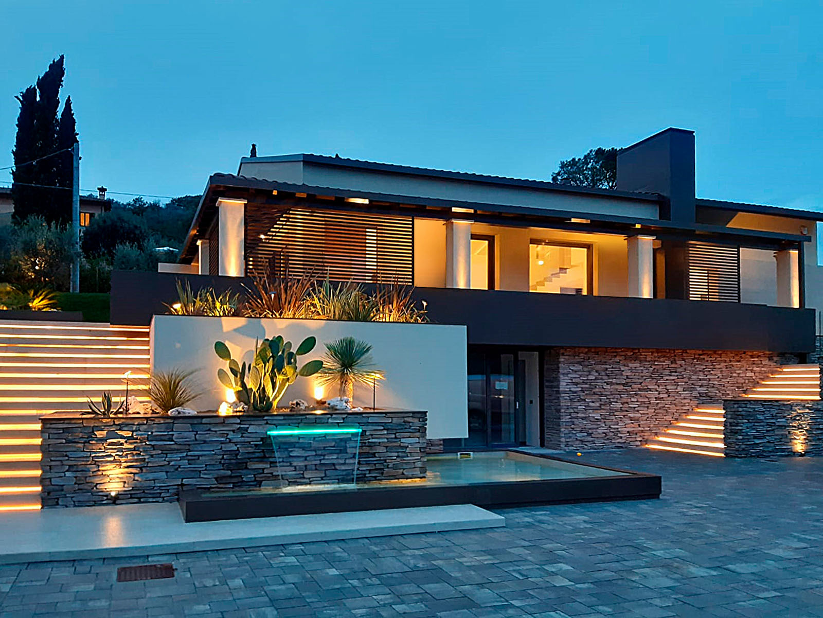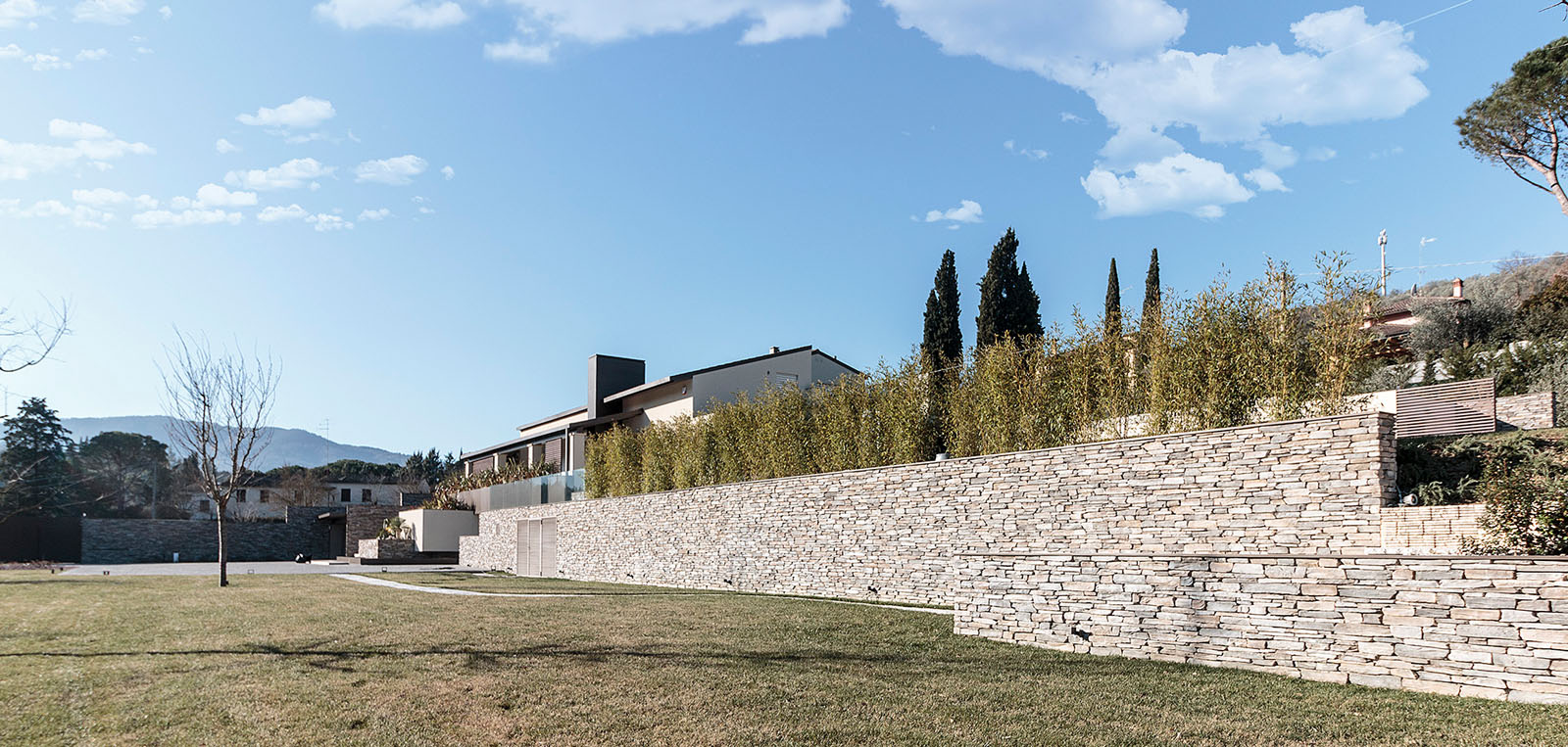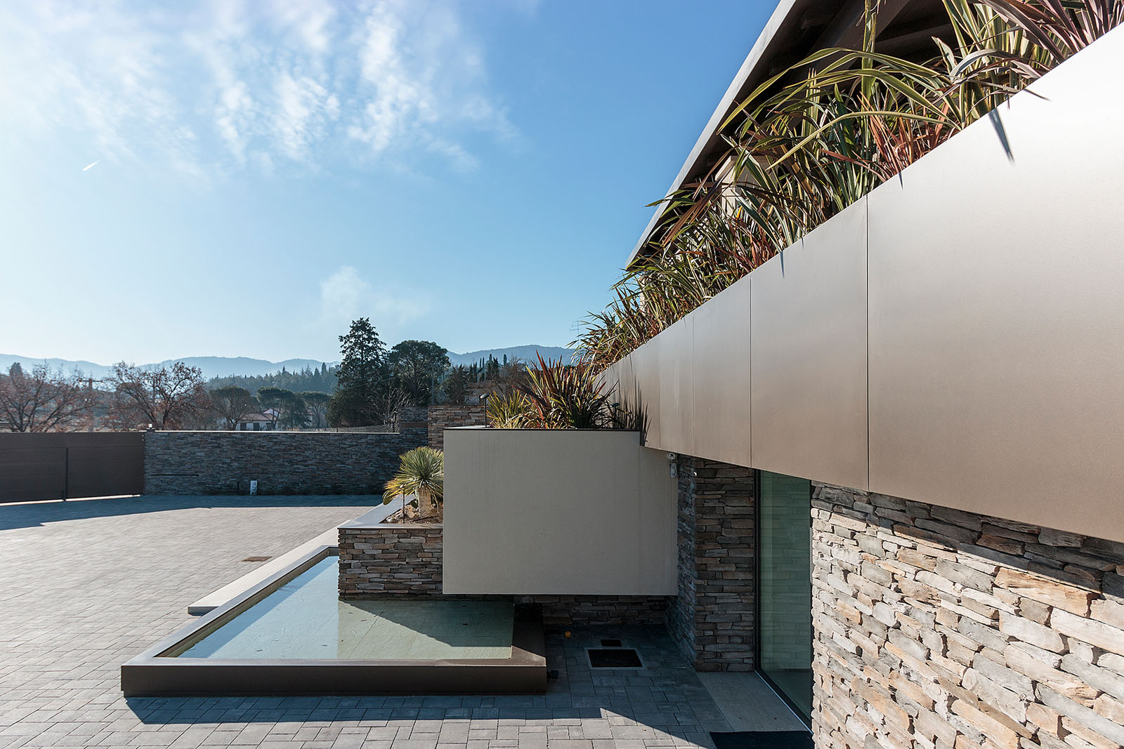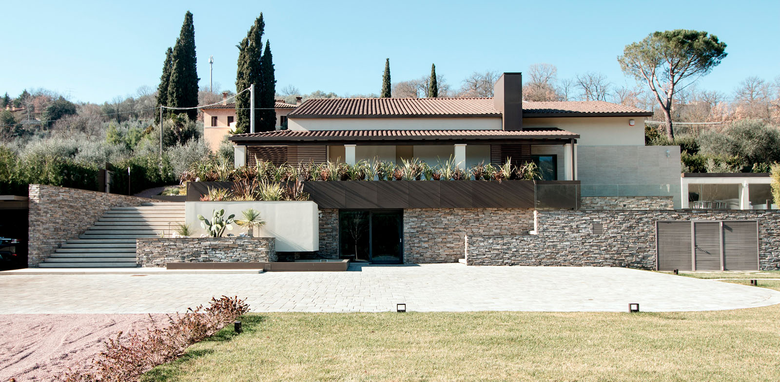 The outdoor areas are finished to a high standard and styled with the aid of the materials used: the Mystone Pietra Italia20 Beige porcelain stoneware collection (size 40x120 cm) is installed on the raised paving system on most of the terraced areas, while the Treverkdear20 wood look in Brown colour (size 20x120 cm) gives a separate identity to the doorways and the areas immediately around the house.