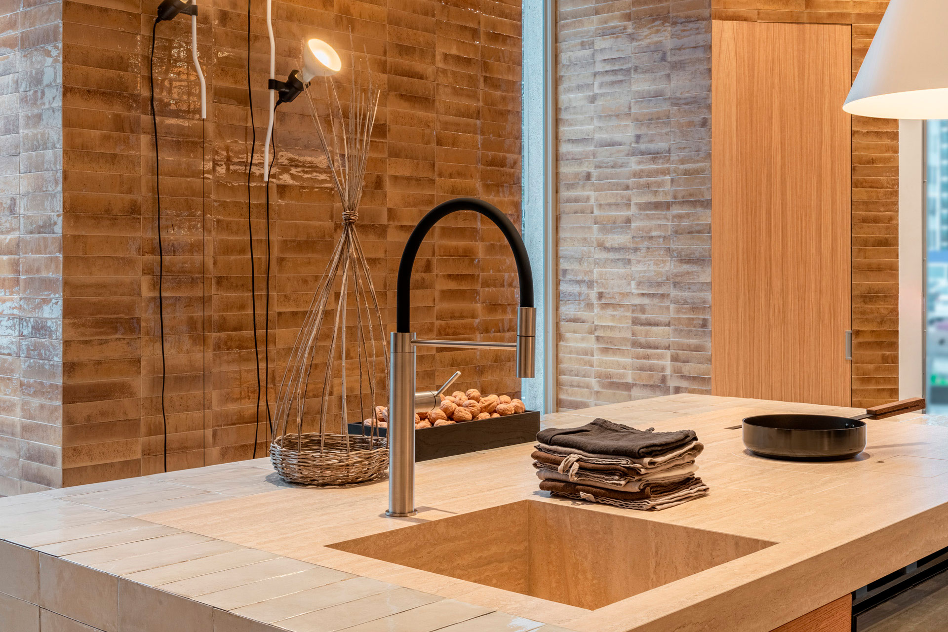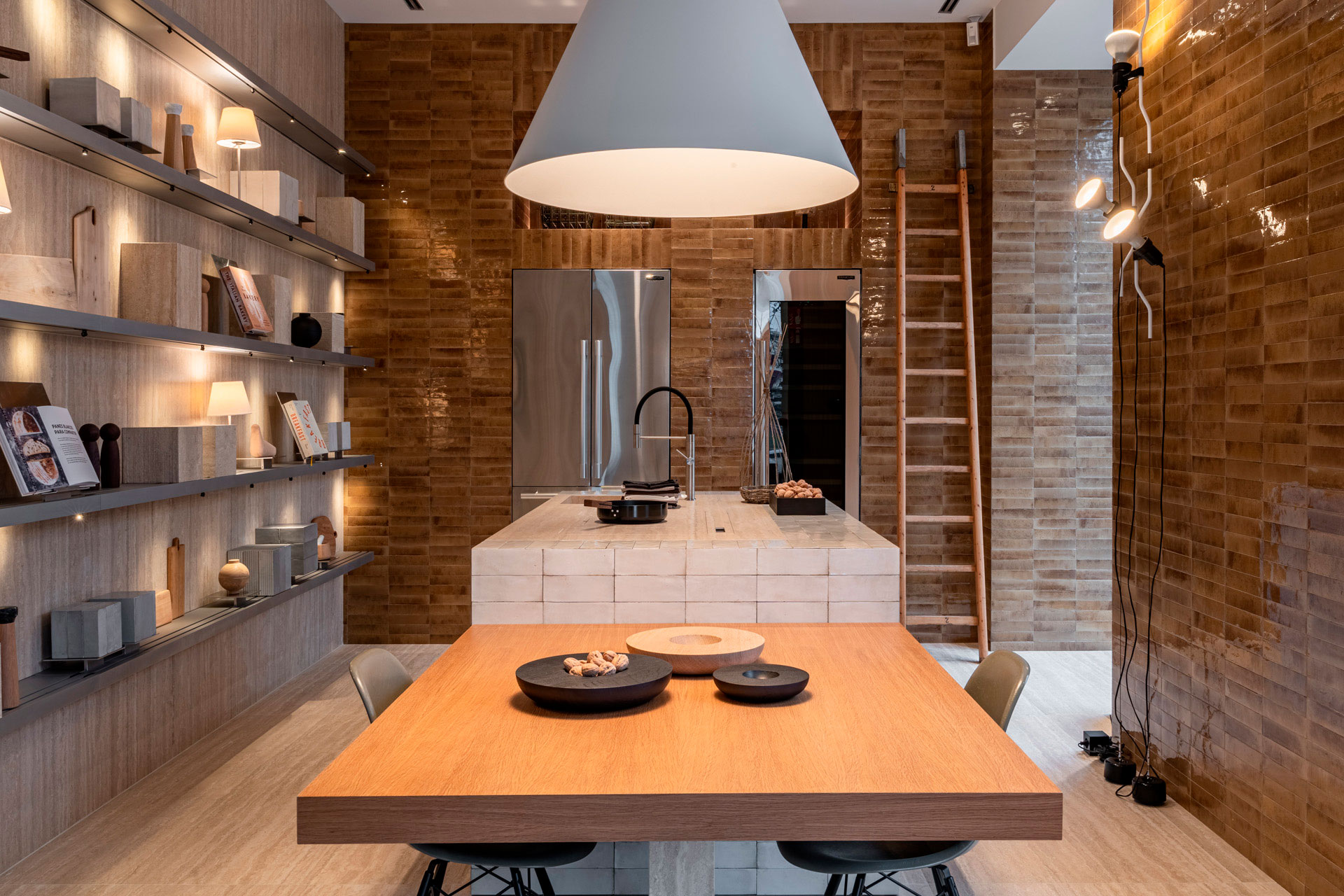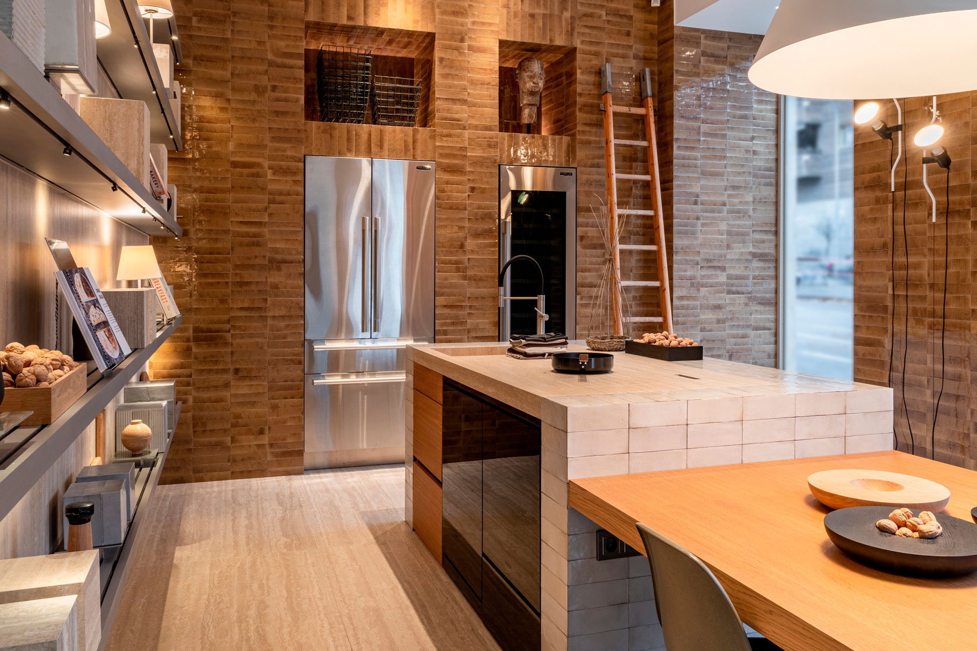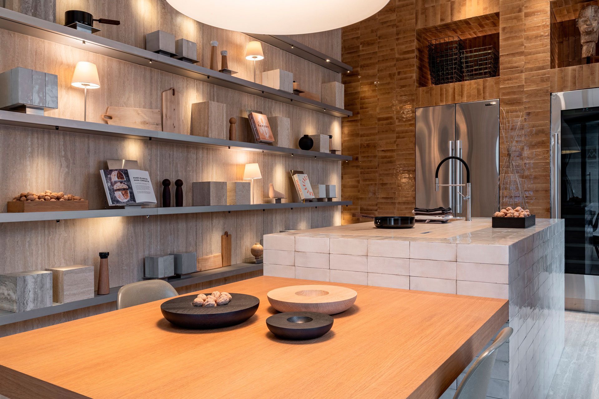 The showroom greets visitors in a hospitable interior, The Welcoming Room, designed in accordance with the Live-In Kitchen concept, in which the compositional versatility of large stoneware slabs and the vibrant gleam of the Crogiolo small-size collections dialogue to connect areas and functions around the kitchen.